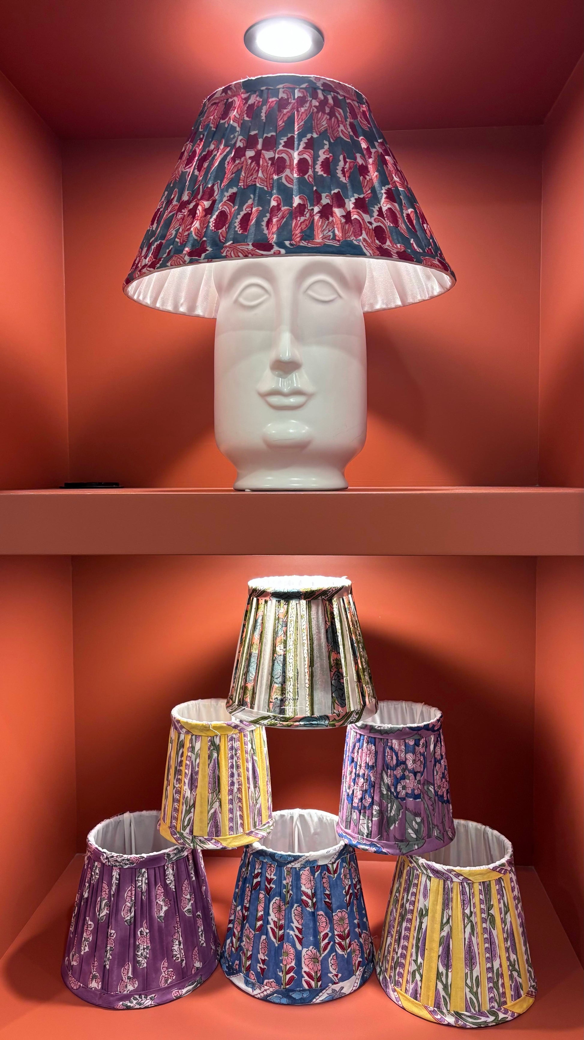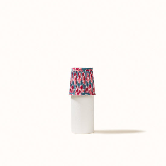 Abat Jour plissé bleu denim imprimé fleurs rose framboise.