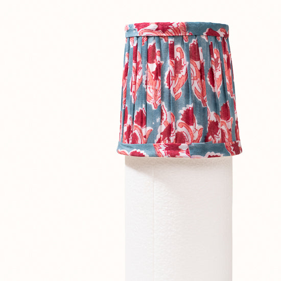 Abat jour en coton plissé bleu denim imprimé fleurs rose framboise.