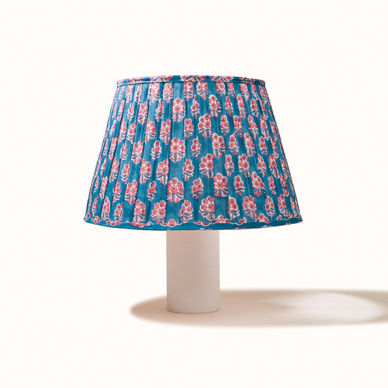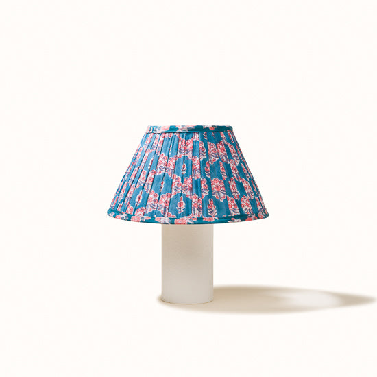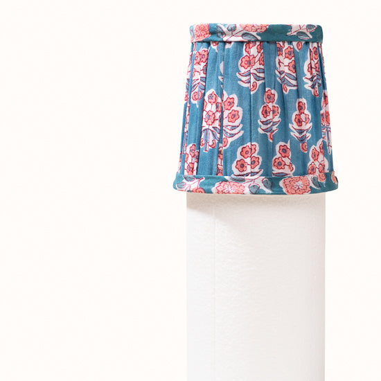 Abat jour en coton plissé bleu denim imprimé fleurs roses.