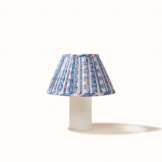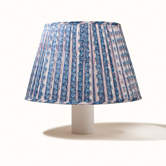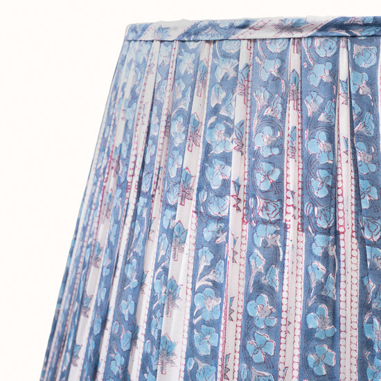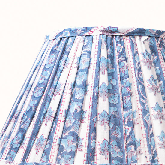 Abat jour en coton plissé bleu et blanc imprimé fleurs bleu turquoise.