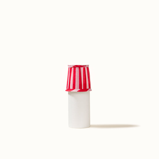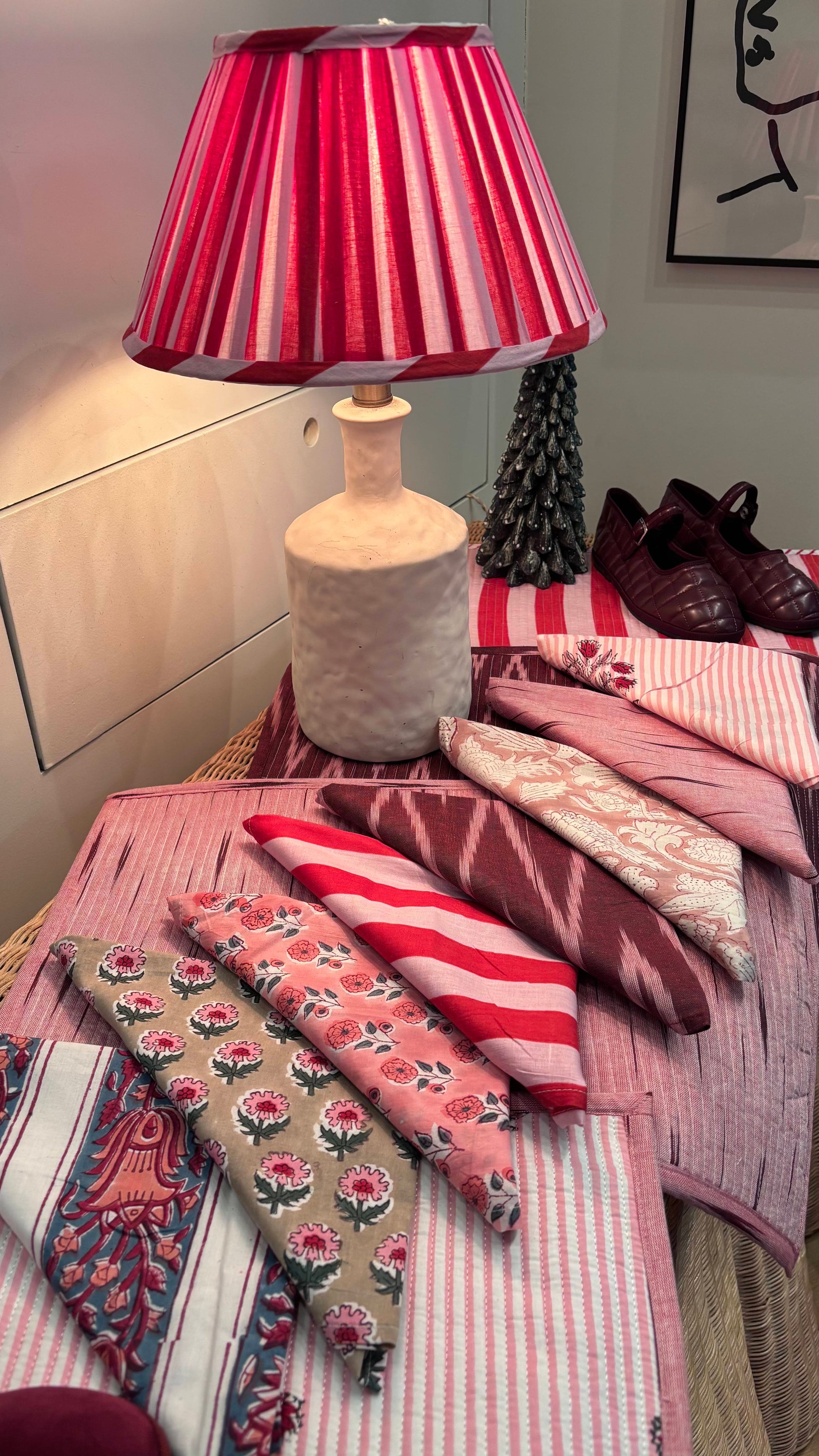 Abat jour en coton plissé rayé rouge et rose pâle.