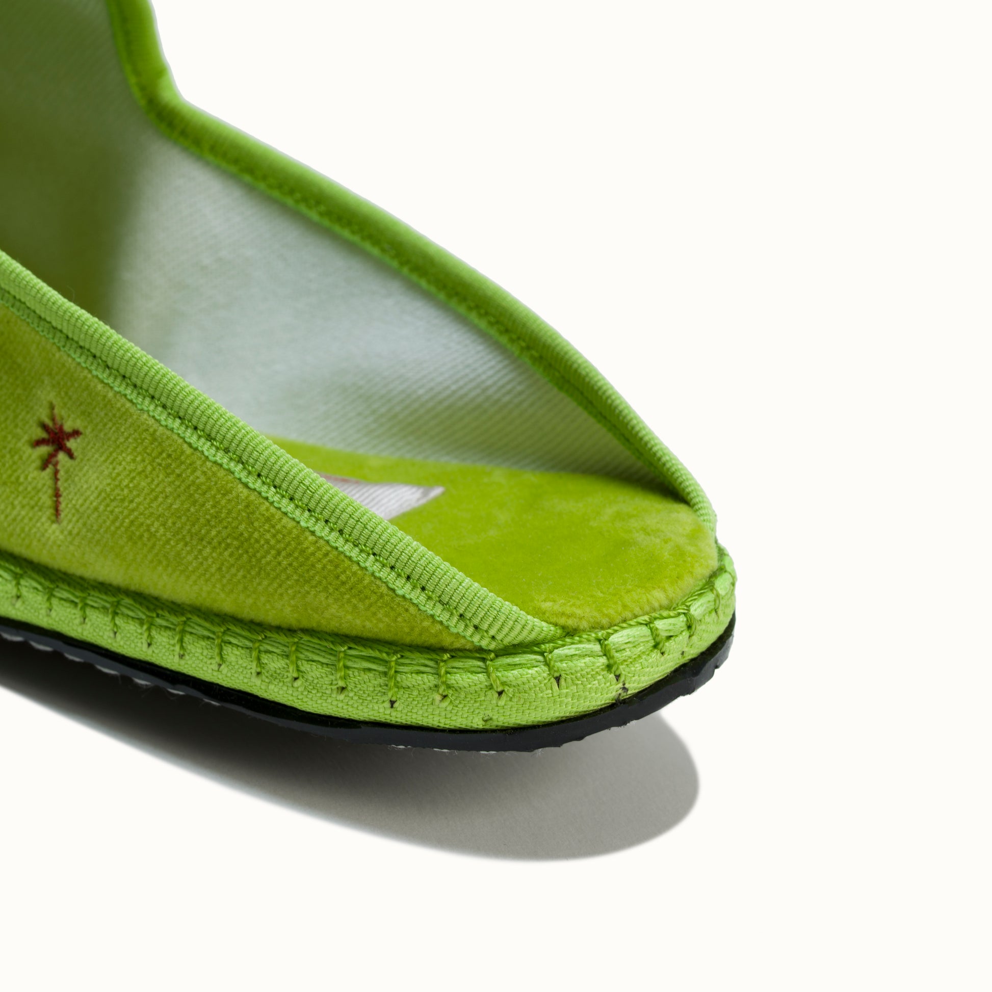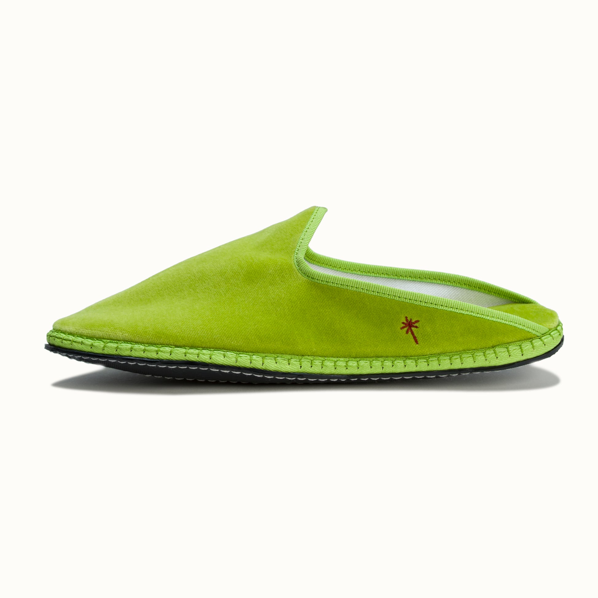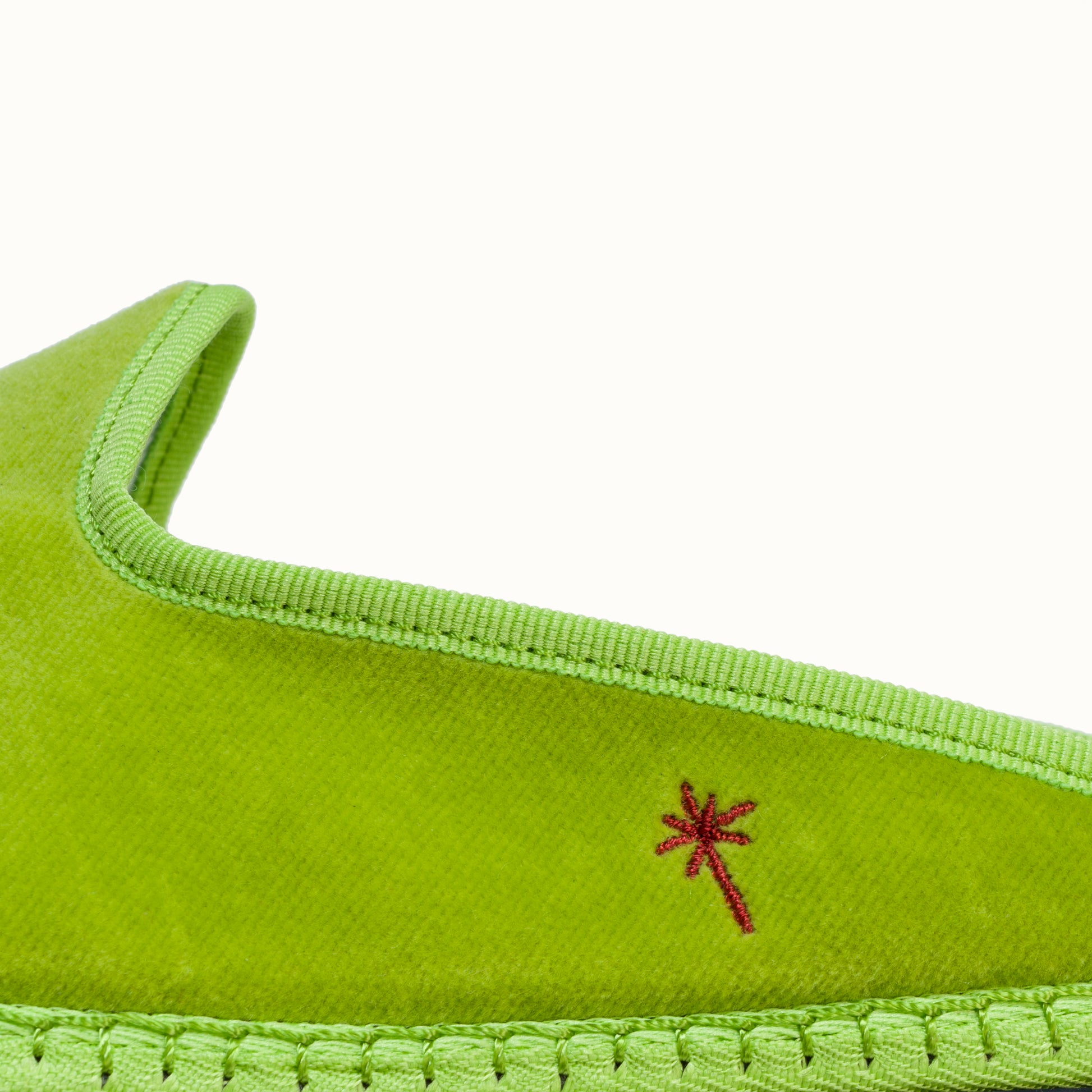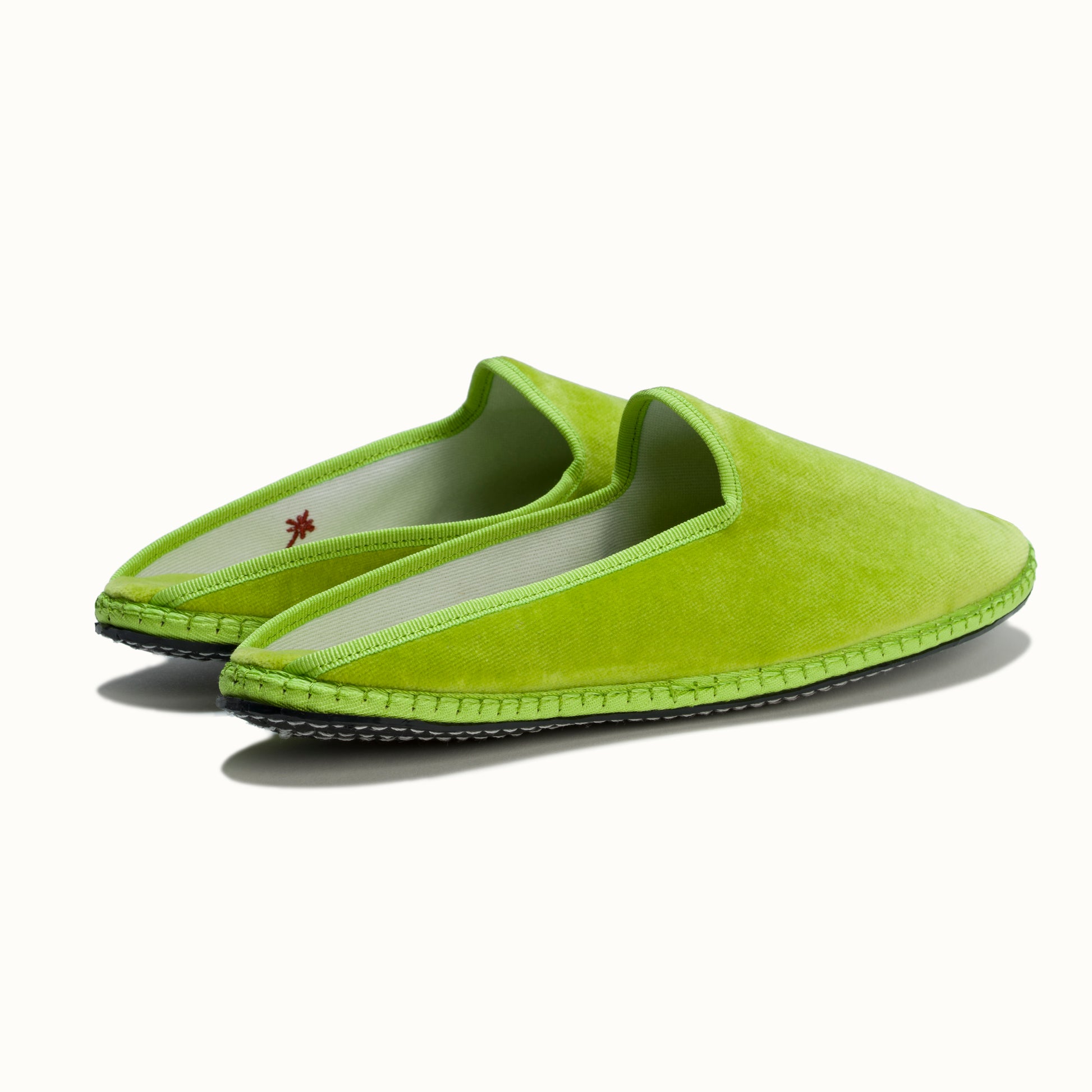 Apple-green velvet slippers with tone-on-tone grosgrain.