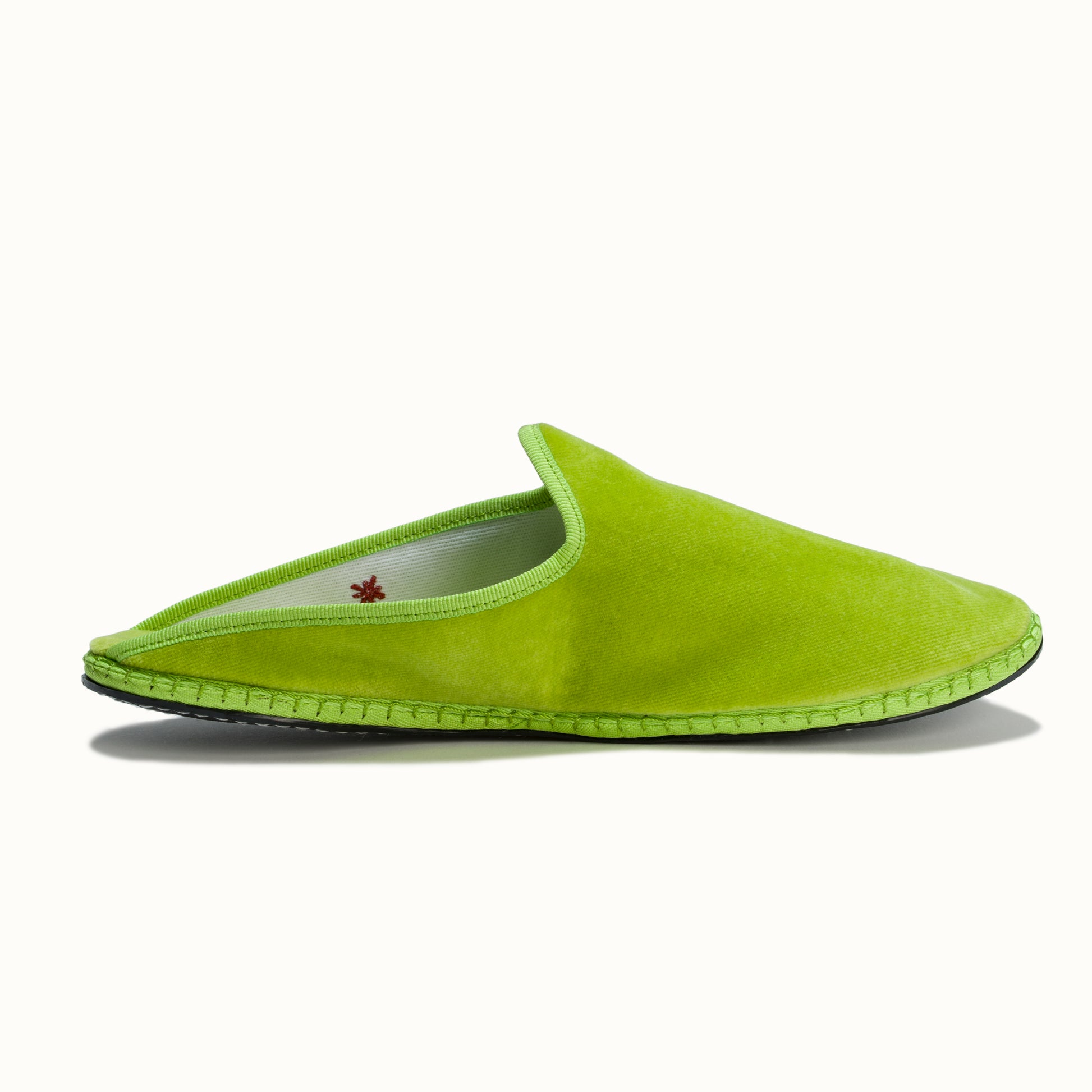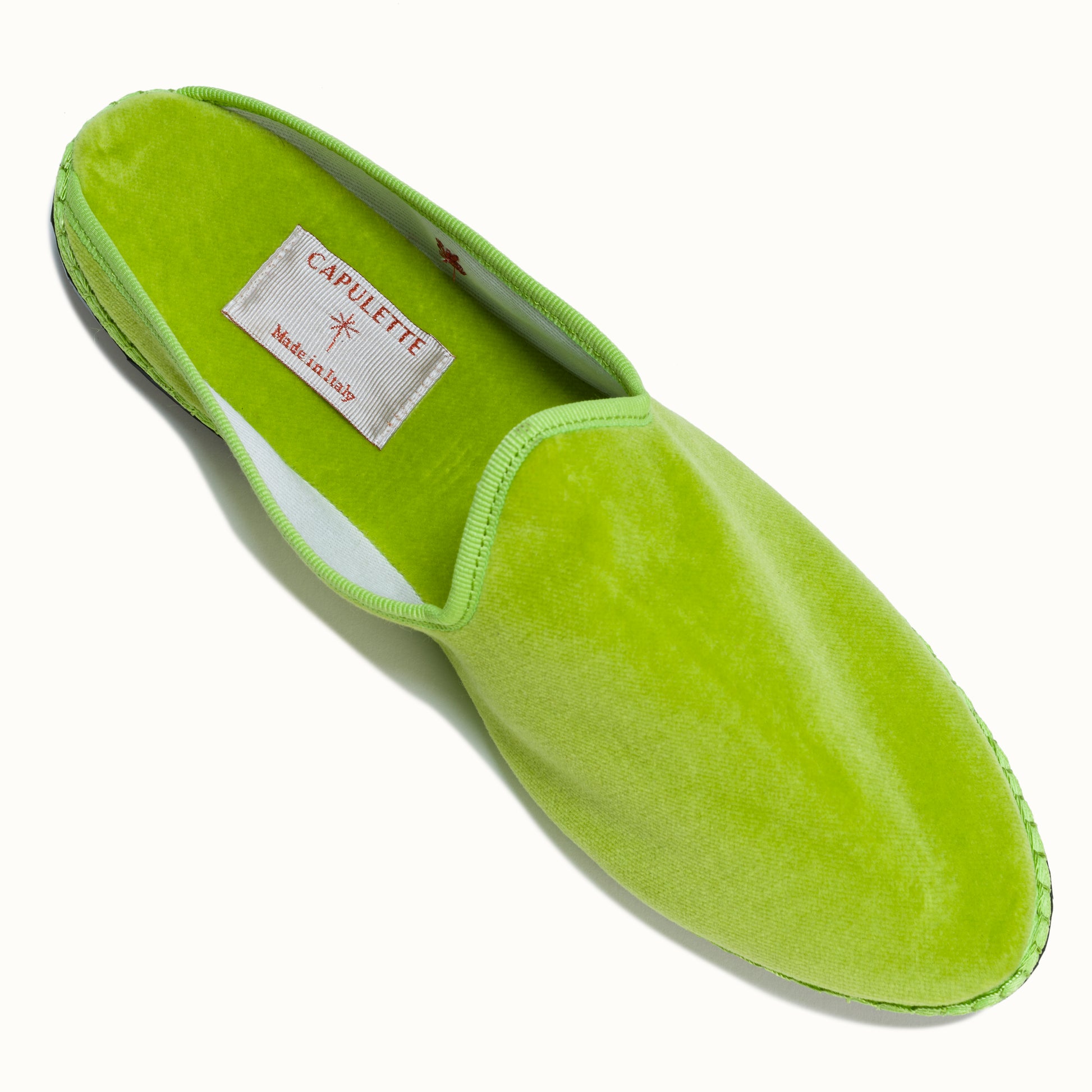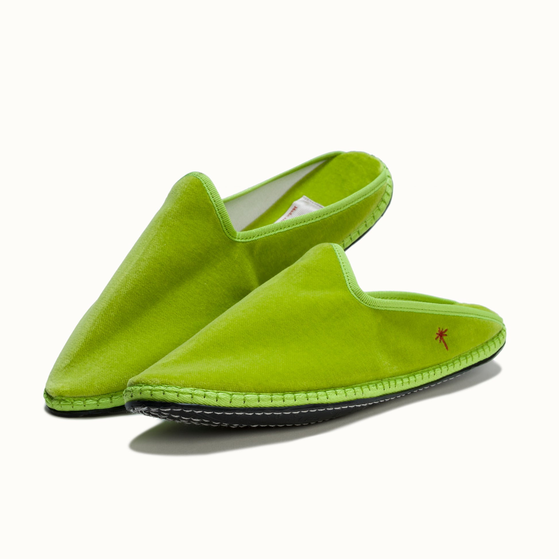 Apple-green velvet slippers with tone-on-tone grosgrain.