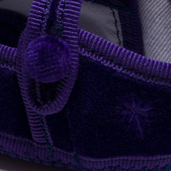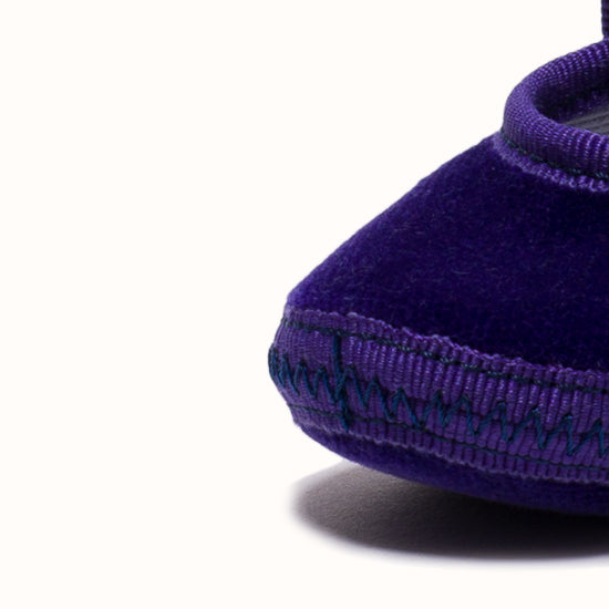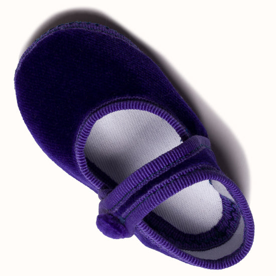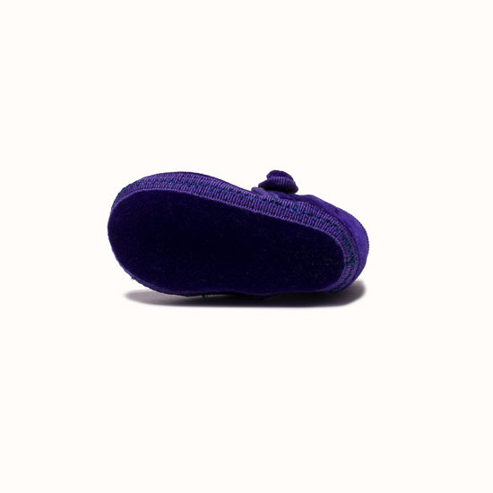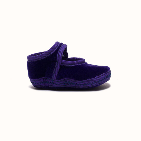 Small purple velvet slippers. Tone on tone grosgrain. Hand-embroidered logo. Soft cotton lining. Buttoned velvet strap.