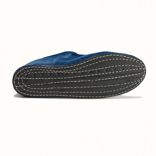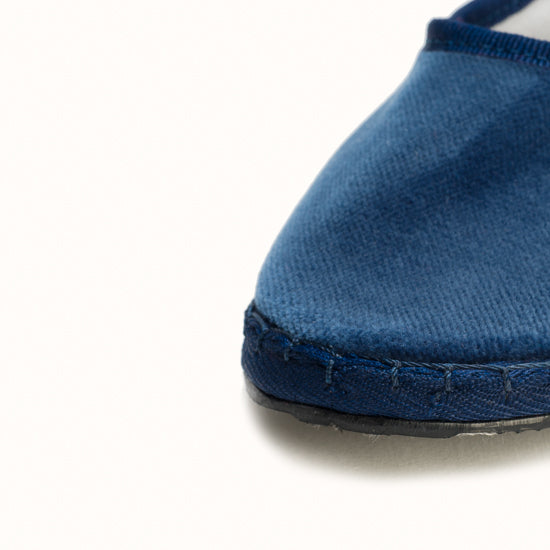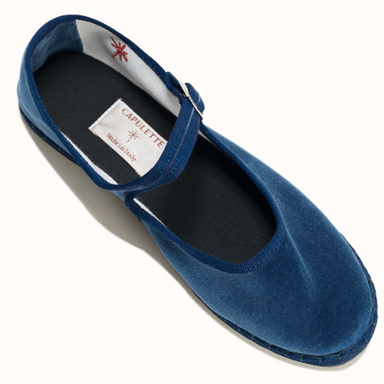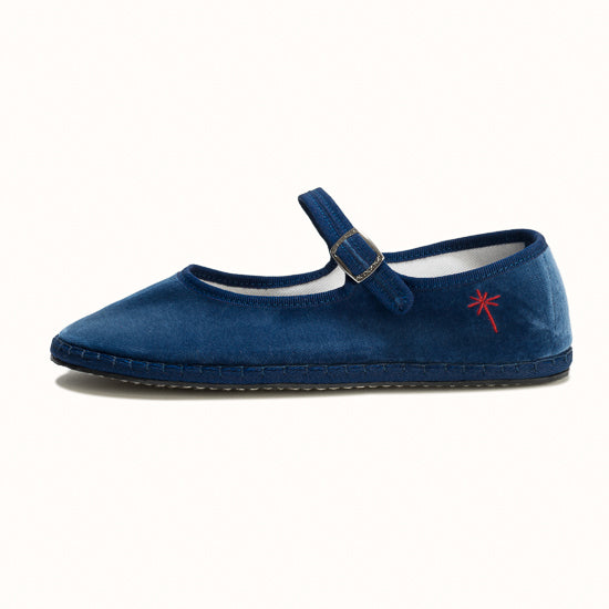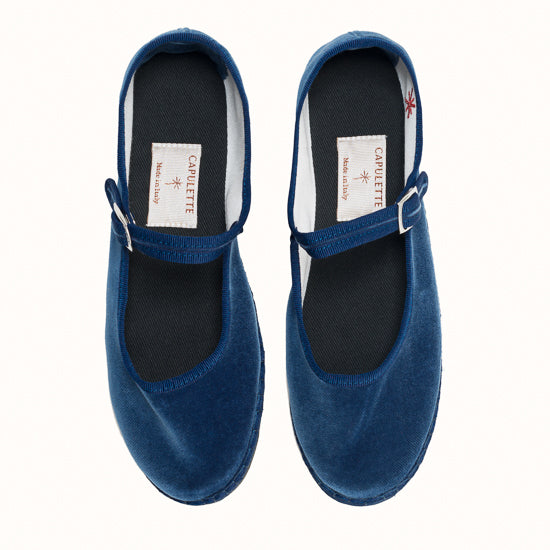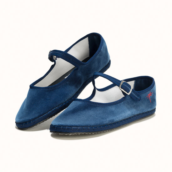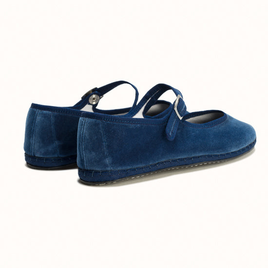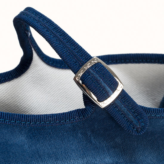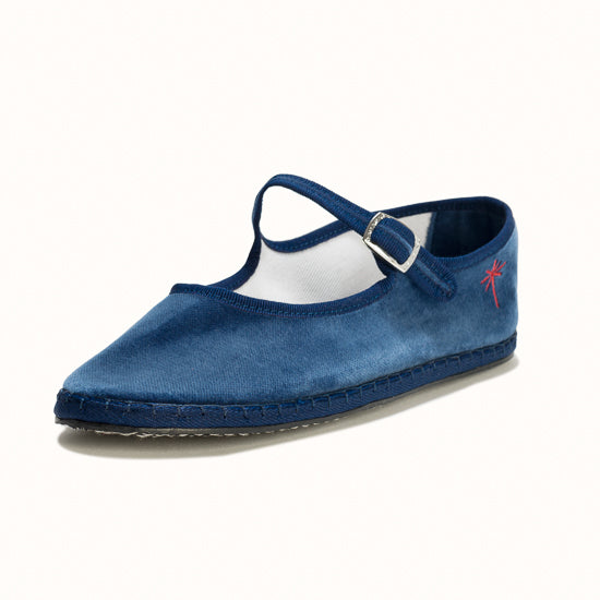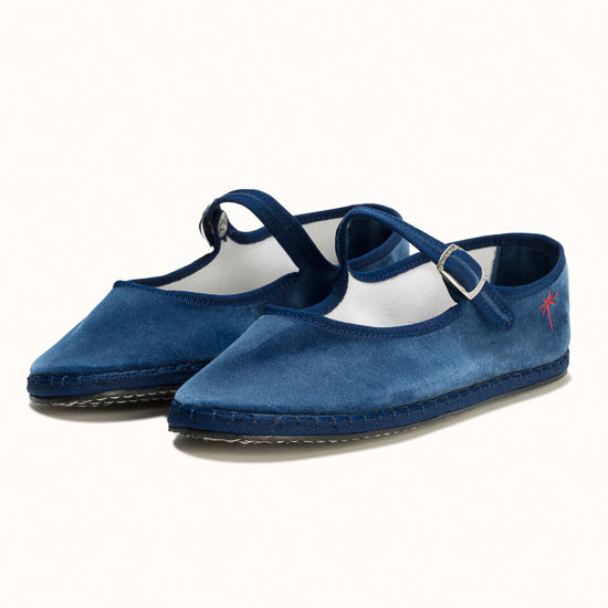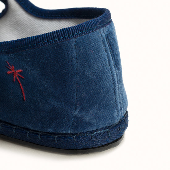 Mary-Jane in denim blue velvet with tone-on-tone grosgrain edging.