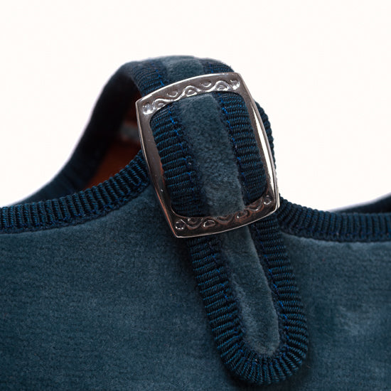 Mary-Jane en velours bleu denim et rebords en gros grain bleu.
