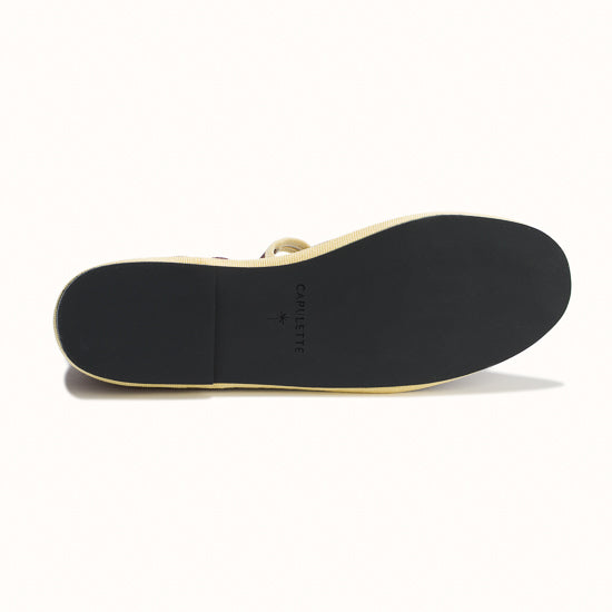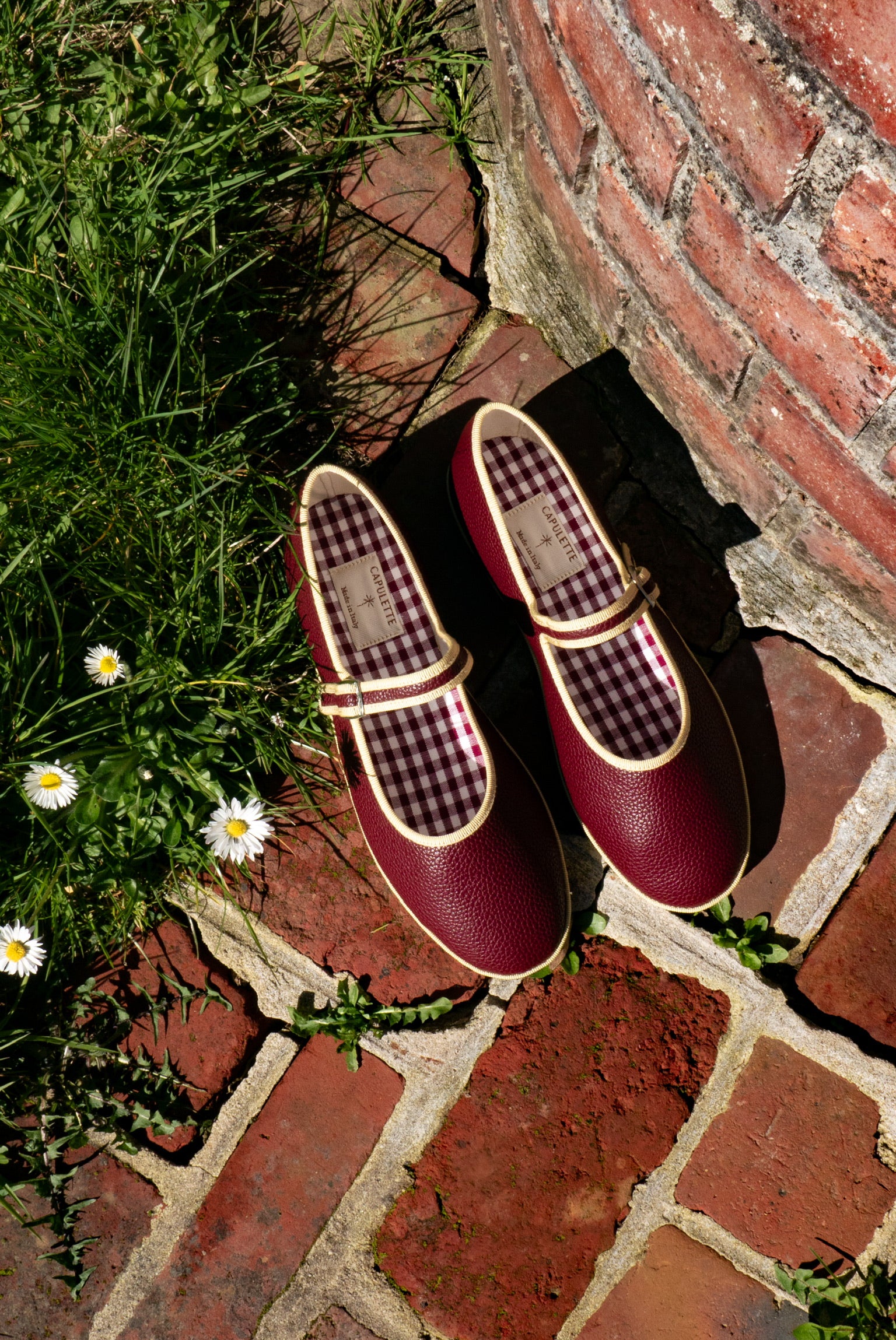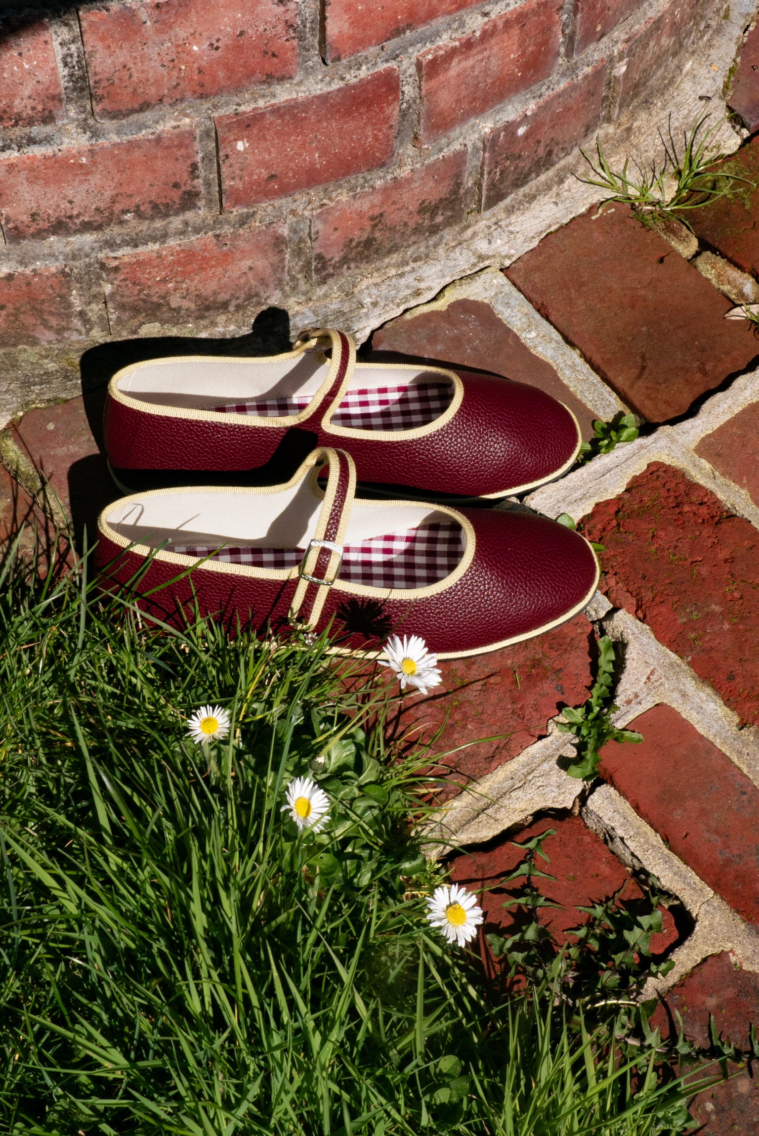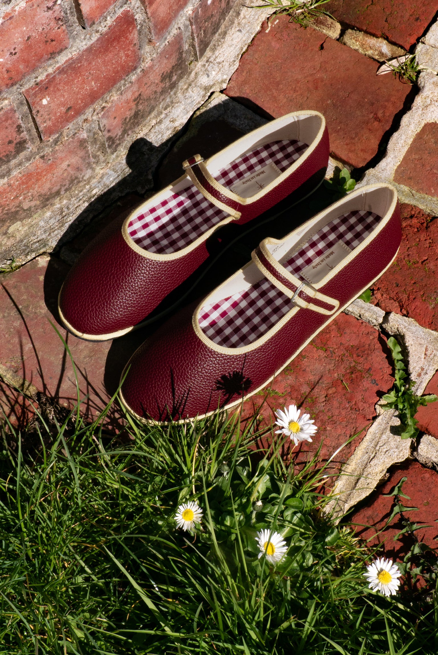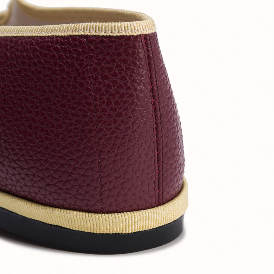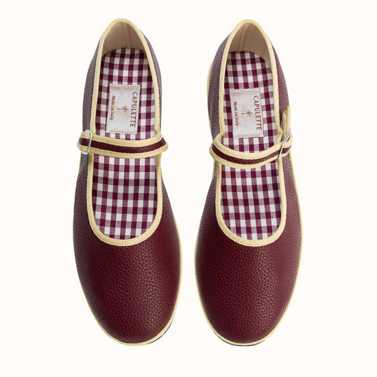La semelle intérieure est en coton vichy bordeaux et la semelle extérieure est en gomme à résistance renforcée.