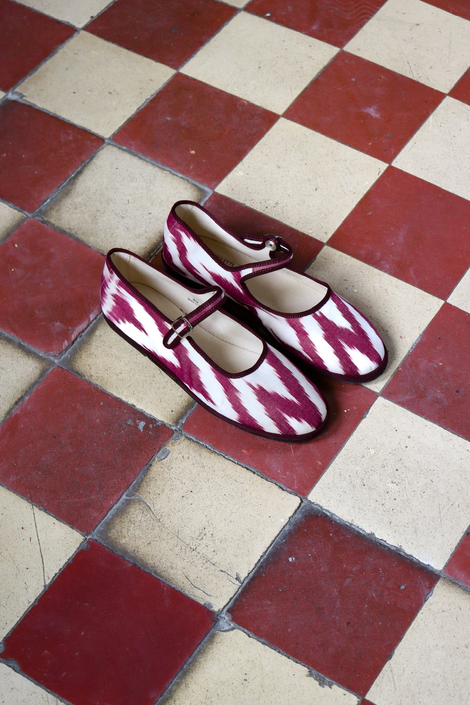 Maryjane in burgundy ikat print cotton.