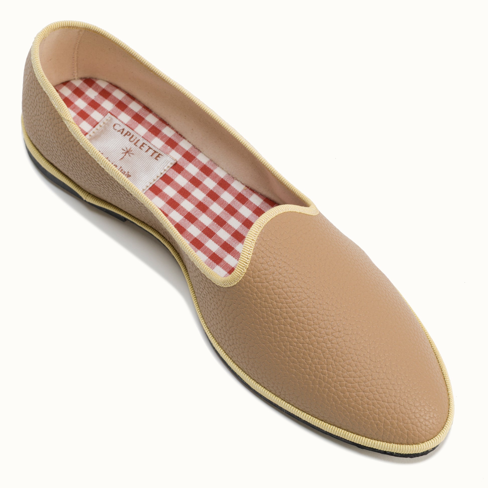 La semelle intérieure est en coton vichy terracotta et la semelle extérieure est en gomme à résistance renforcée.