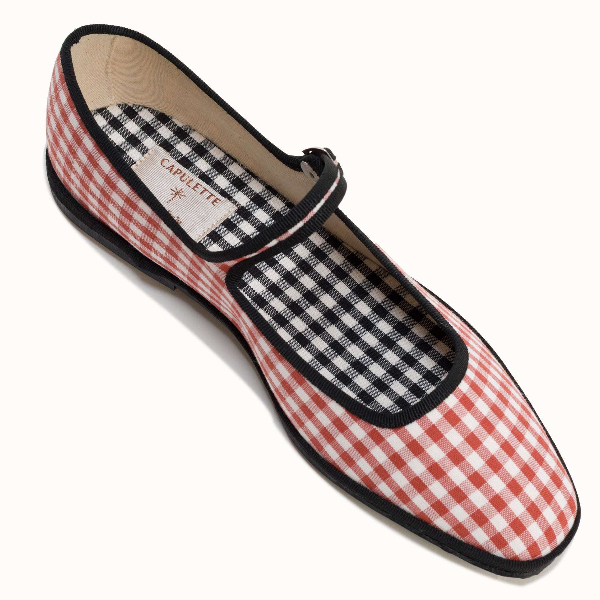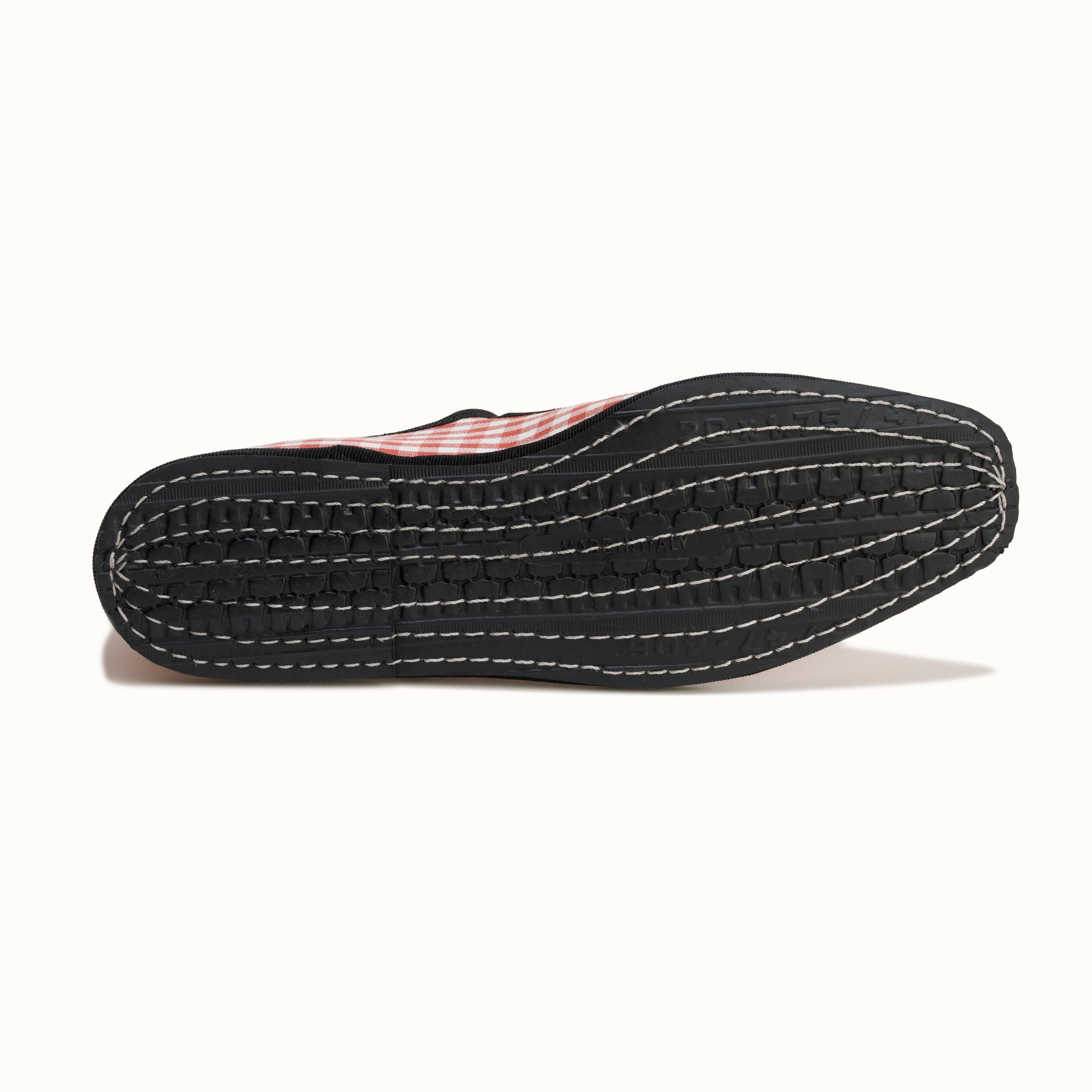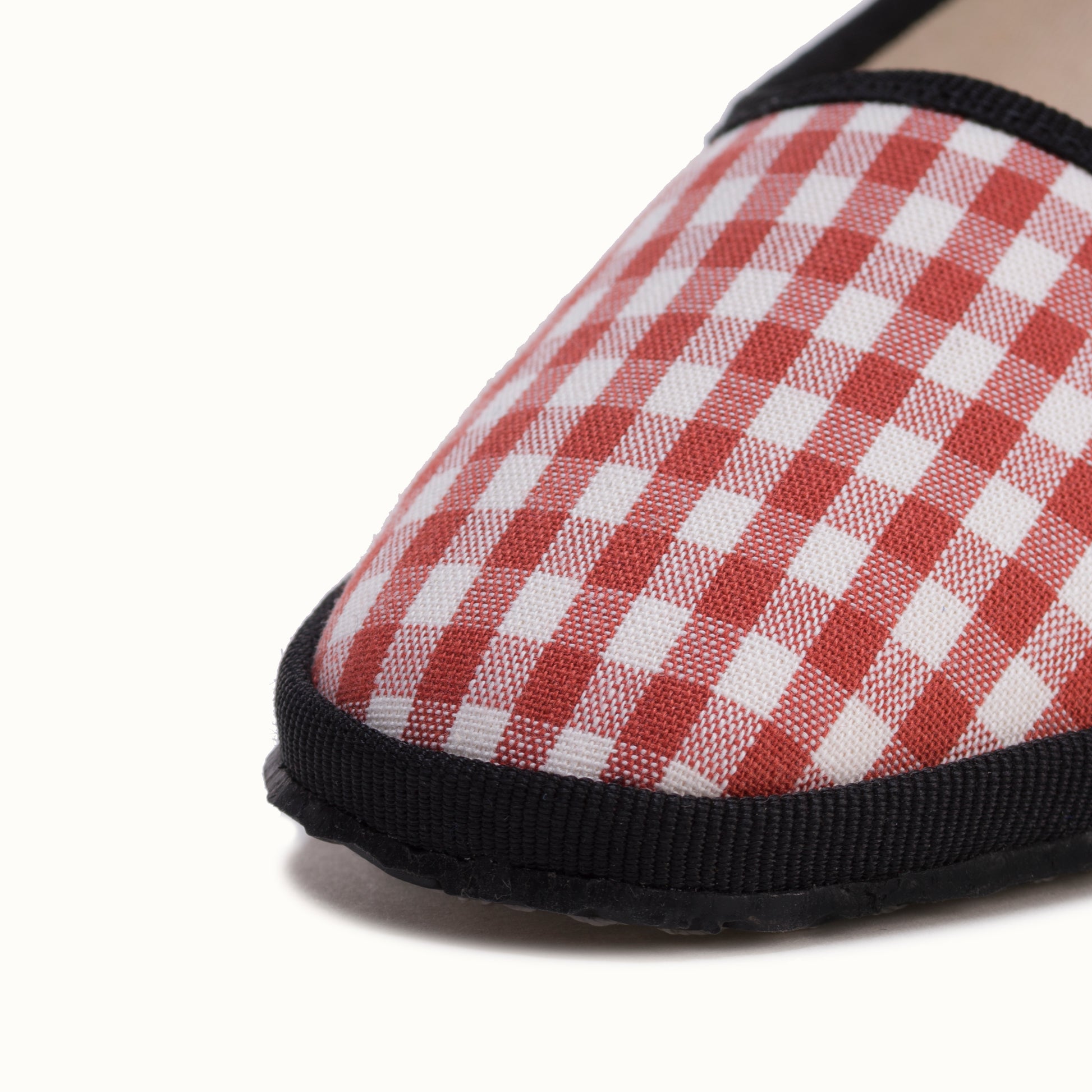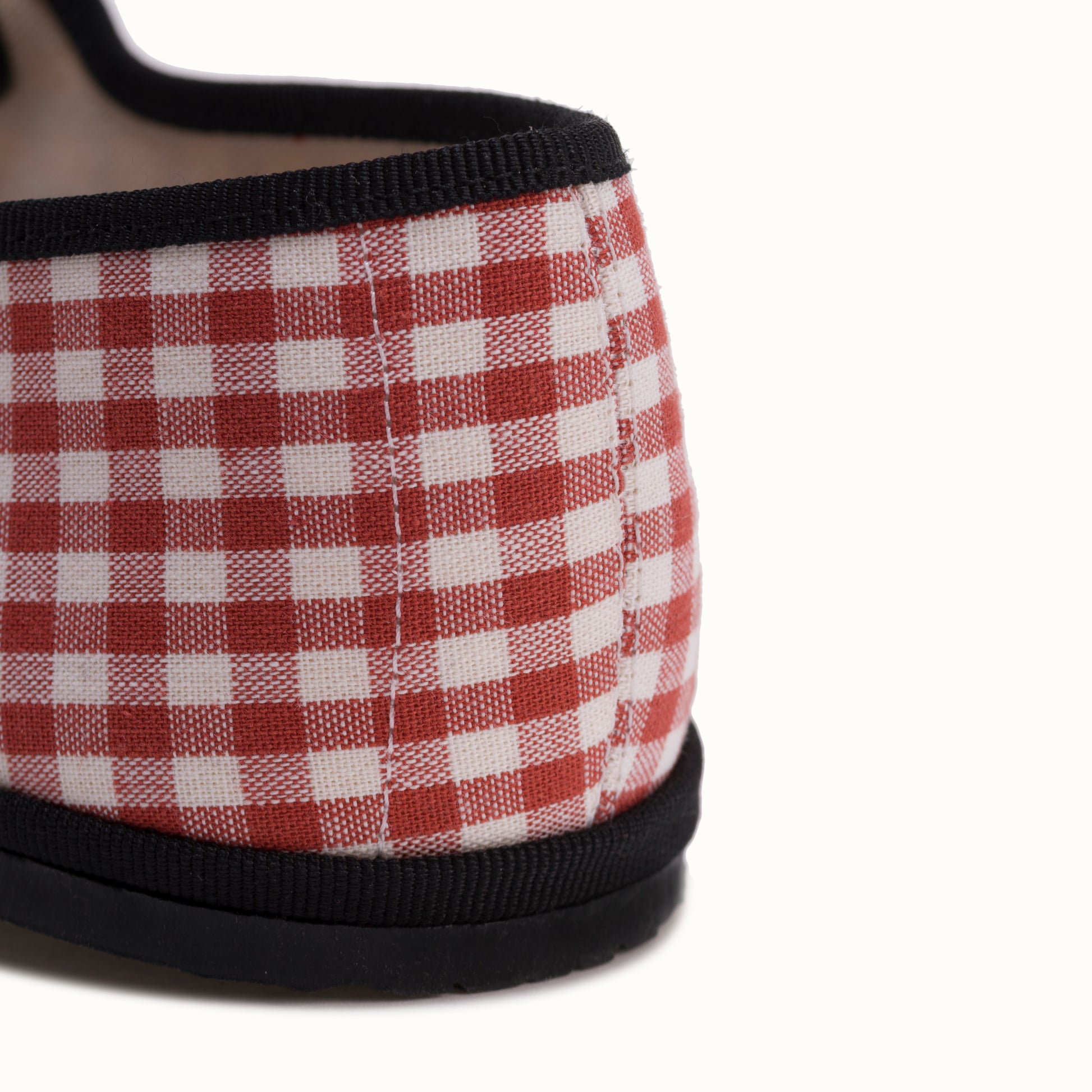 La semelle intérieure est en coton vichy noir et la semelle extérieure est en gomme à résistance renforcée.