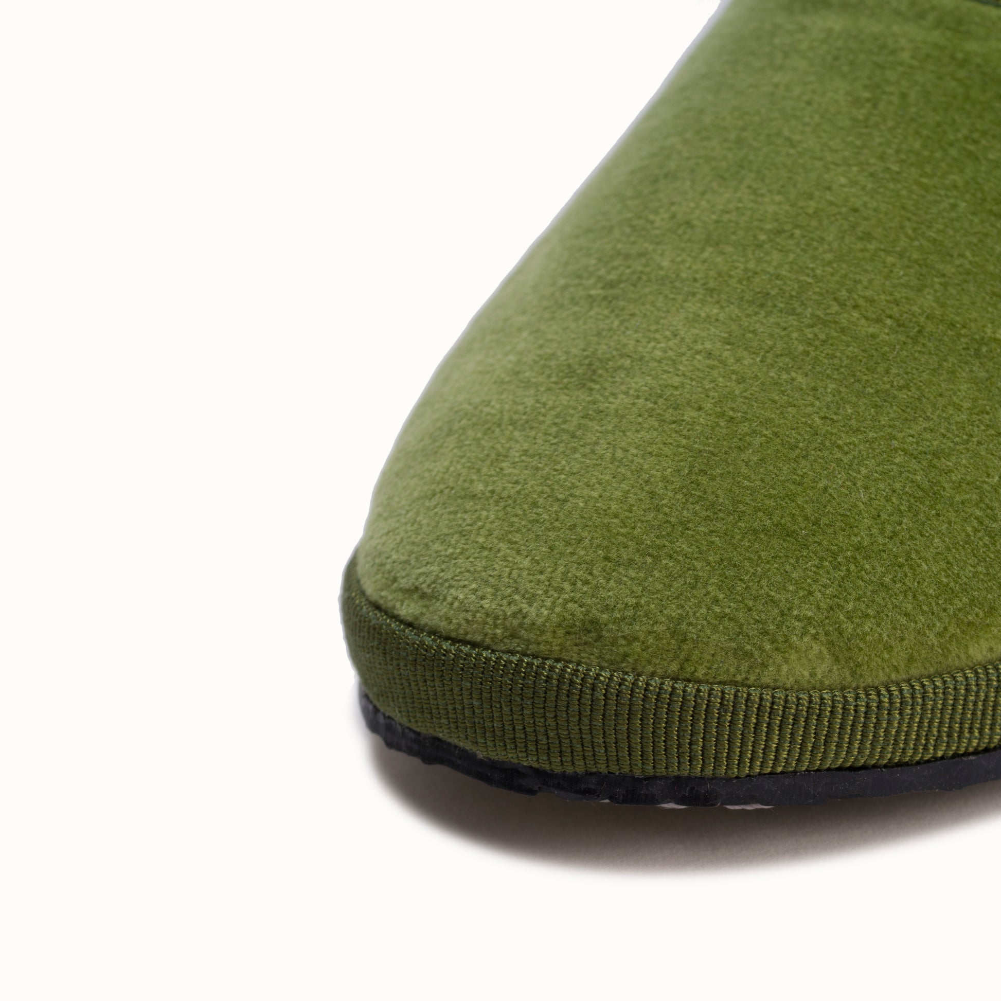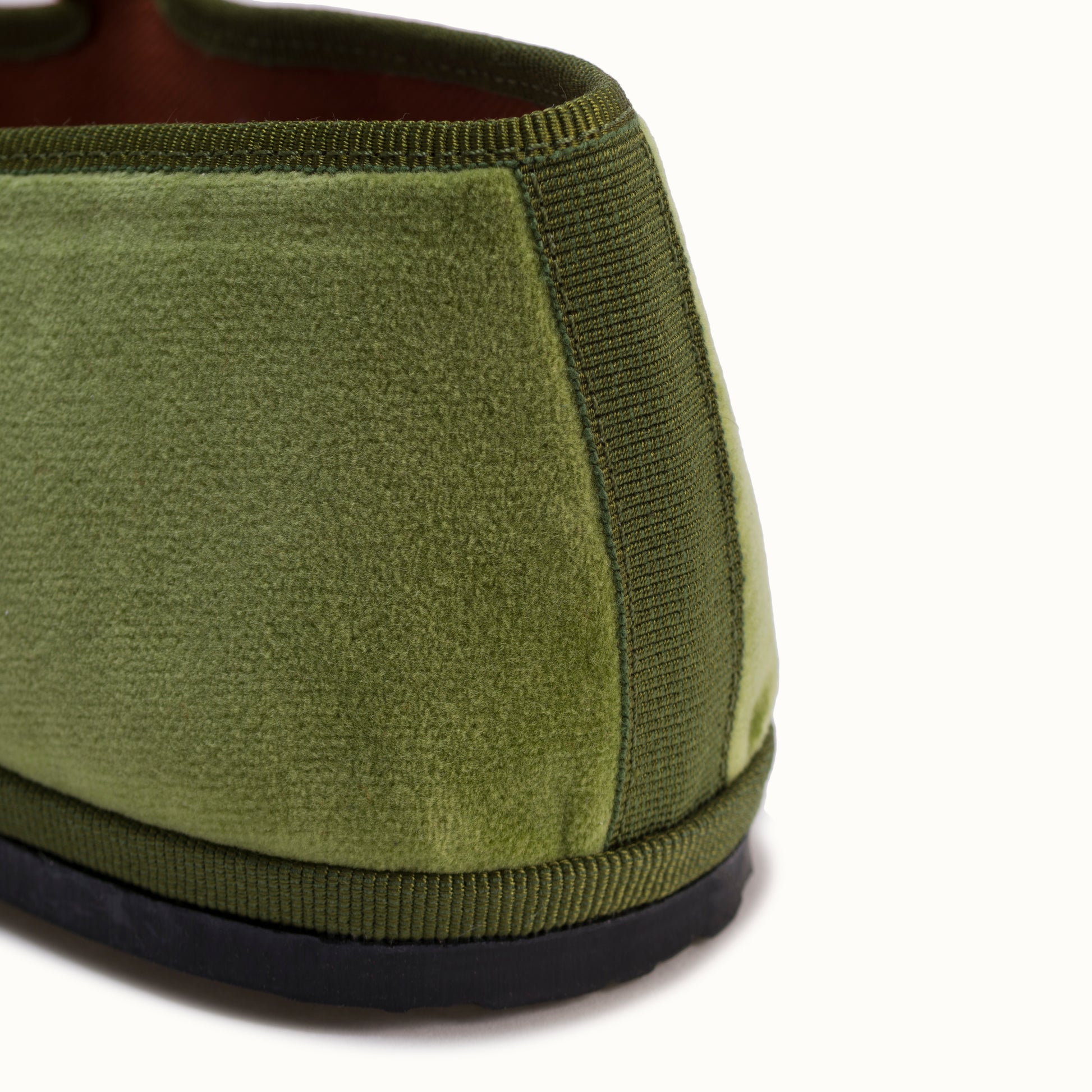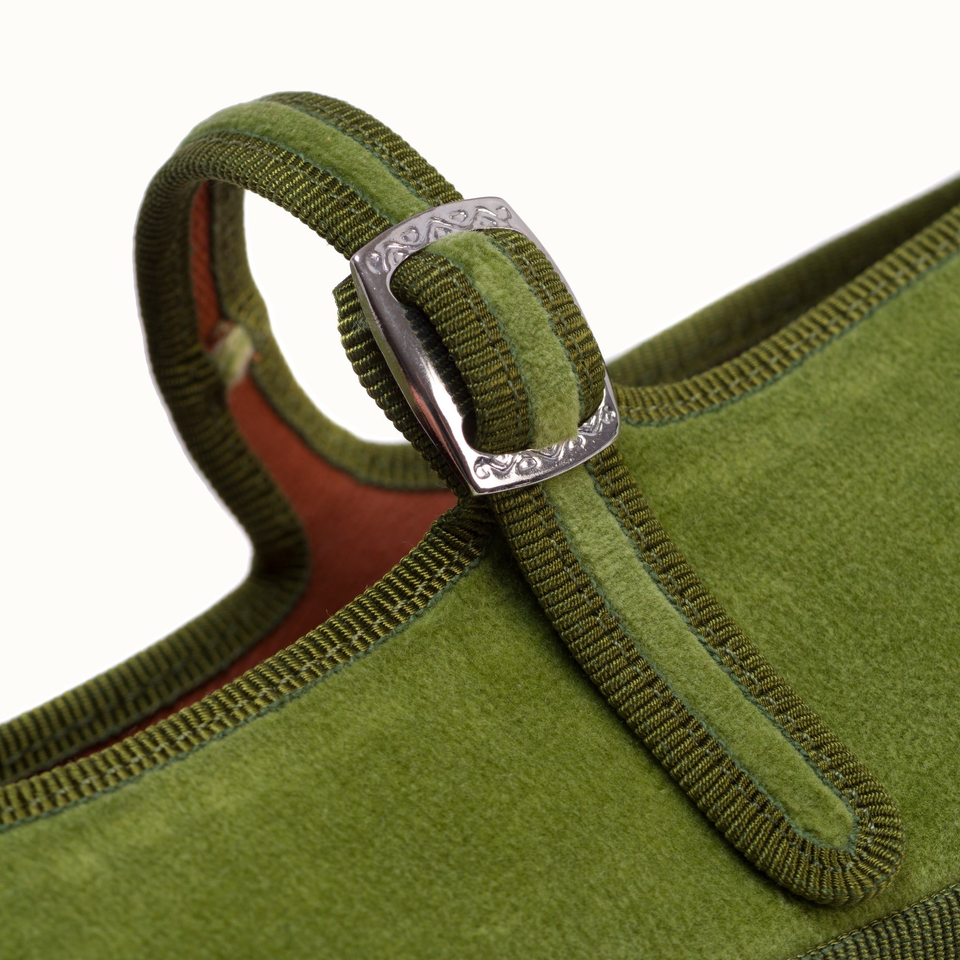 Mary-Jane in pistachio-green velvet with forest-green grosgrain edging.