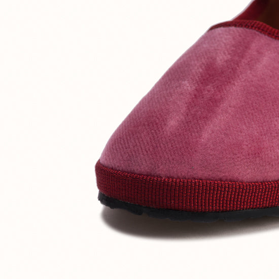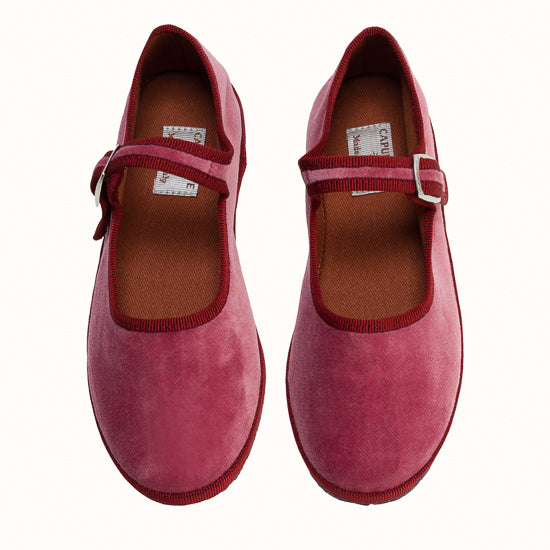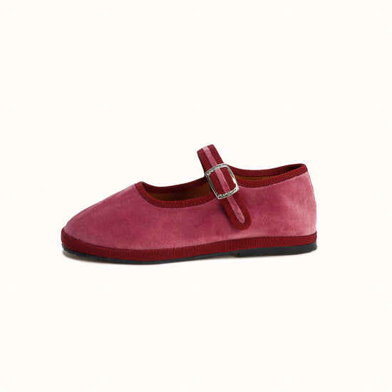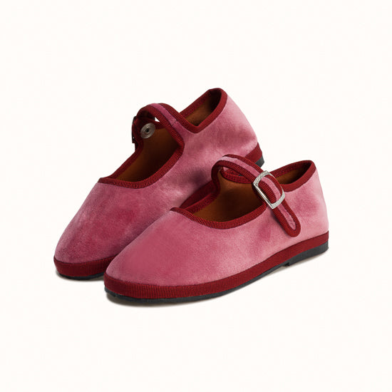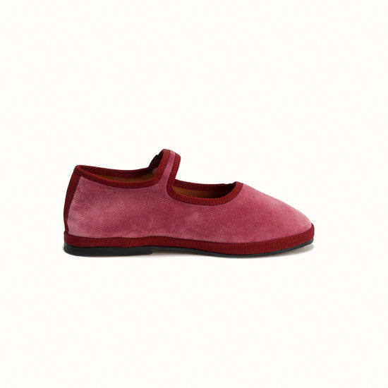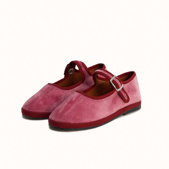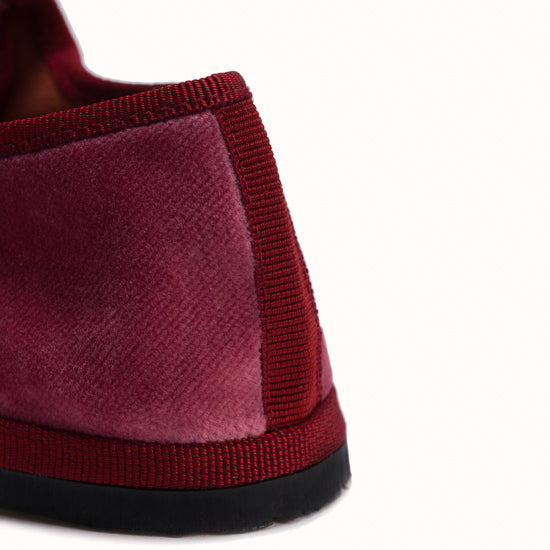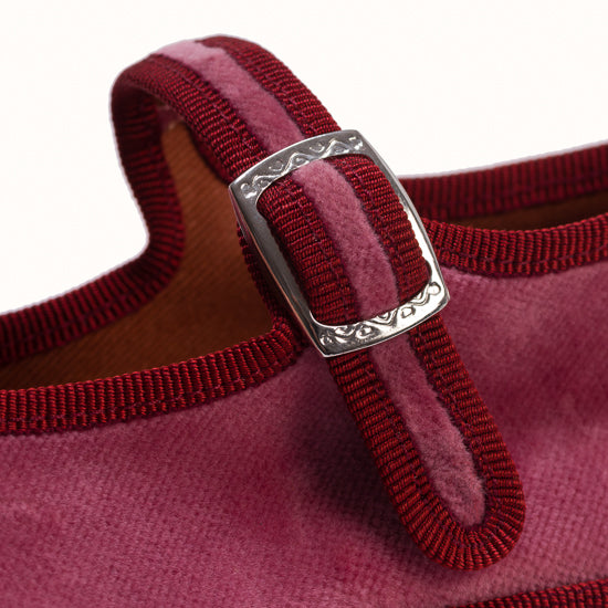 Mary-Jane en velours rose framboise et rebords en gros grain bordeaux.