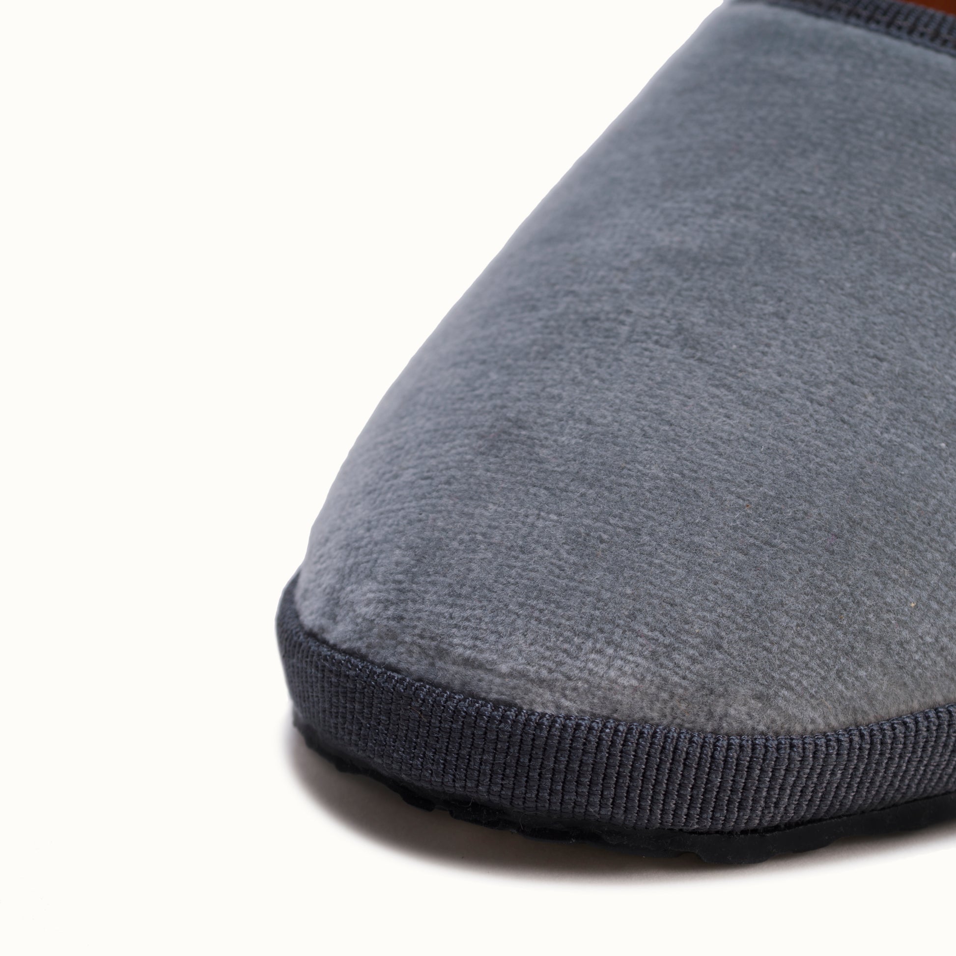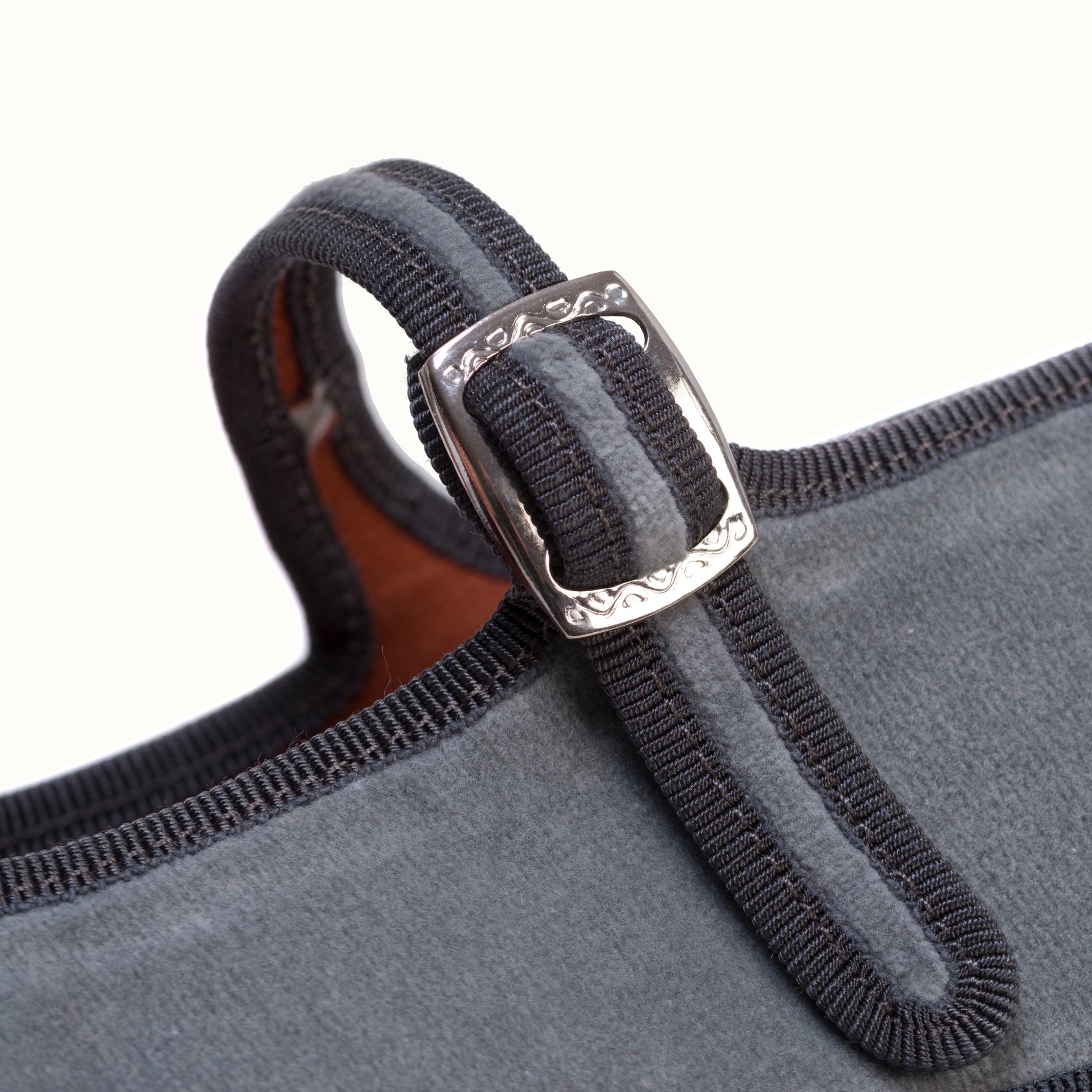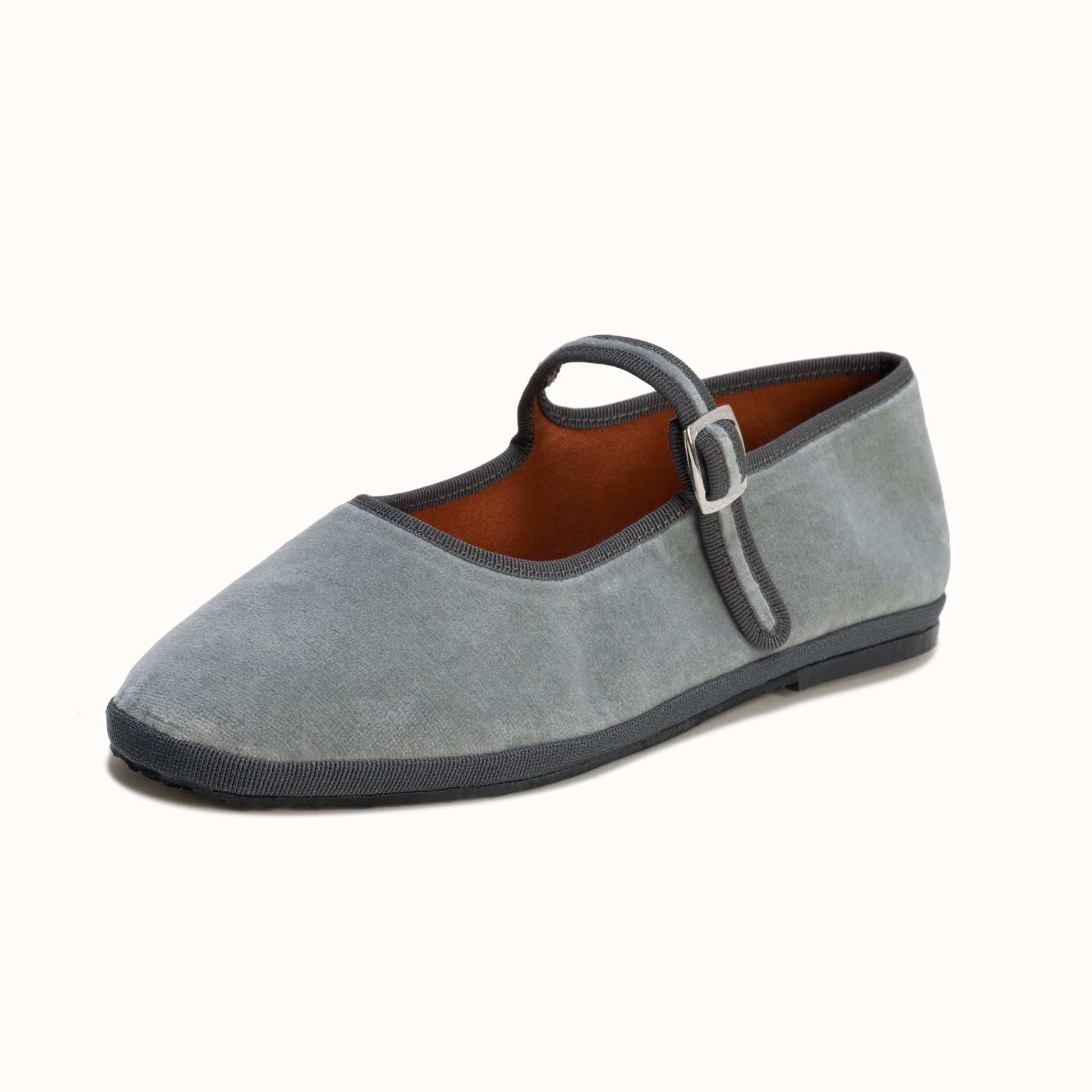 Mary-Jane in grey velvet with anthracite grey grosgrain edging.