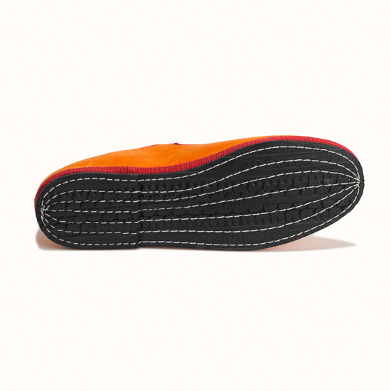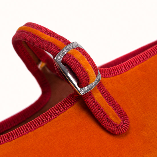 Mary-Jane en velours tangerine et rebords en gros grain rouge brique.