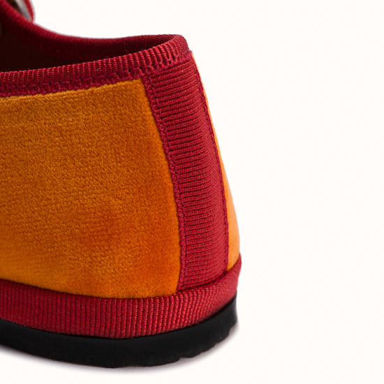 Mary-Jane en velours tangerine et rebords en gros grain rouge brique.