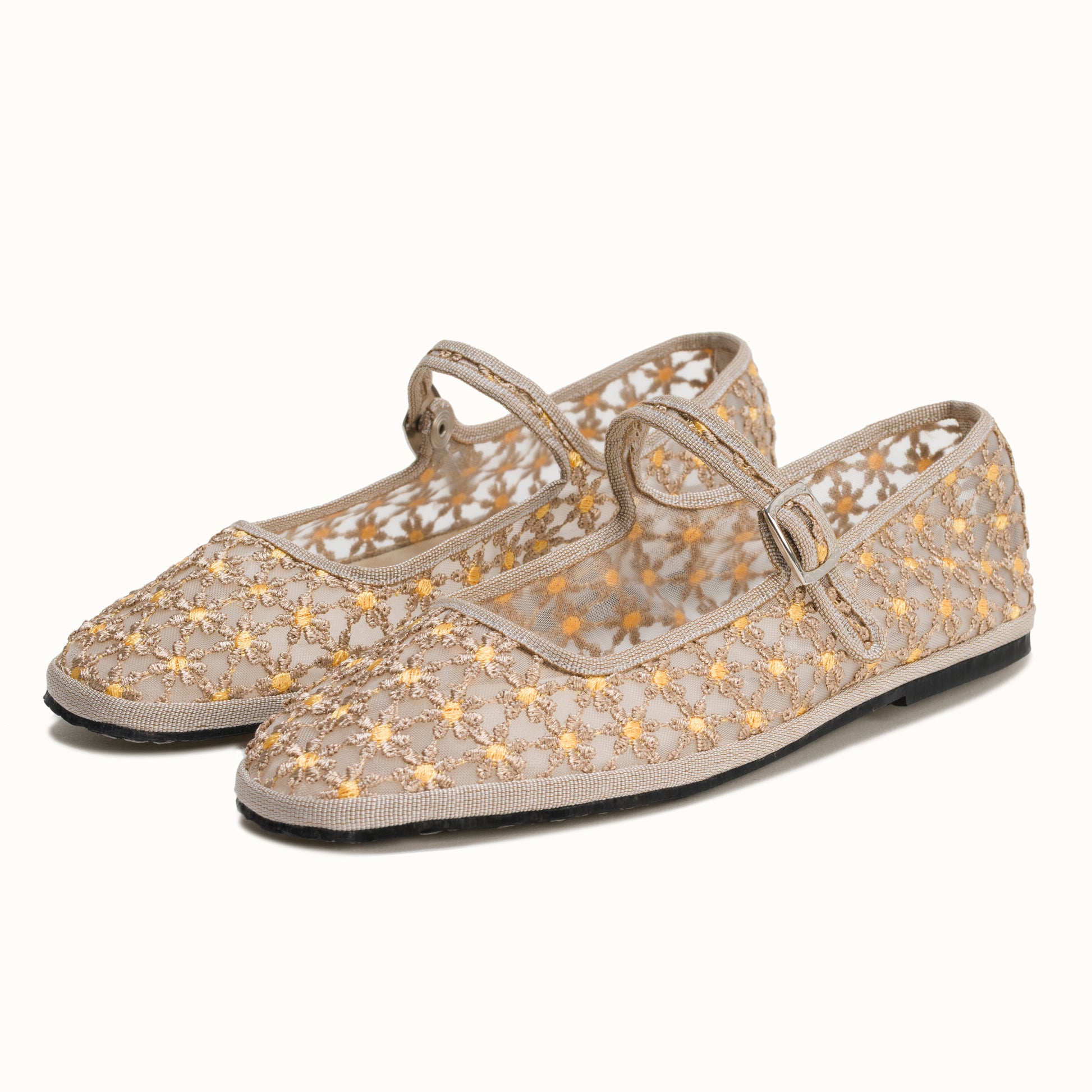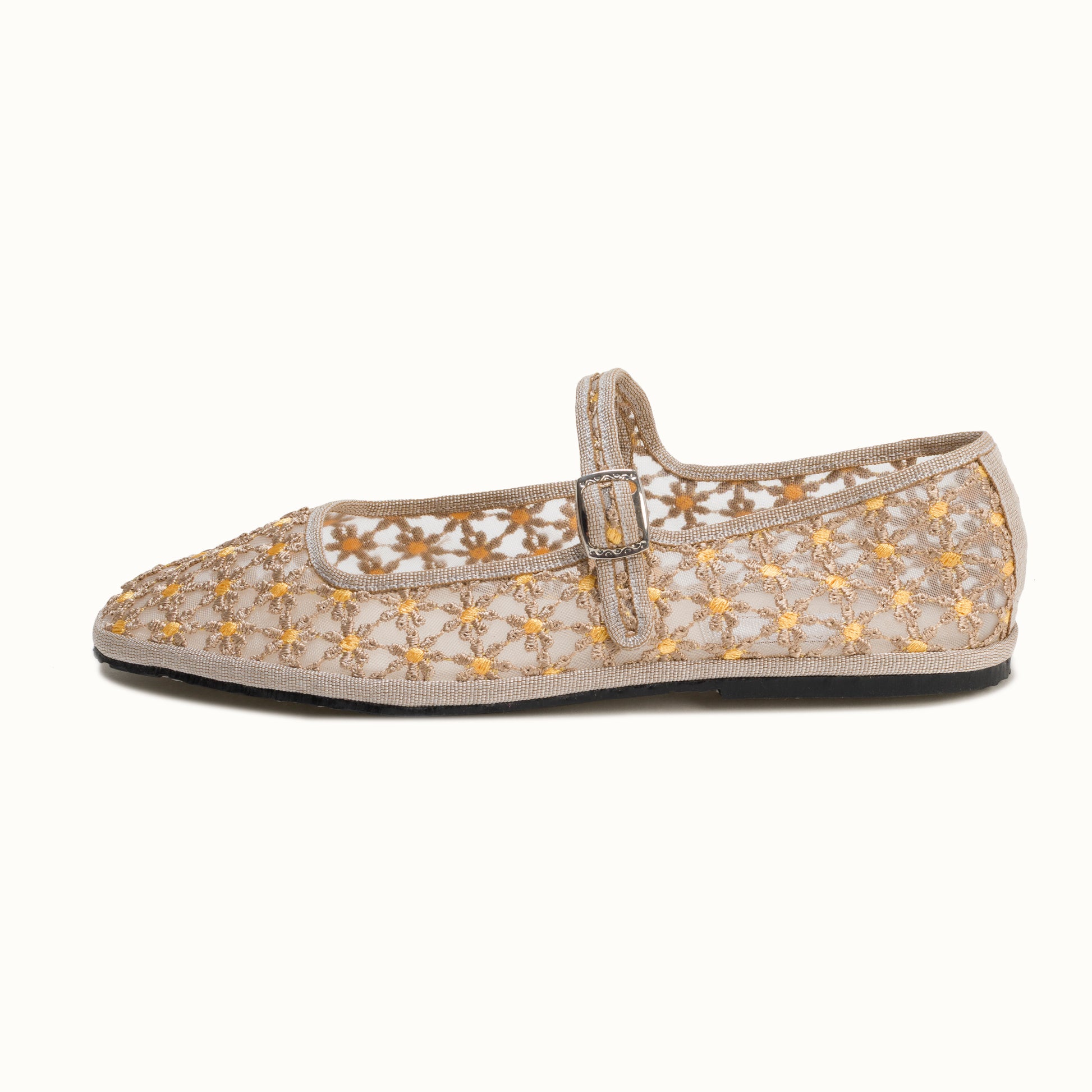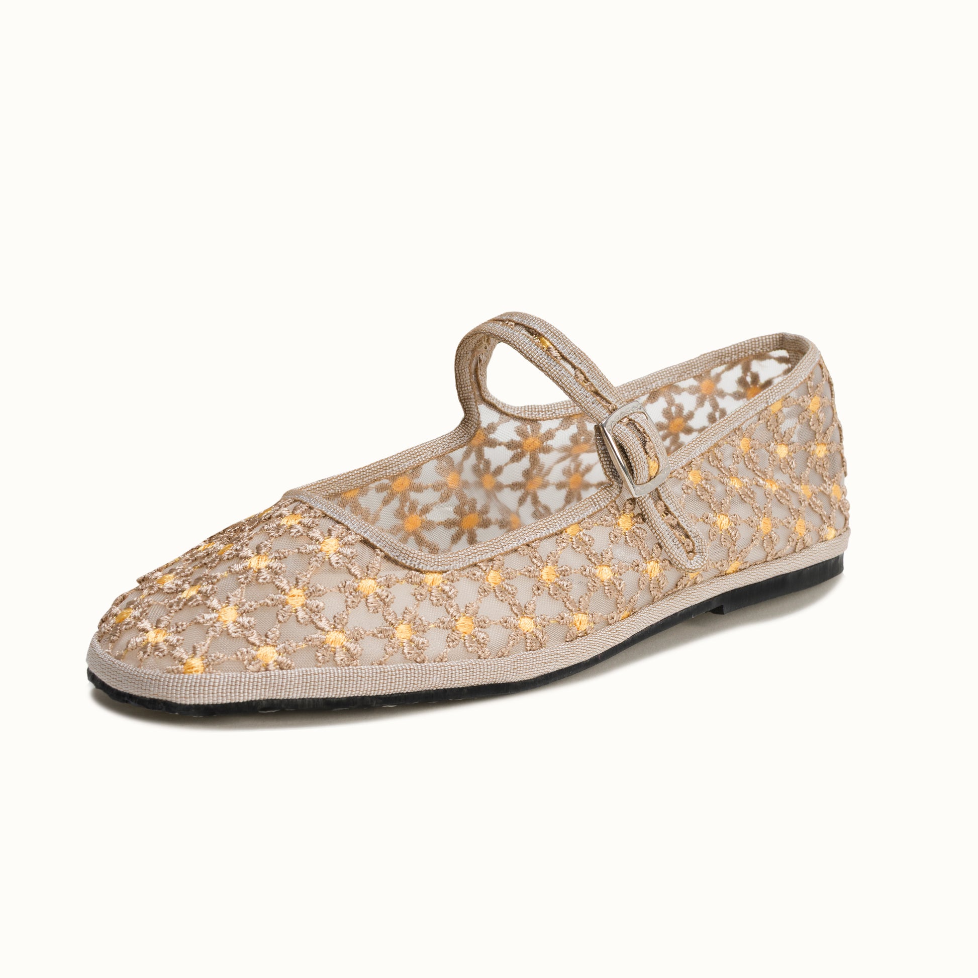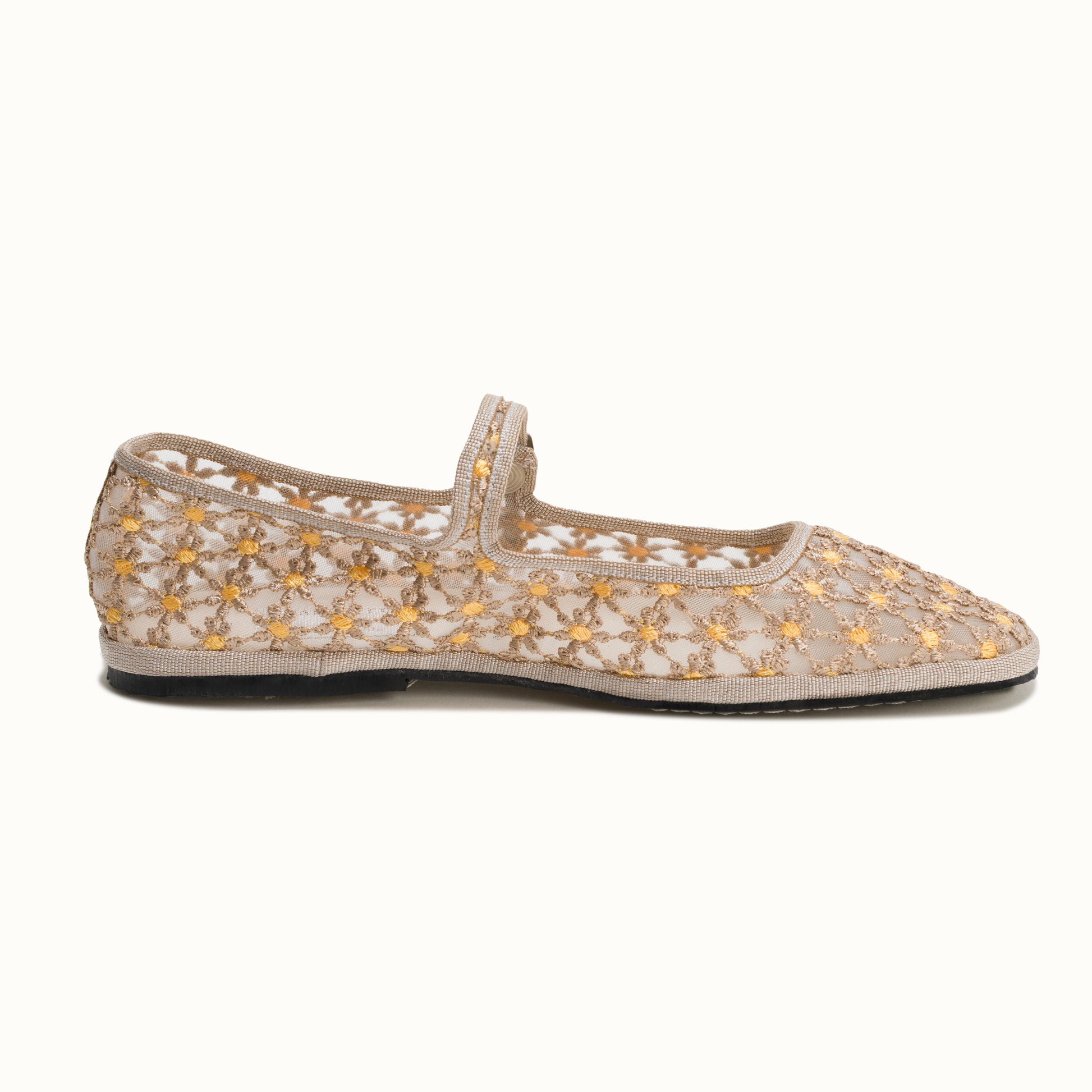 Maryjane embout carré en résille greige brodée de fleurs jaune.