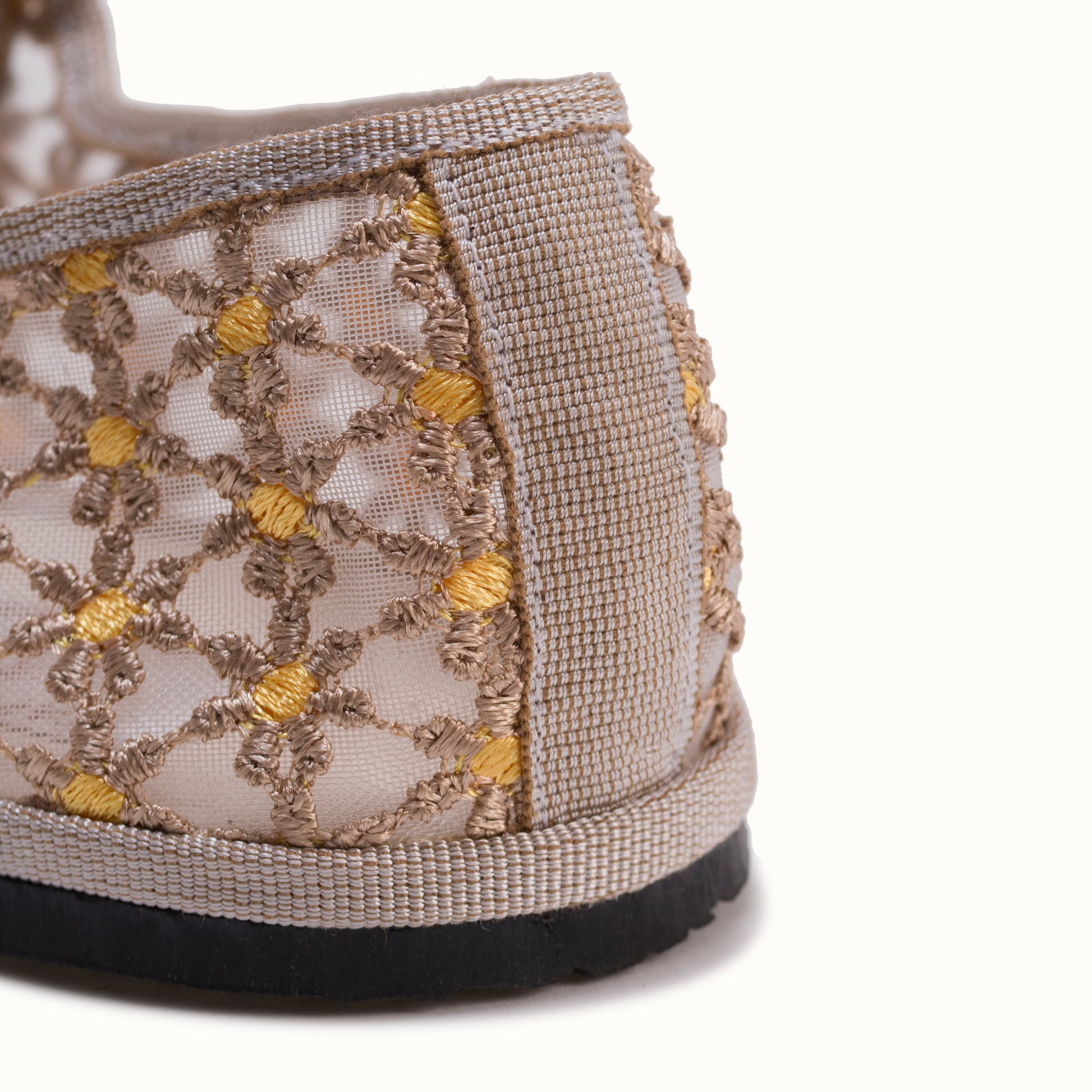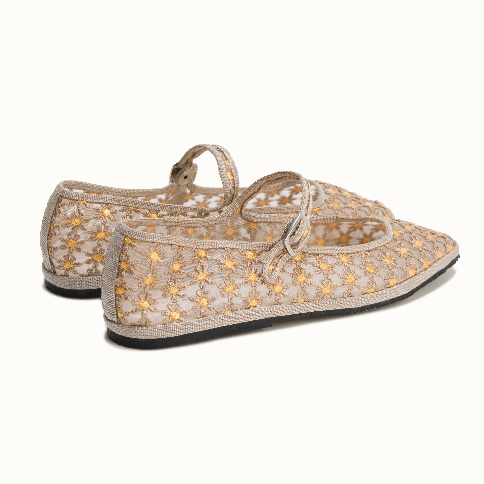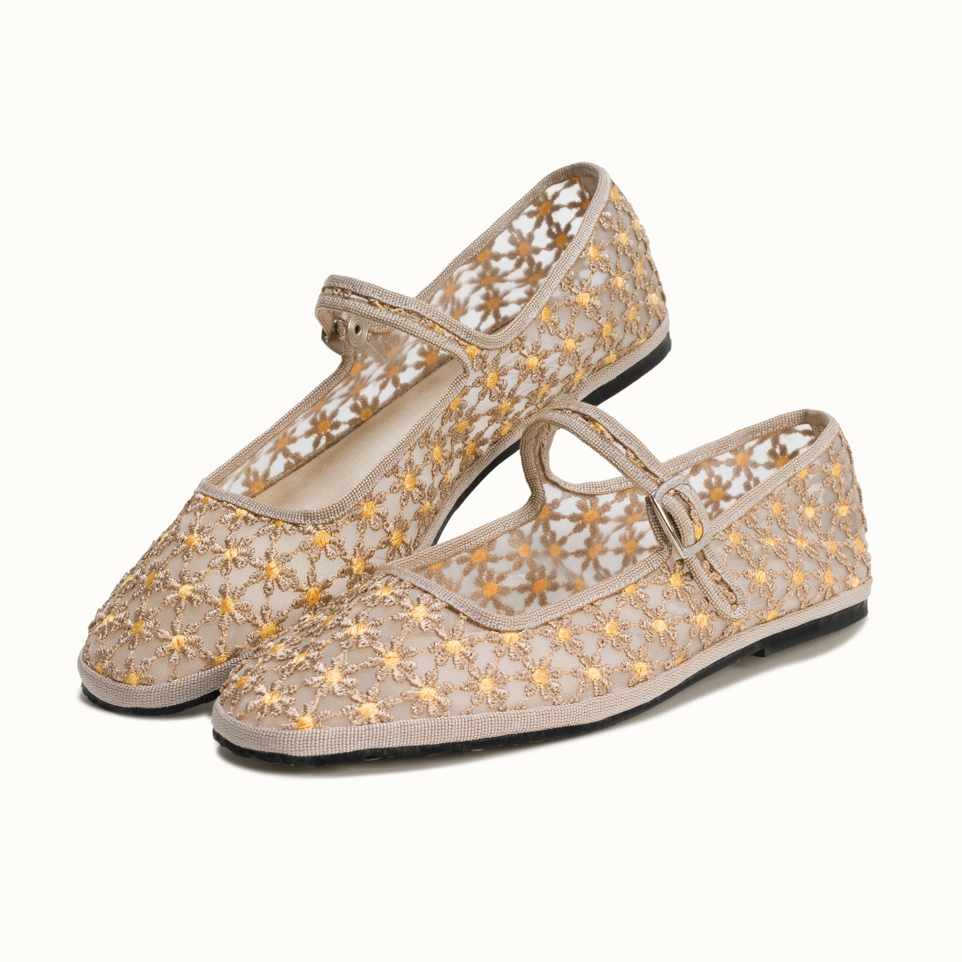 Maryjane embout carré en résille greige brodée de fleurs jaune.