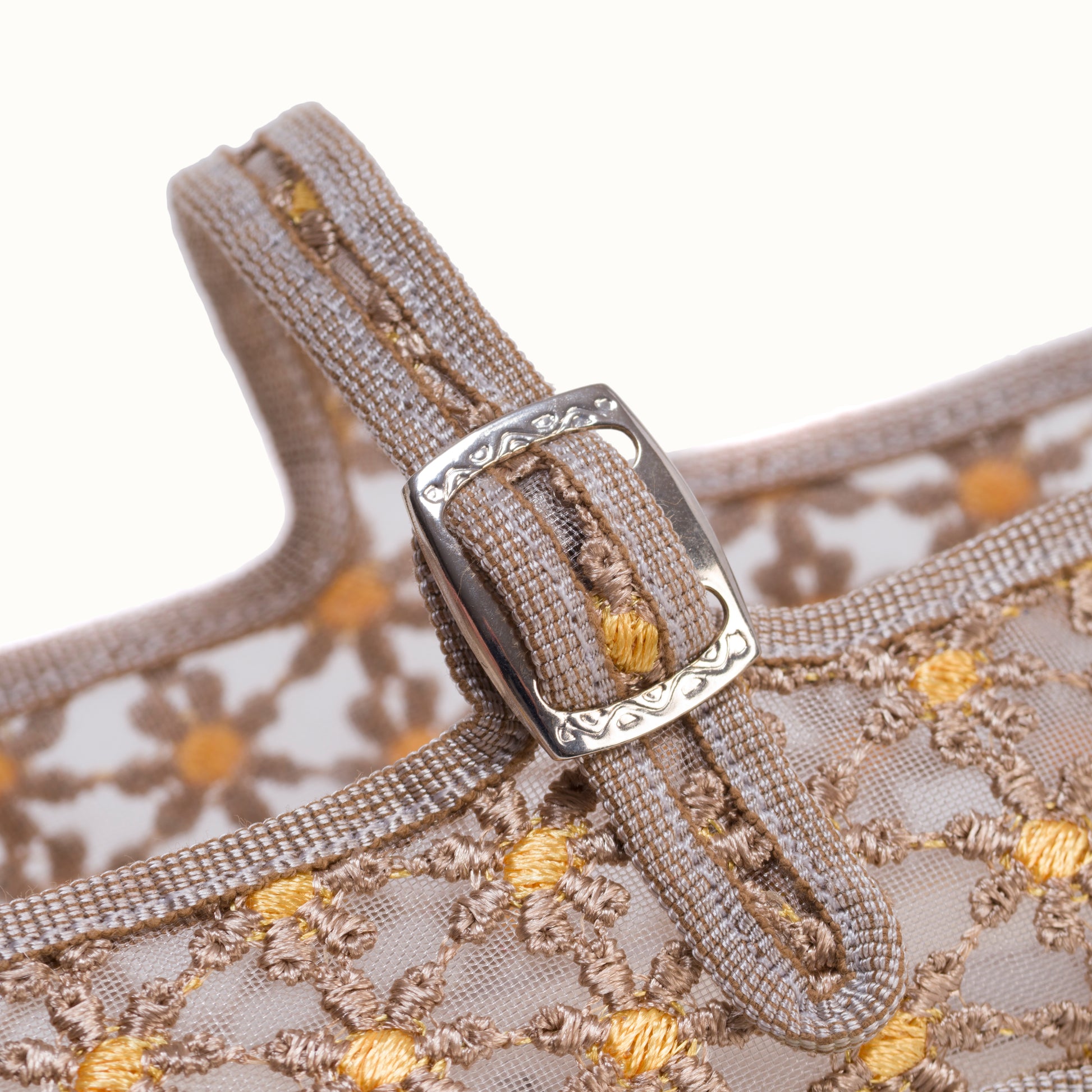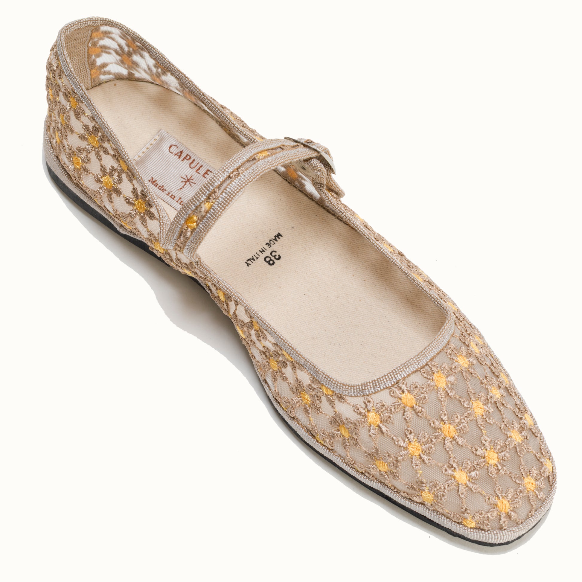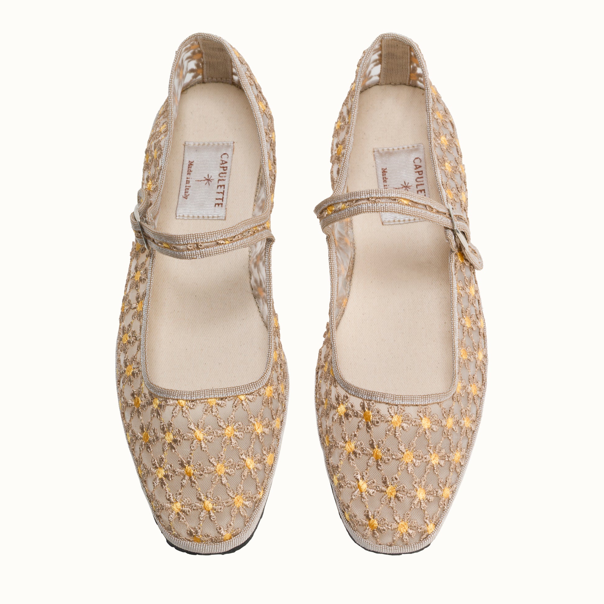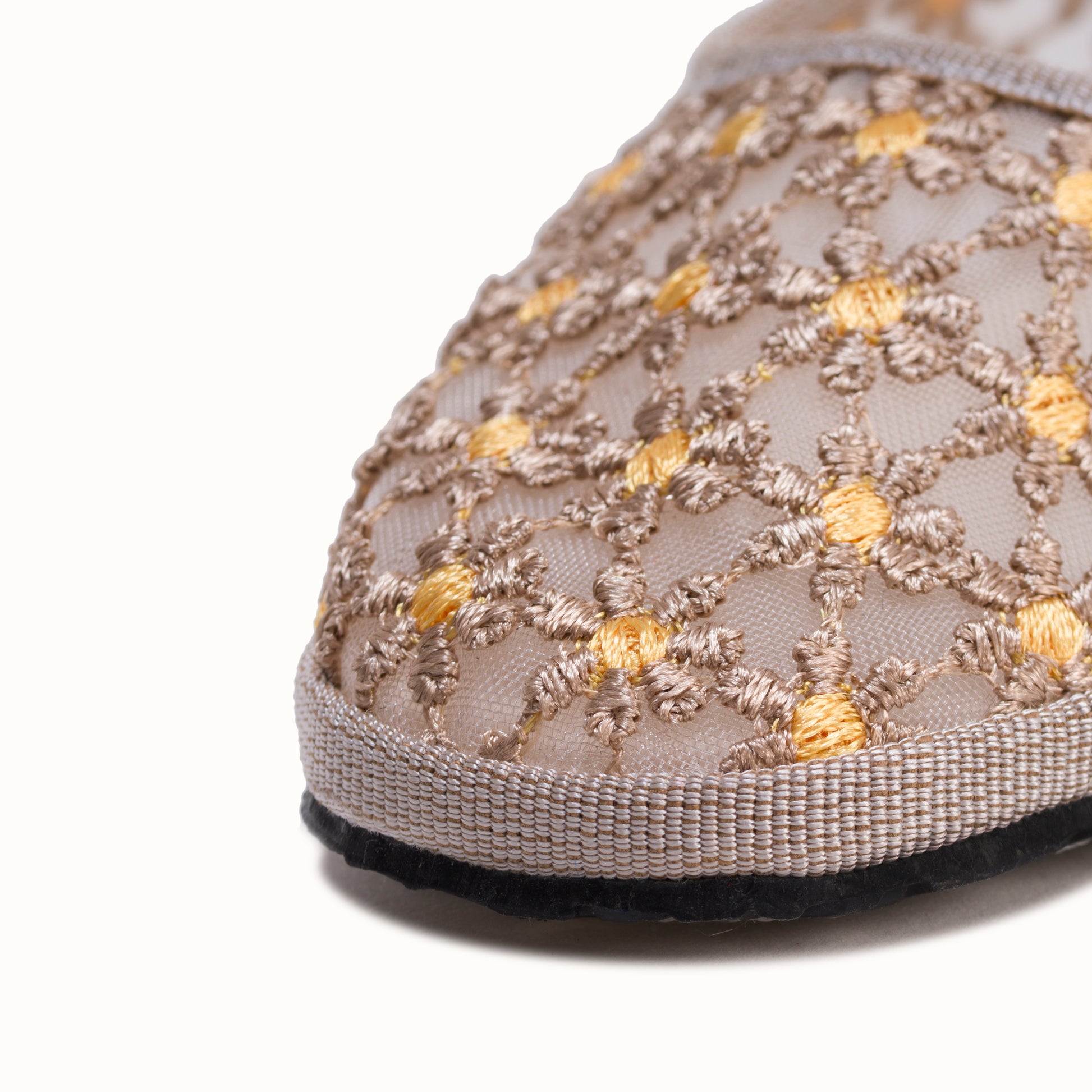 Maryjane embout carré en résille greige brodée de fleurs jaune.