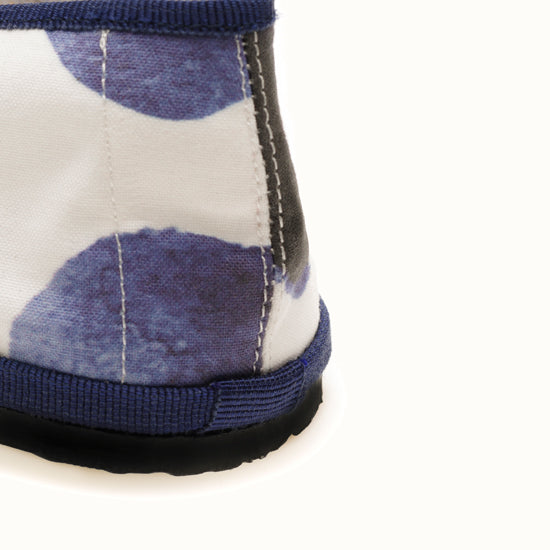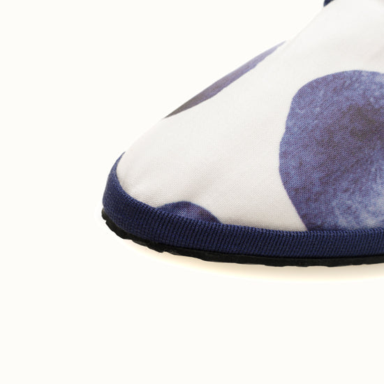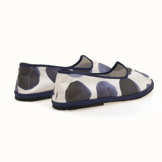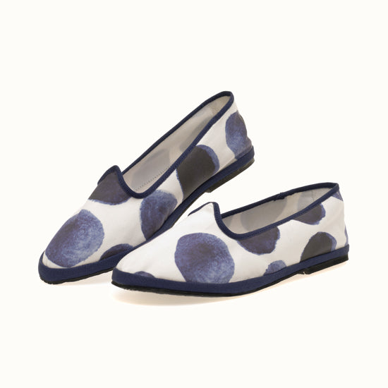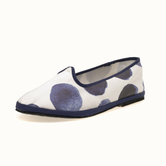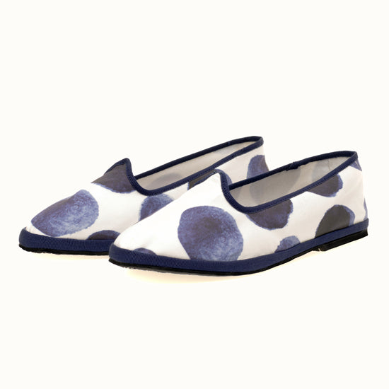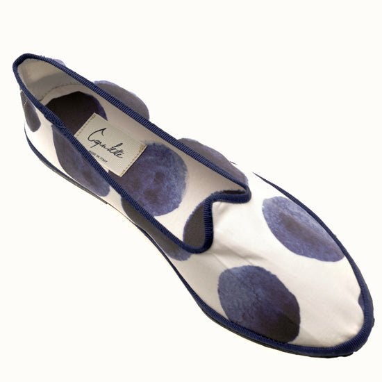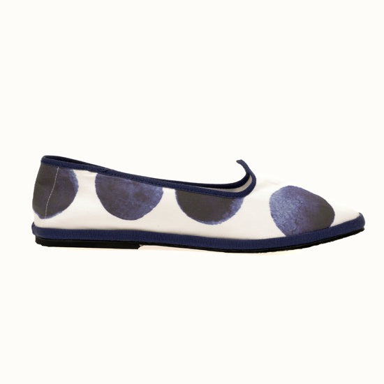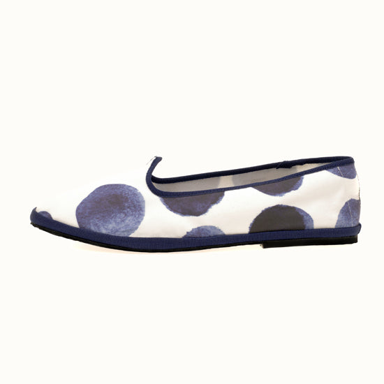 White printed cotton with large midnight blue dots. Midnight blue grosgrain edges. Pointed toe. Thicker sole with a small heel. Lined with printed cotton. Bicycle tyre soles for indoor and outdoor wear.