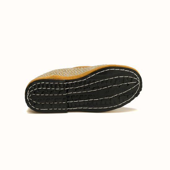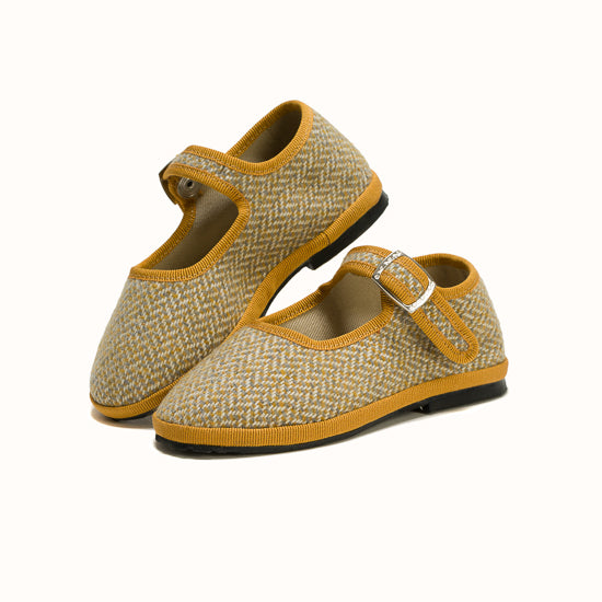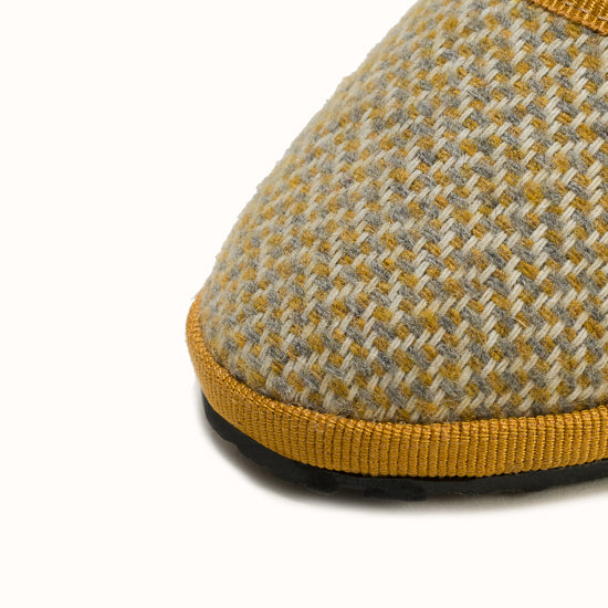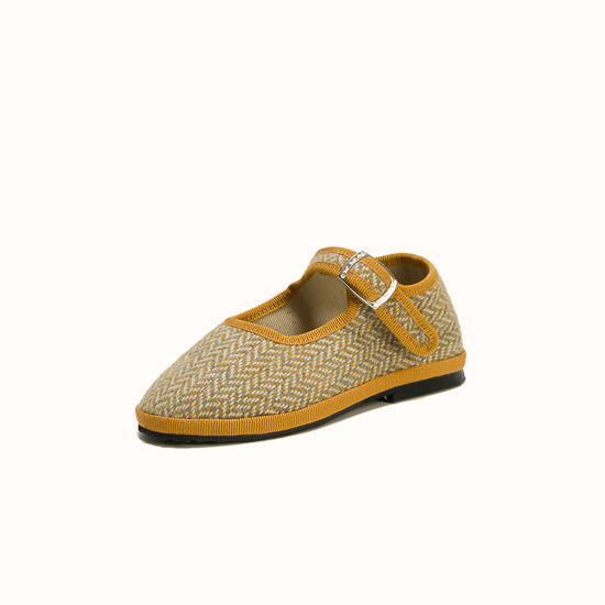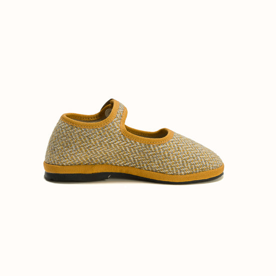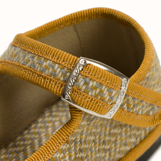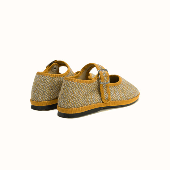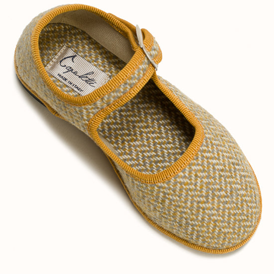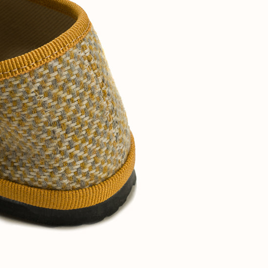 Beige herringbone wool. Ochre grosgrain. Strap with snap and adjustable buckle. Bicycle tyres are used for the soles so you can wear them indoors as well as outdoors.