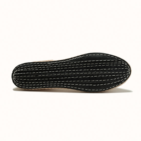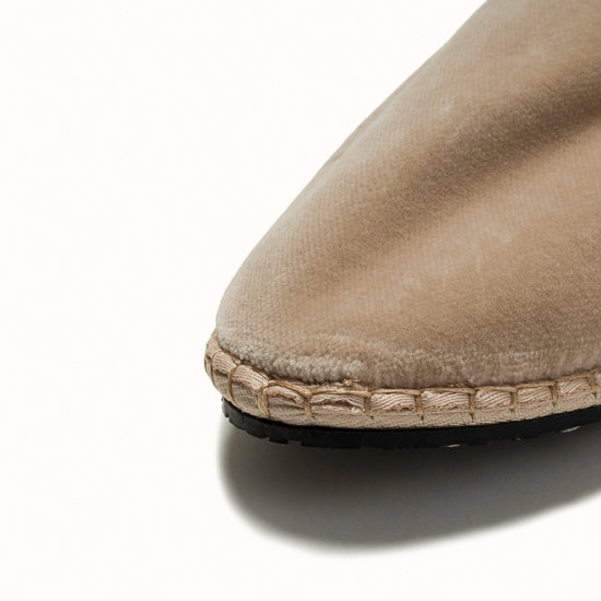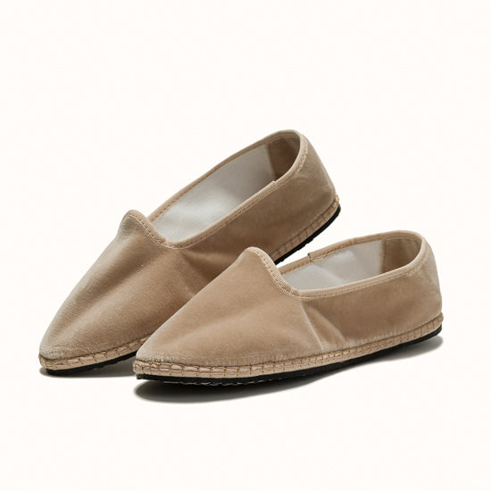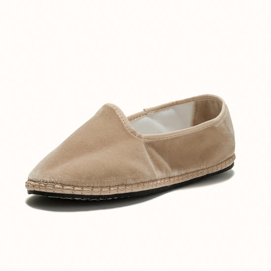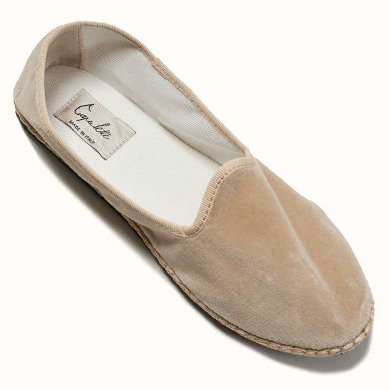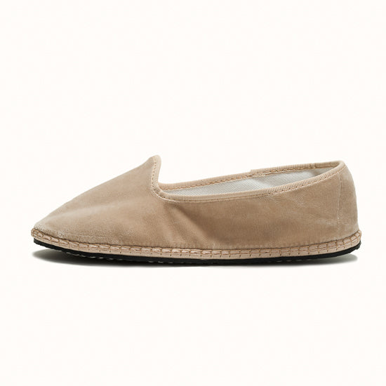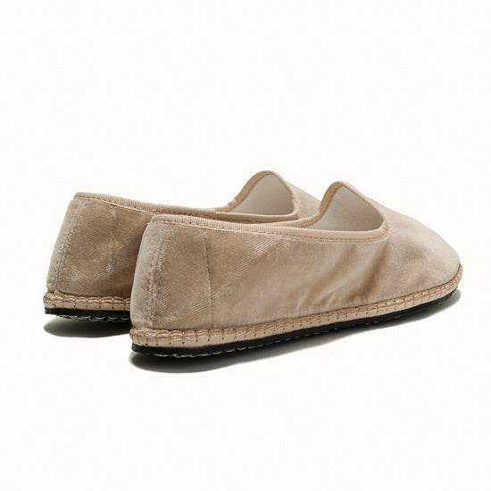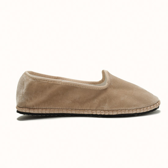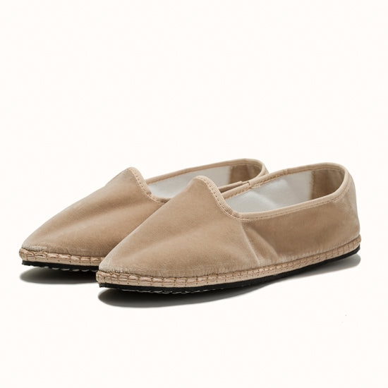 Friulane made according to the Venetian tradition in sandy beige velvet and grosgrain tone on tone. The outer sole is made of bicycle tire and the inner sole is made of cotton. Can be worn inside or outside!