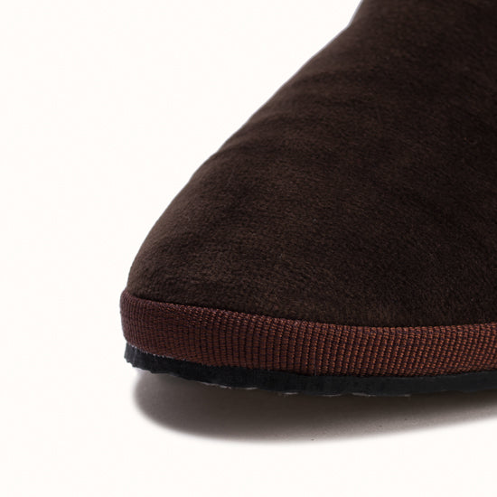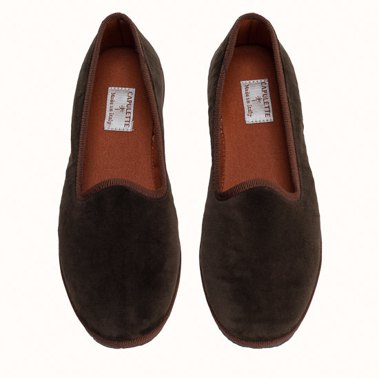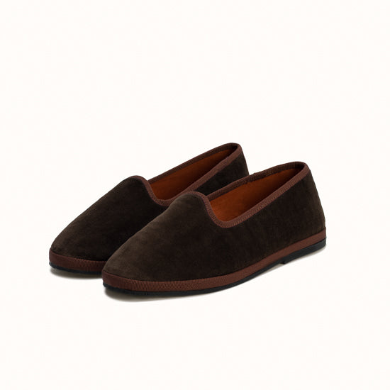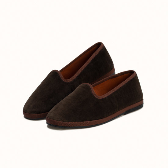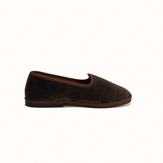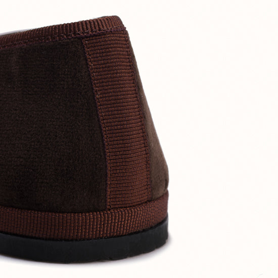 Friulane en velours marron foncé et rebords en gros grain ton sur ton.
