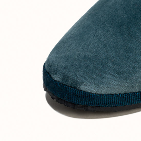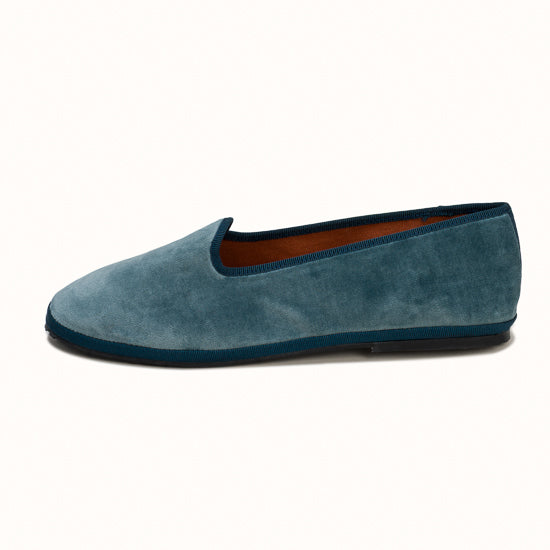 Friulane en velours bleu denim et rebords en gros grain bleu.