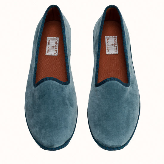 Friulane en velours bleu denim et rebords en gros grain bleu.