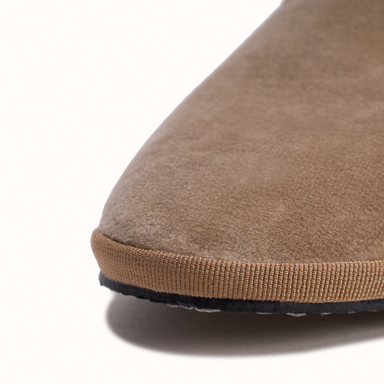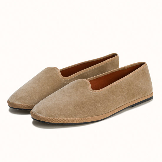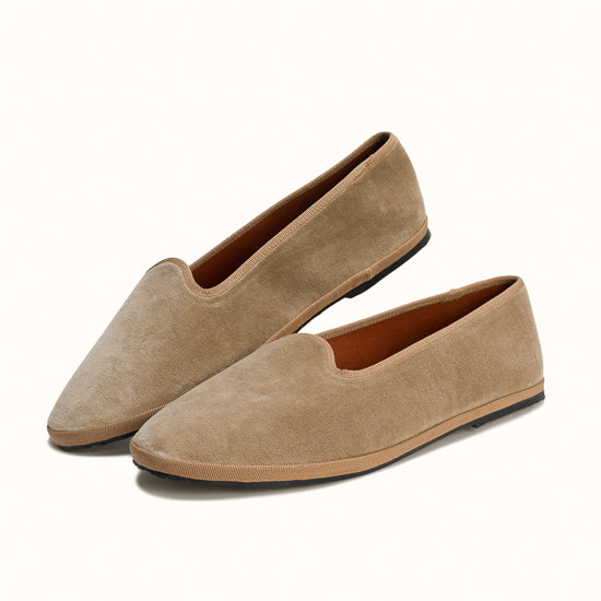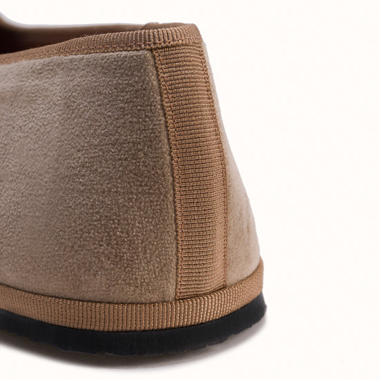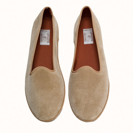 Friulane in camel velvet with light brown grosgrain edging.