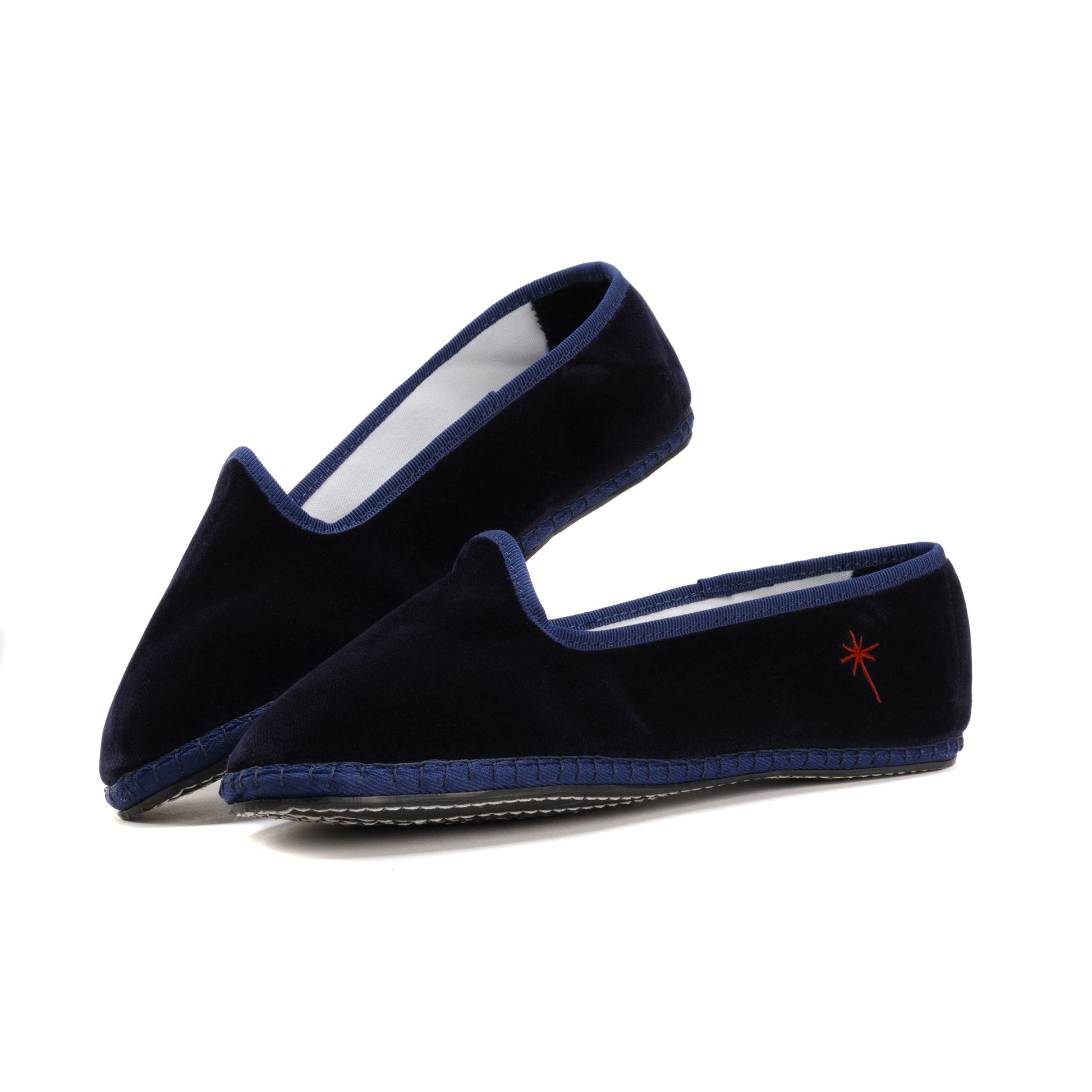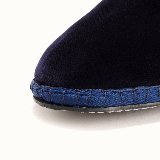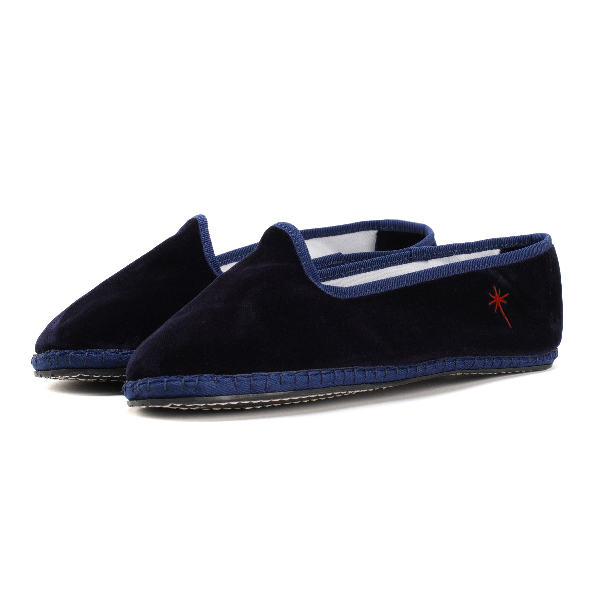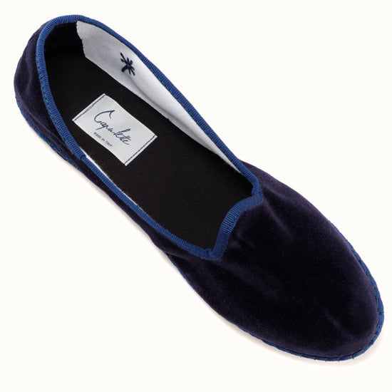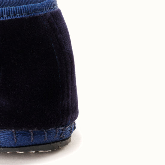 Friulane made according to the Venetian tradition in navy blue velvet and tone on tone grosgrain. The outer sole is made of bicycle tire and the inner sole is made of cotton. Can be worn inside or outside!