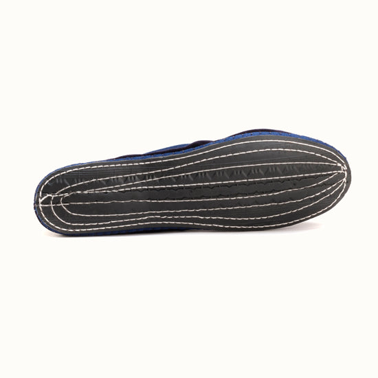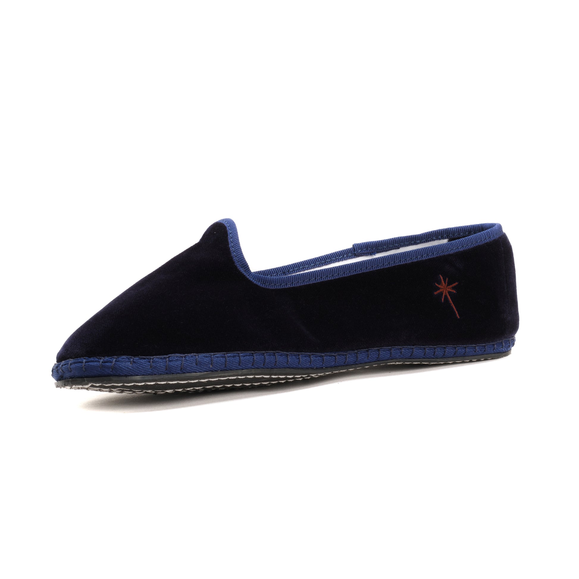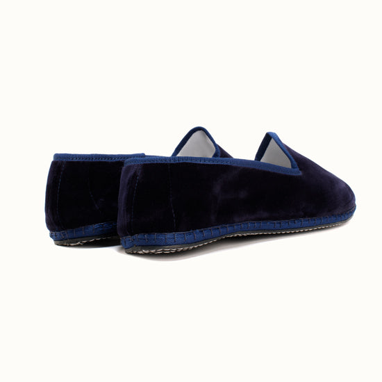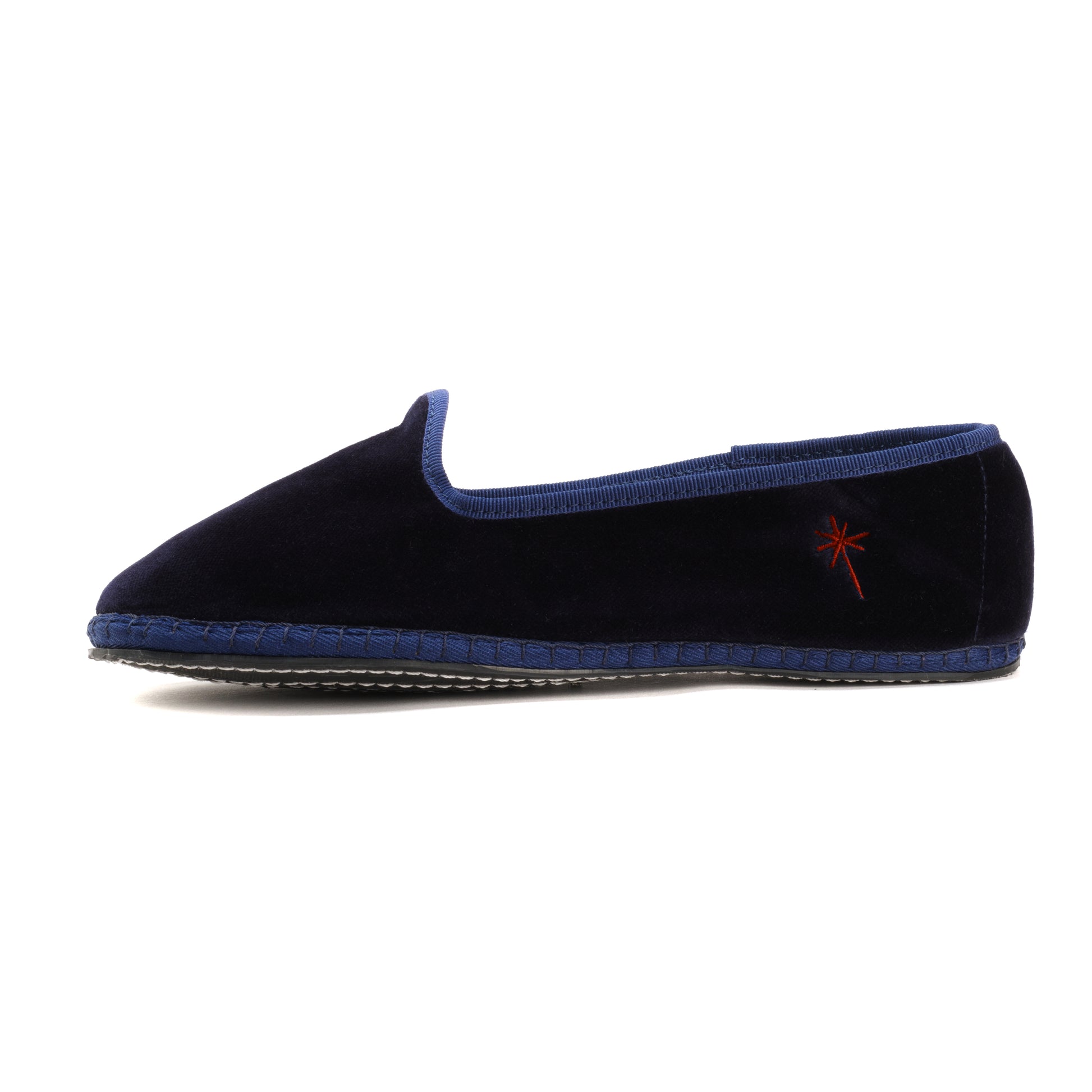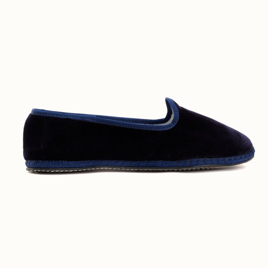Friulane made according to the Venetian tradition in navy blue velvet and tone on tone grosgrain. The outer sole is made of bicycle tire and the inner sole is made of cotton. Can be worn inside or outside!