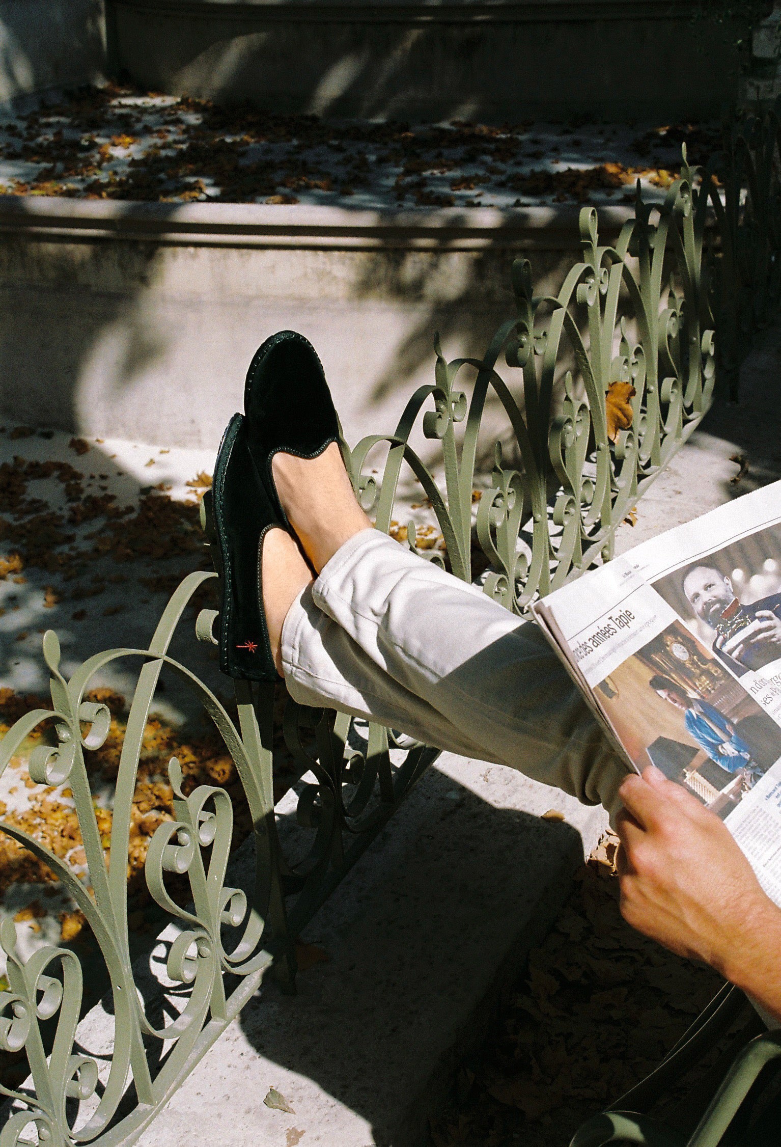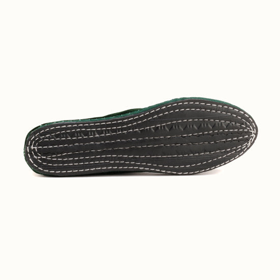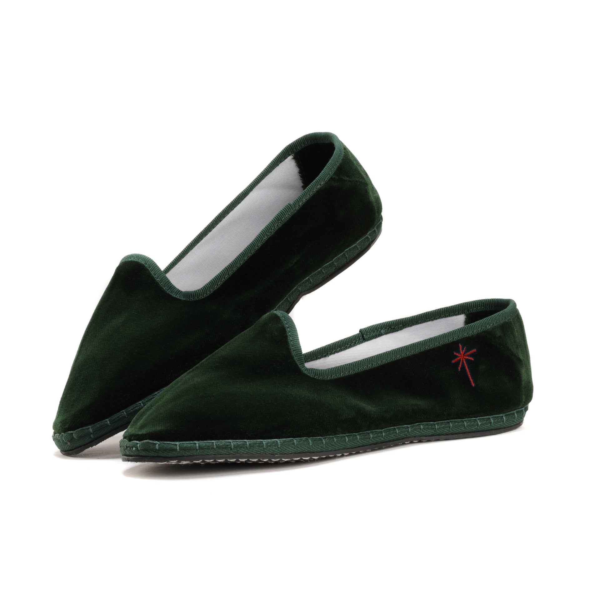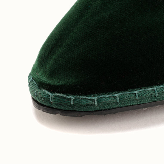 Friulane made according to the Venetian tradition in forest green velvet and tone on tone grosgrain. The outer sole is made of bicycle tire and the inner sole is made of cotton. Can be worn inside or outside!