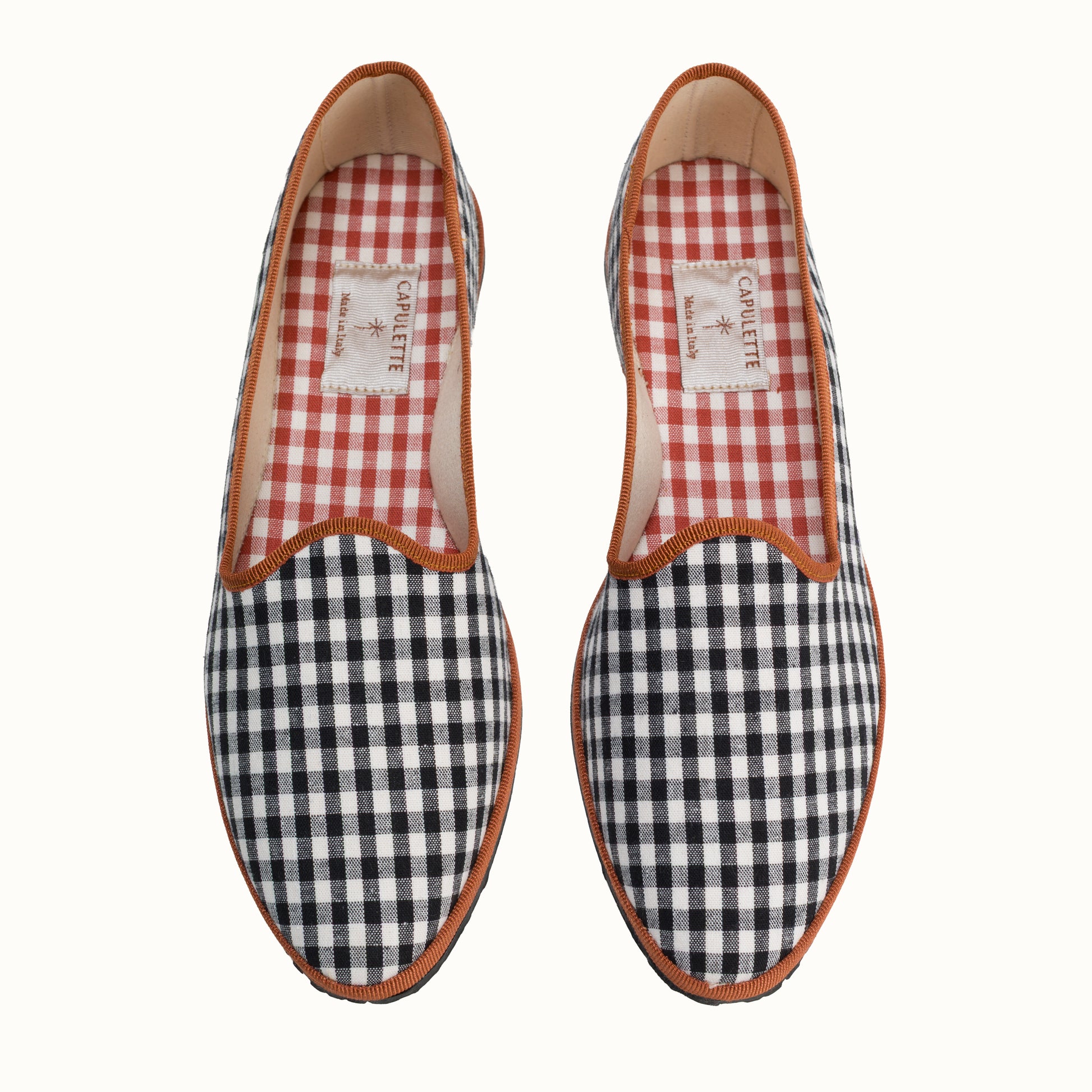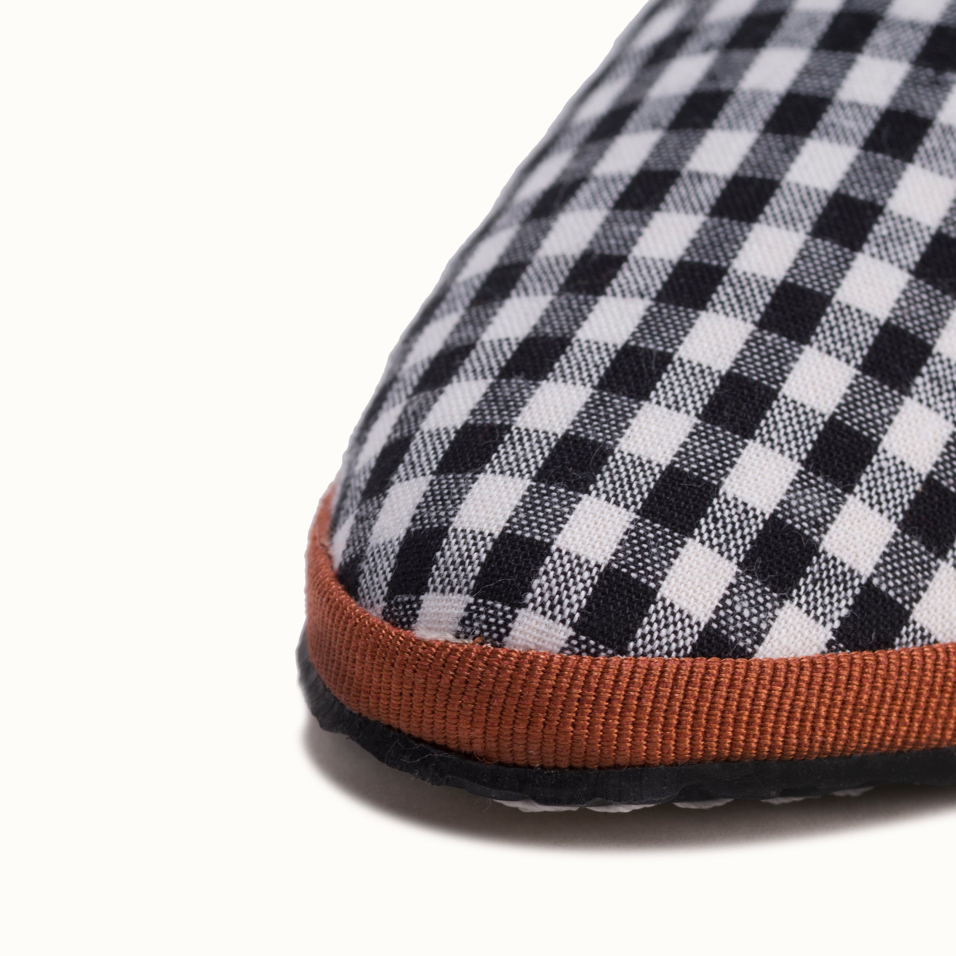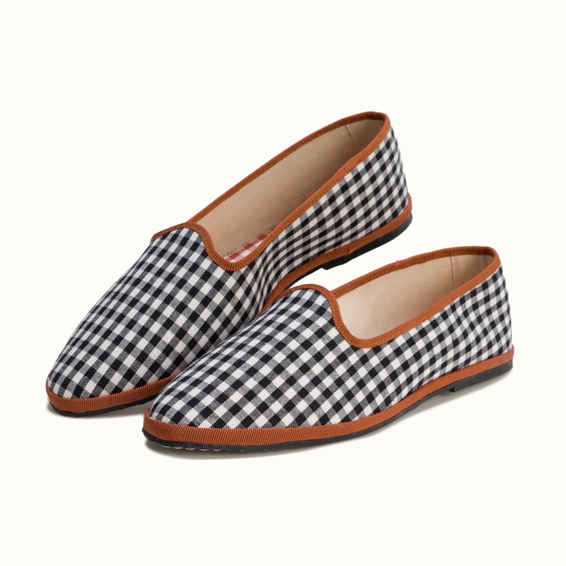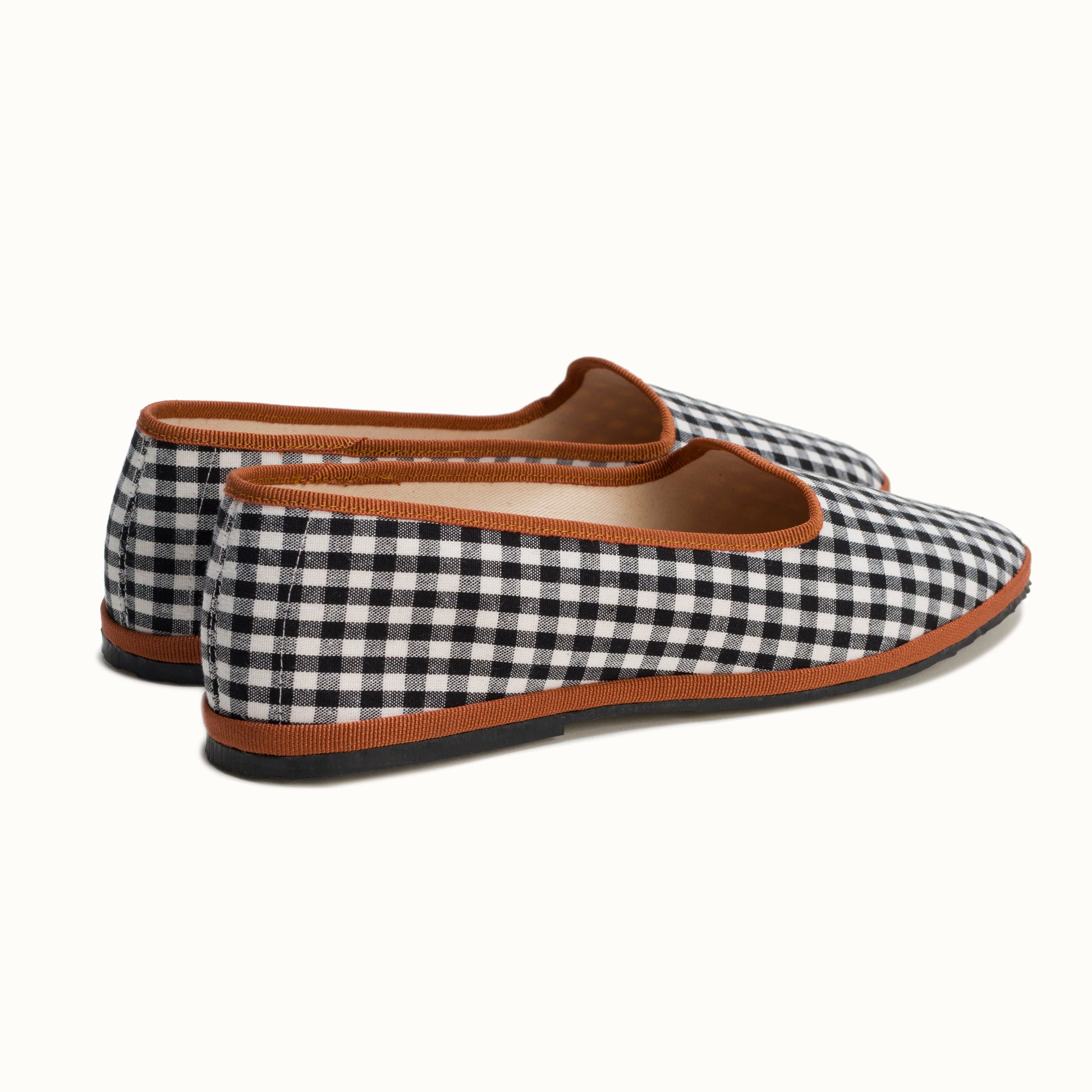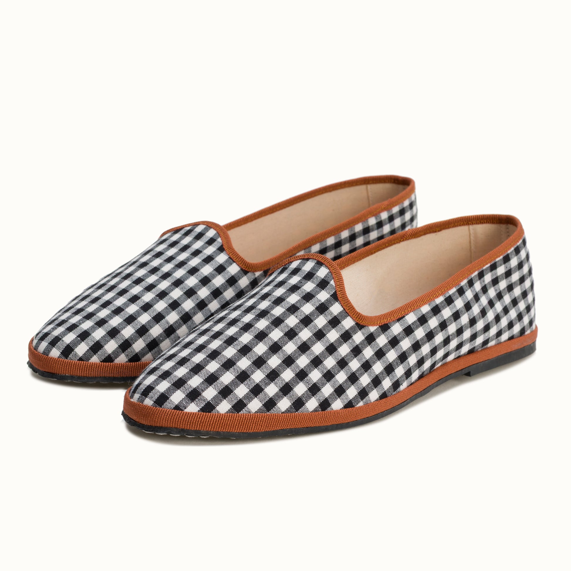 La semelle intérieure est en coton vichy terracotta et la semelle extérieure est en gomme à résistance renforcée.