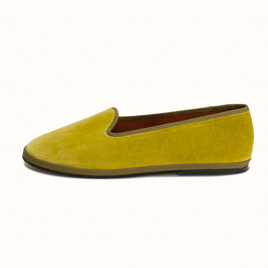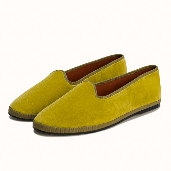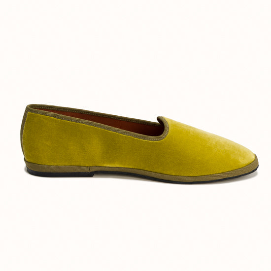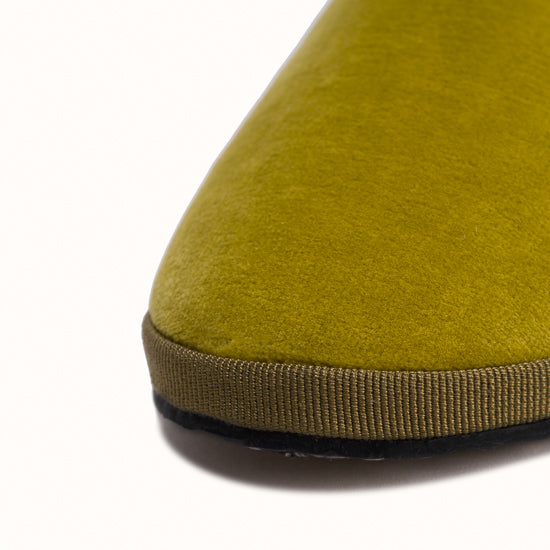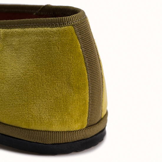 Friulane en velours vert pistache et rebords en gros grain ton sur ton.