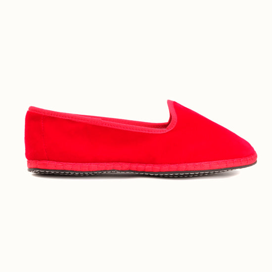 Friulane made according to the Venetian tradition in poppy red velvet and tone on tone grosgrain. The outer sole is made of bicycle tire and the inner sole is made of cotton. Can be worn inside or outside!
