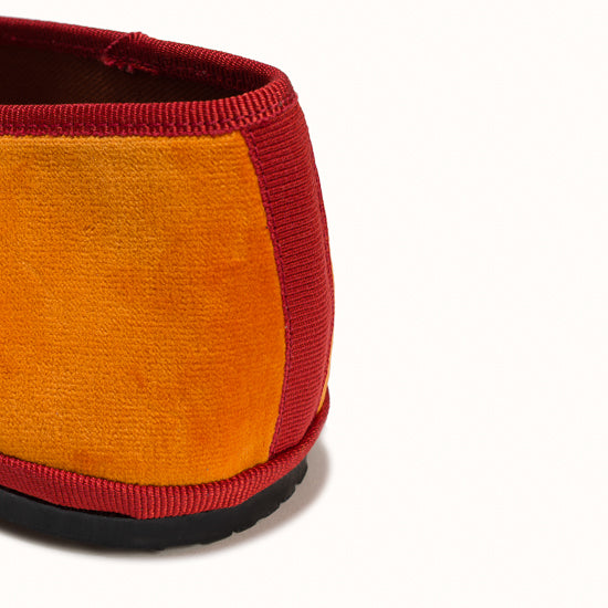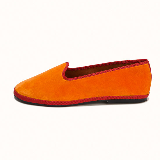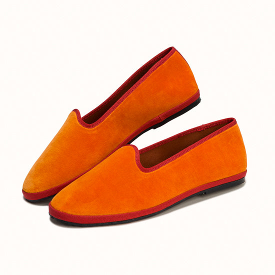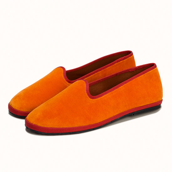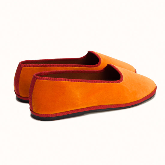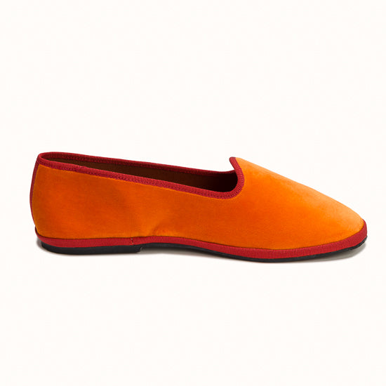 Friulane en velours tangerine et rebords en gros grain rouge brique.