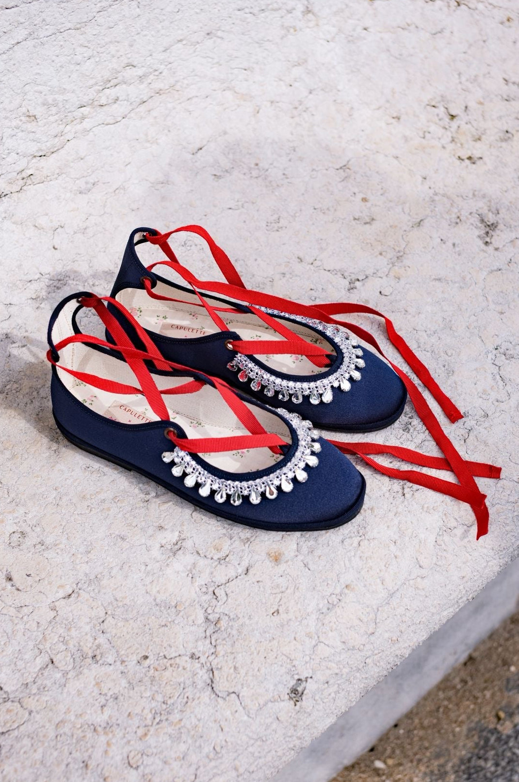 Ruban gros grain rouge.Semelle extérieure en gomme noire.