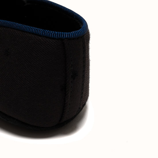 Black cotton with navy blue velvet stars. Navy blue grosgrain edges. Tightened on the sides with black elastic bands. Black leatherette insole. Rubber outsole.