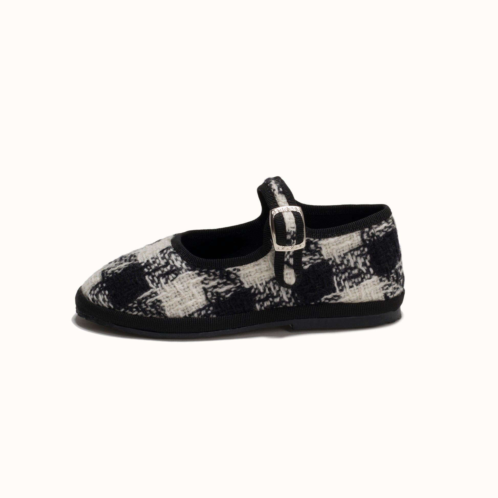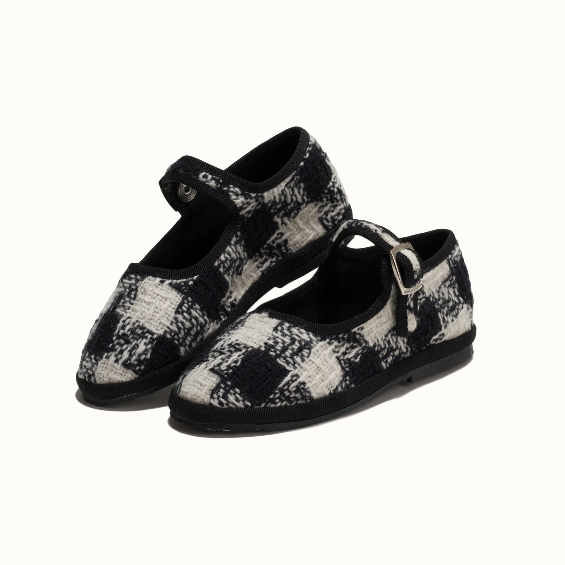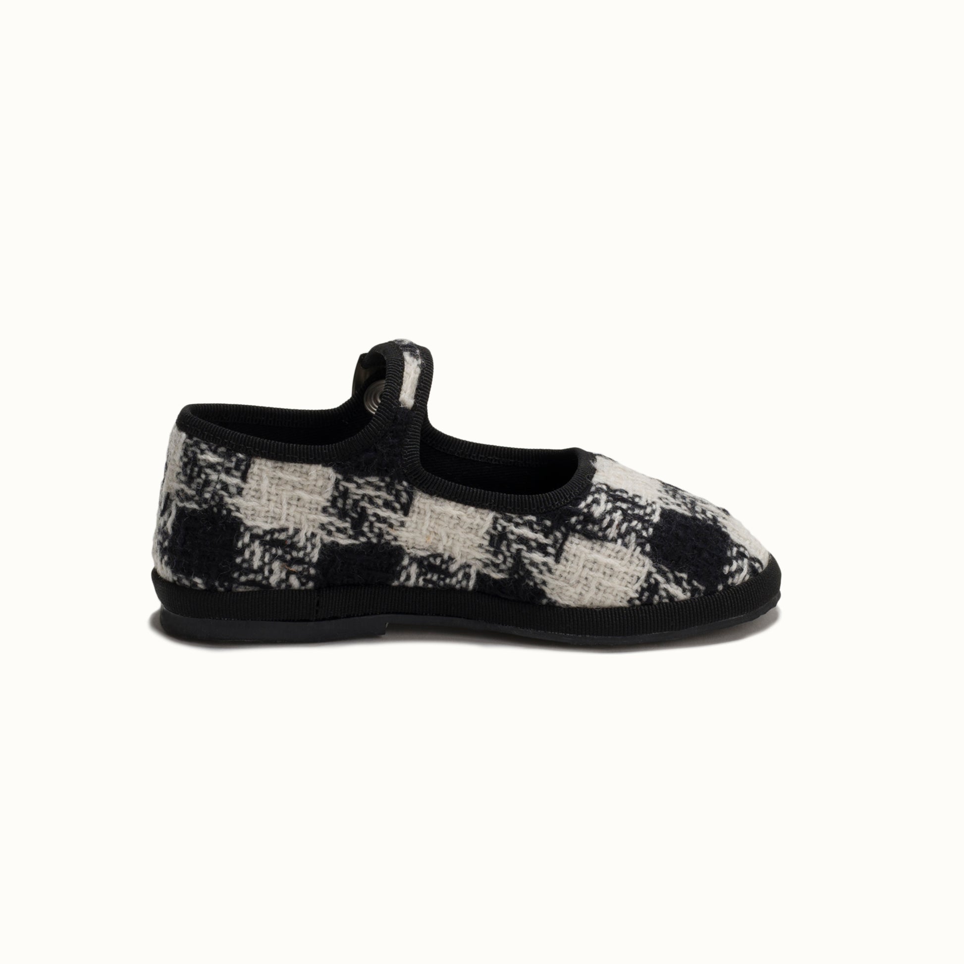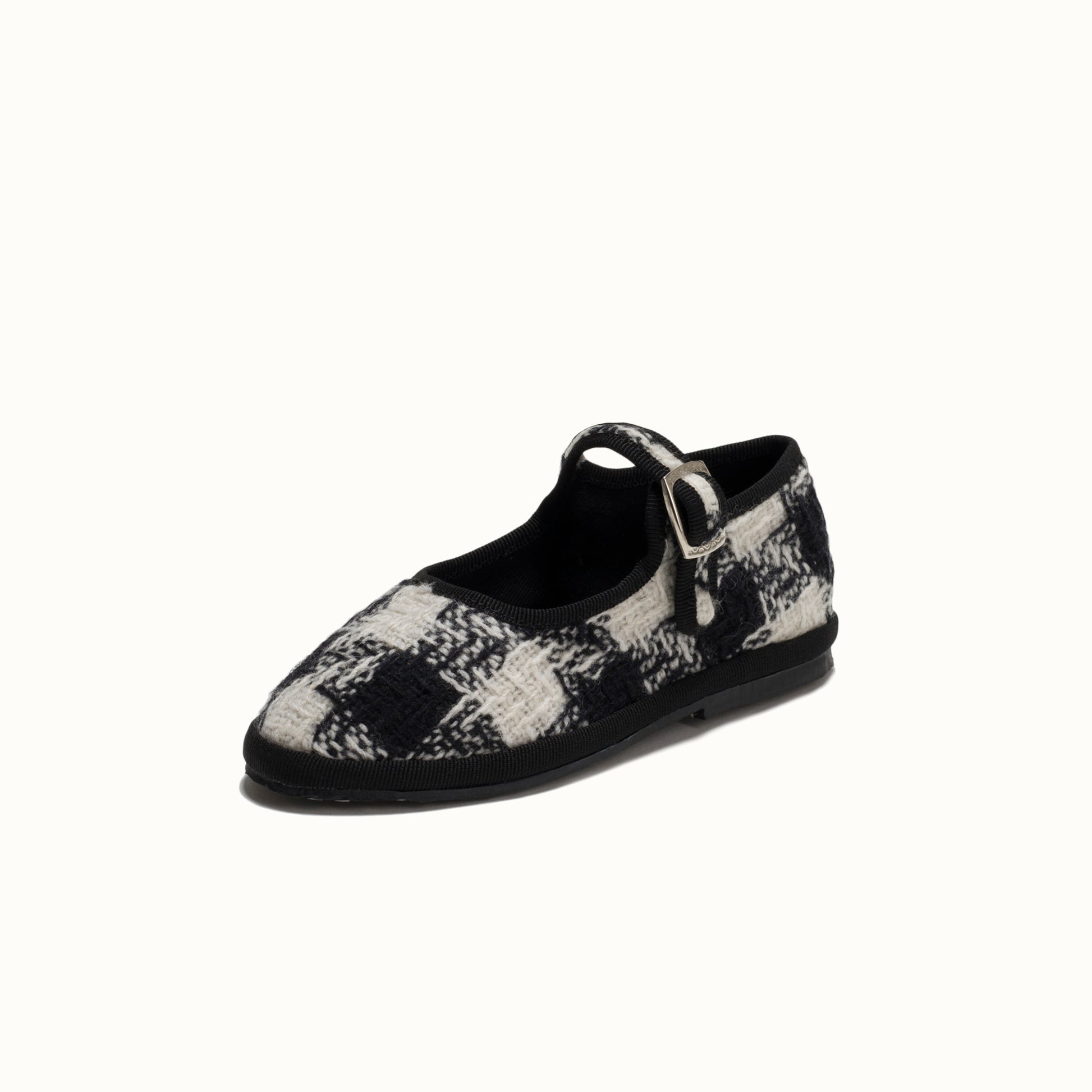 Maryjane in tweed with black and white houndstooth pattern.