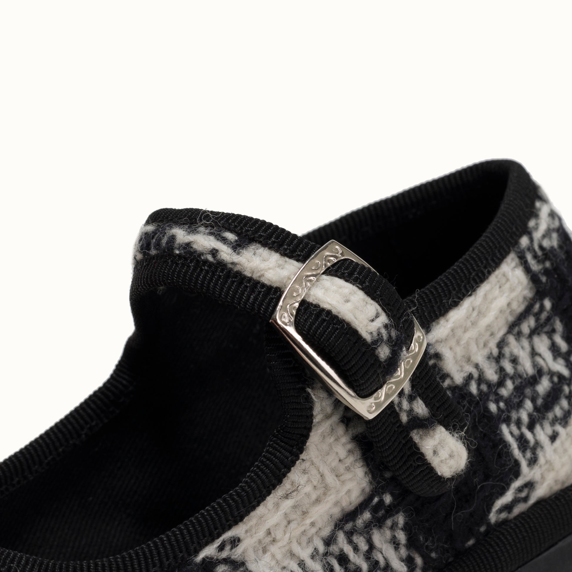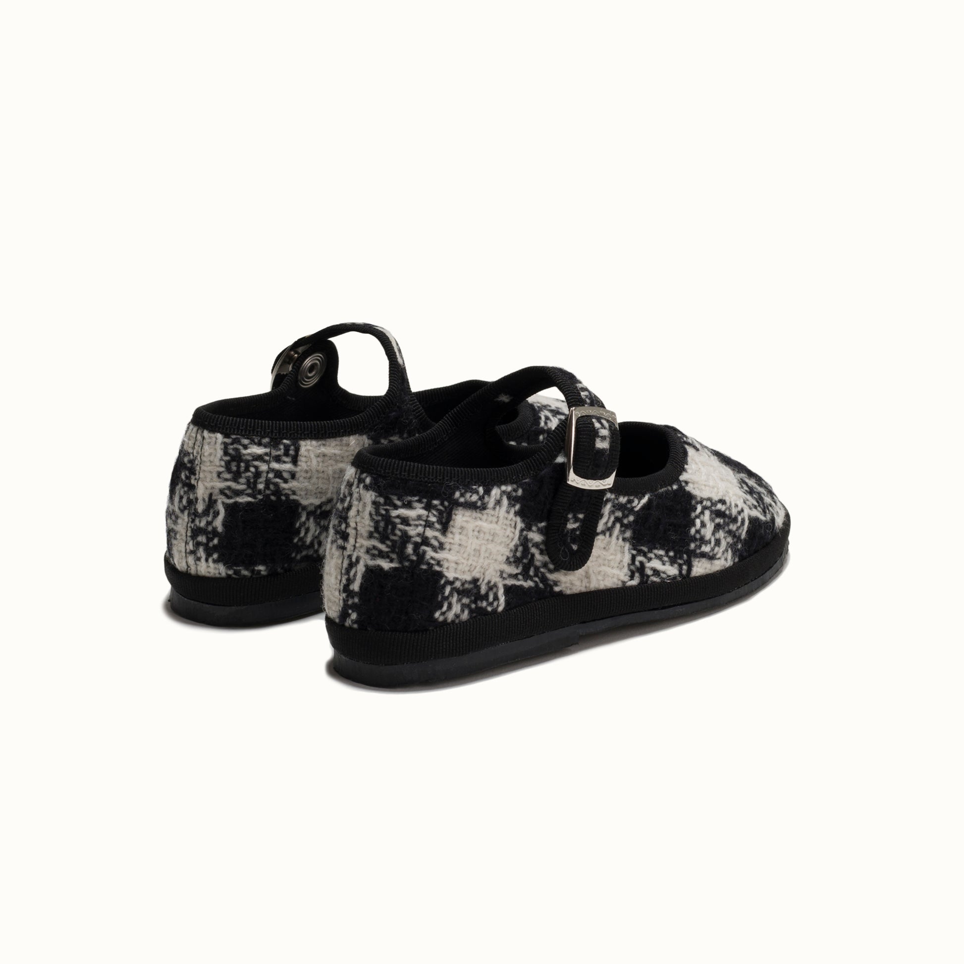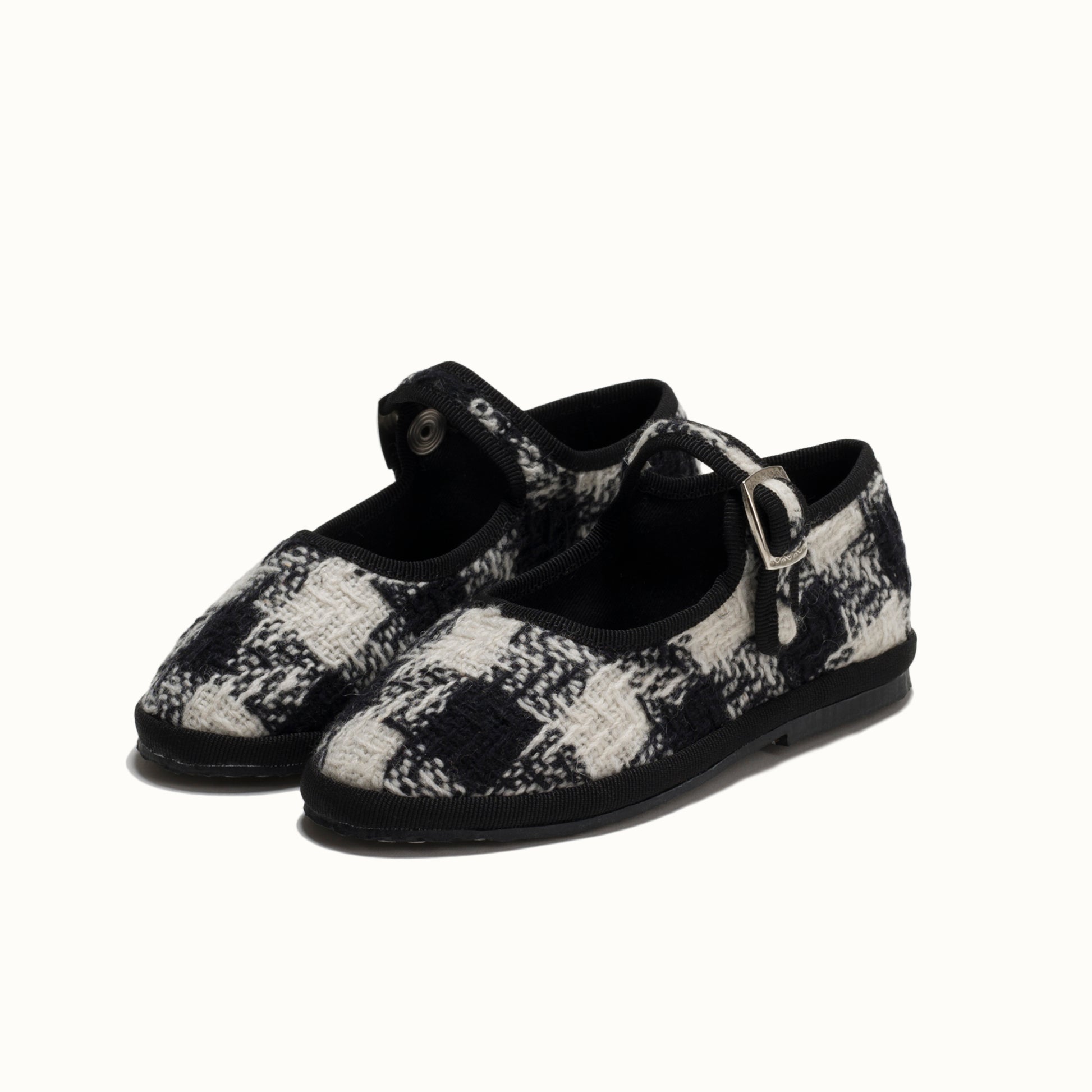 Maryjane in tweed with black and white houndstooth pattern.
