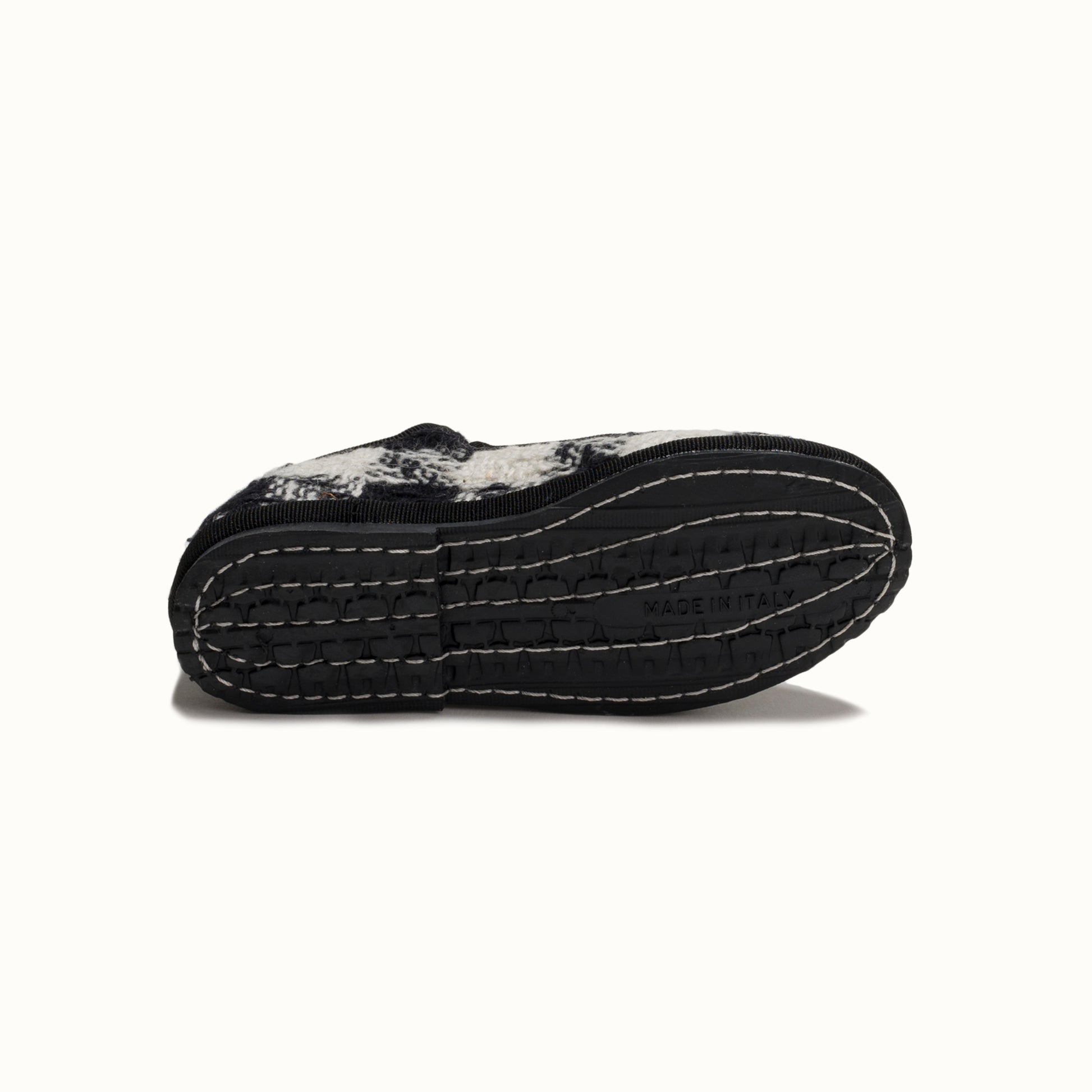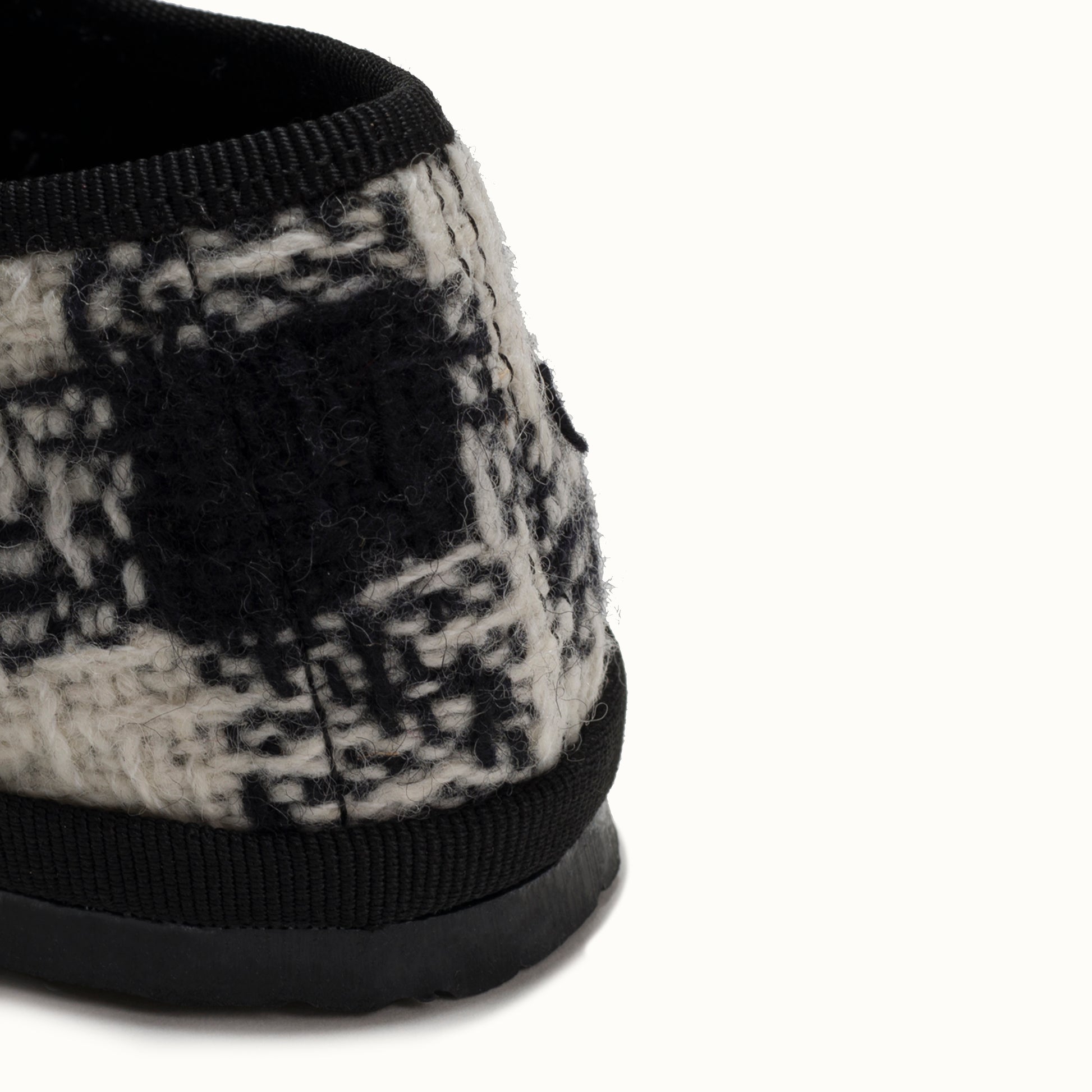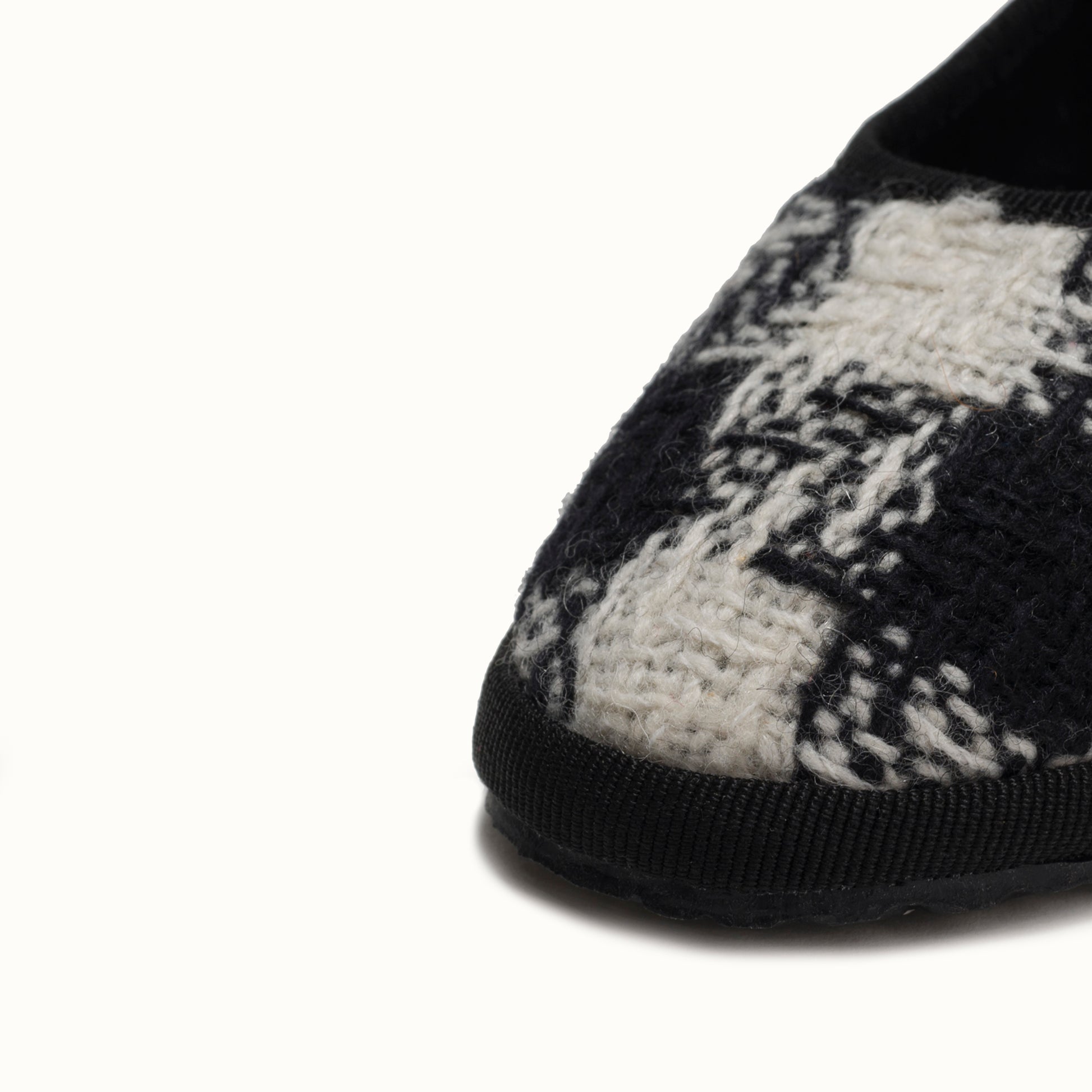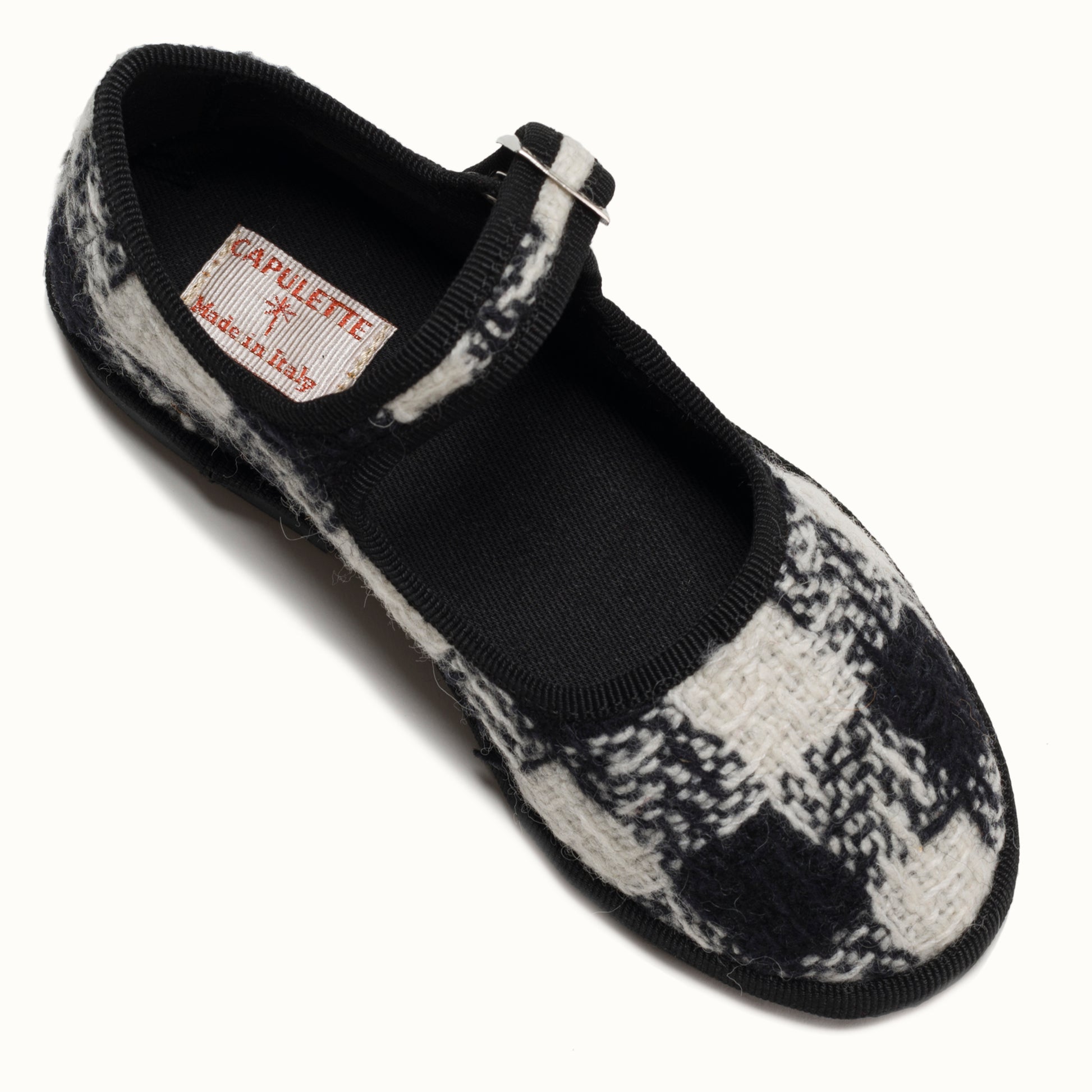 Maryjane in tweed with black and white houndstooth pattern.
