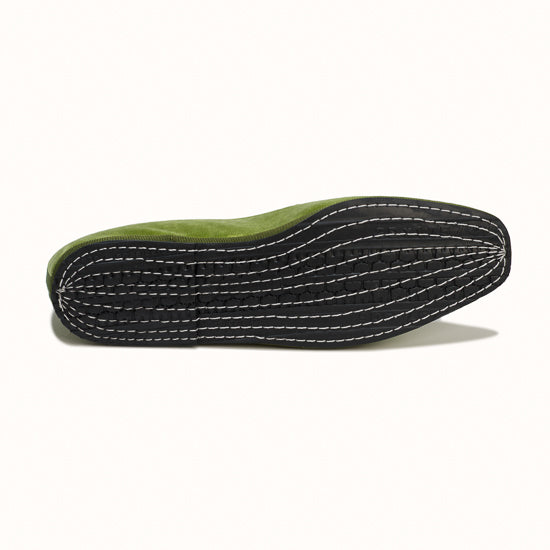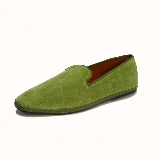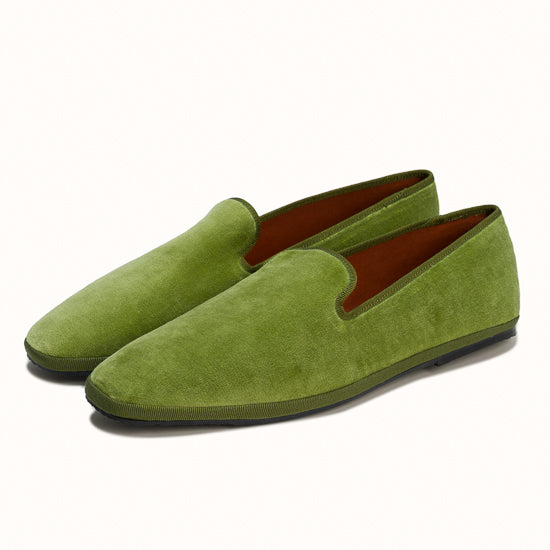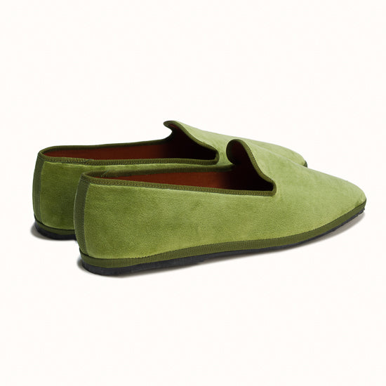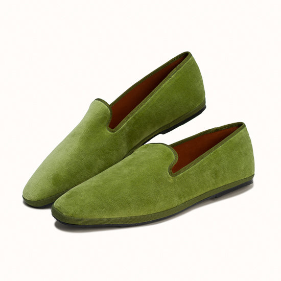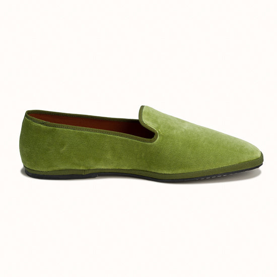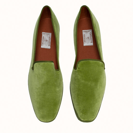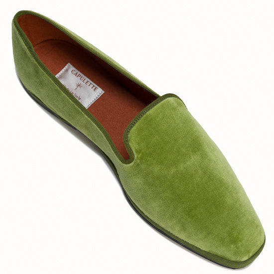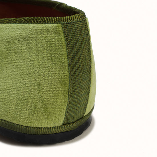 Marchesa en velours vert amande et rebords en gros grain vert olive.