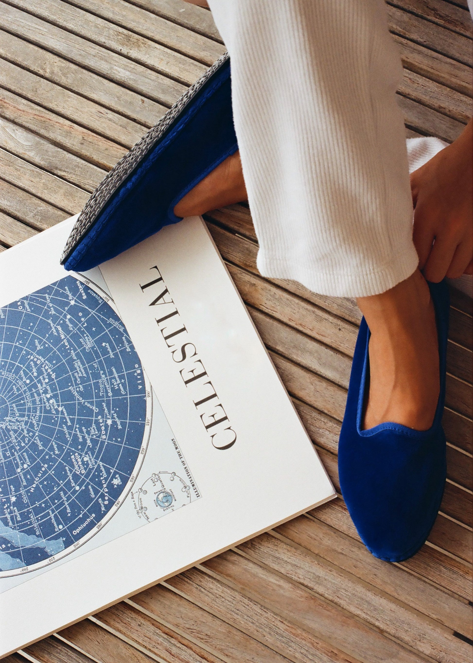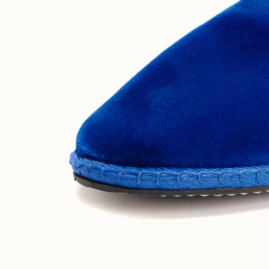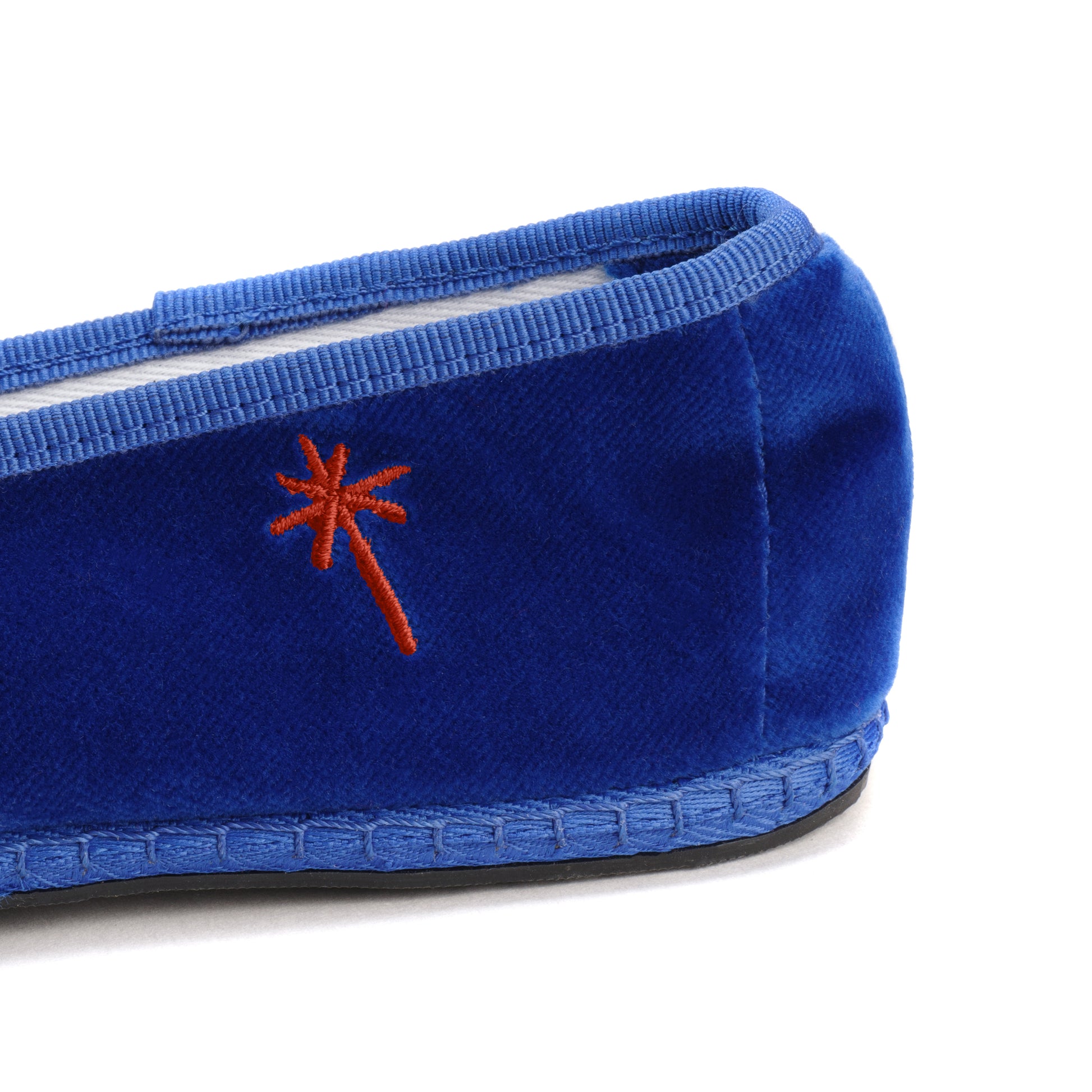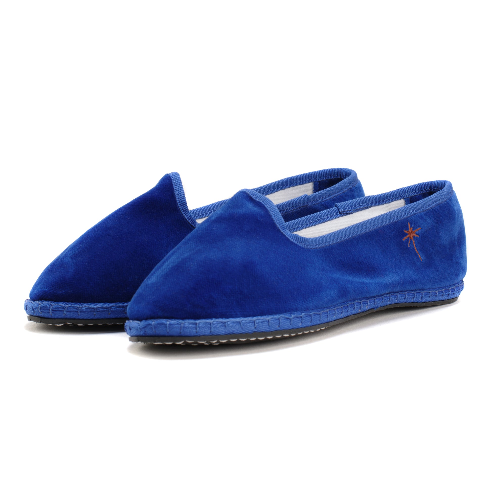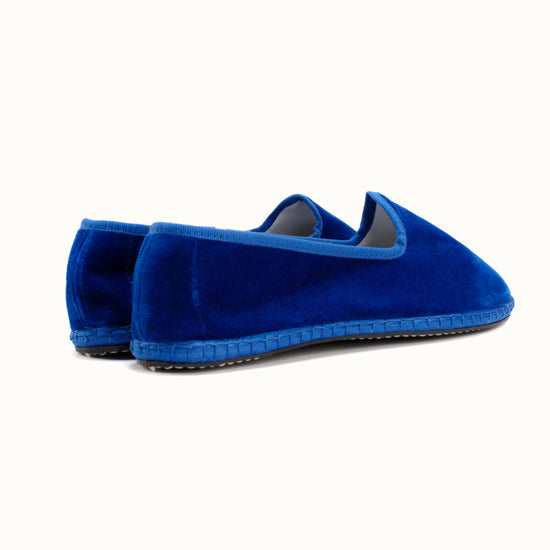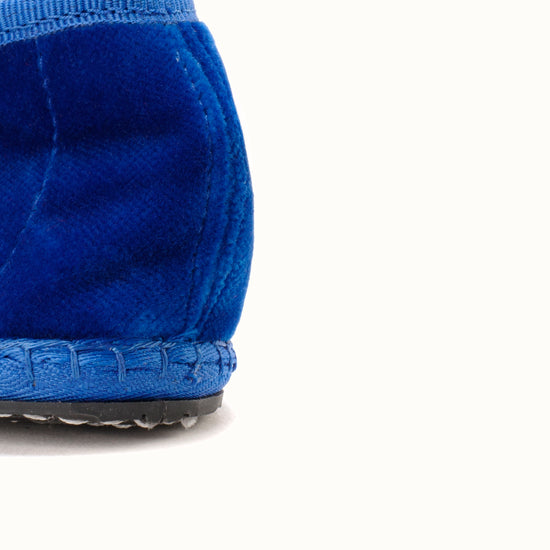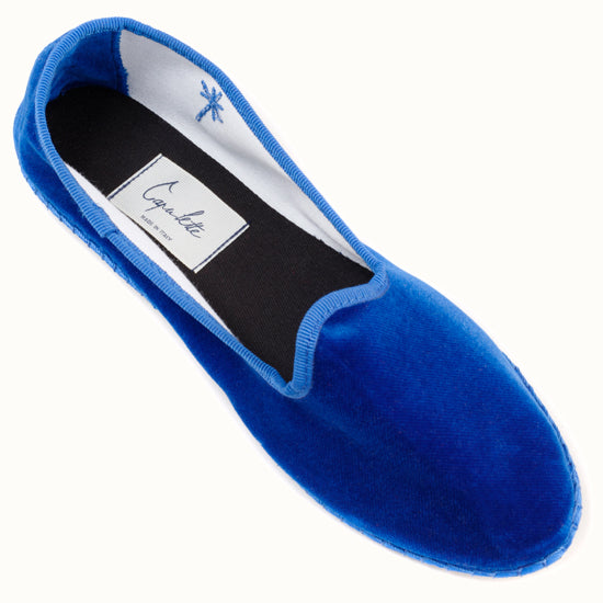 Friulane in royal blue velvet with tone-on-tone grosgrain edging.