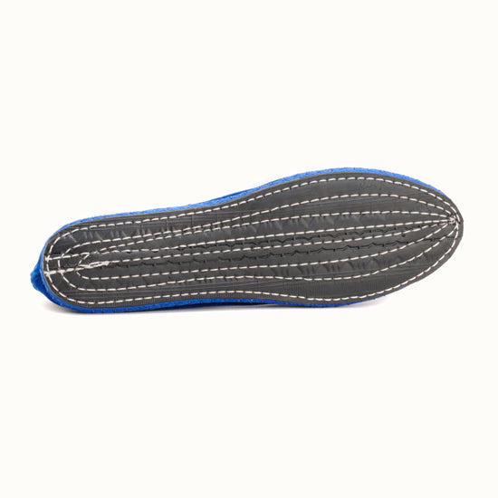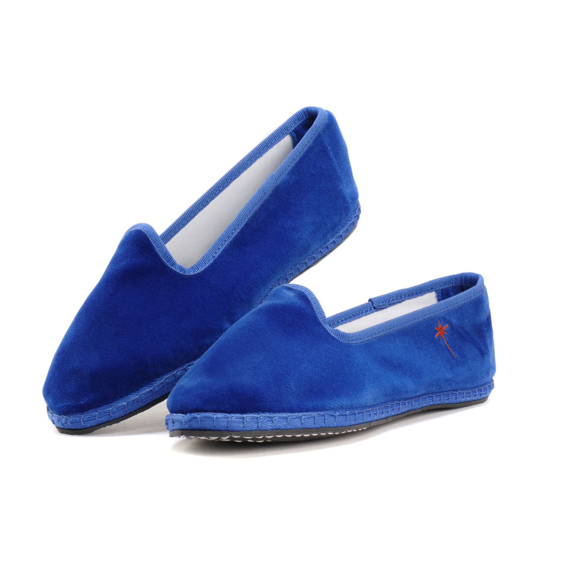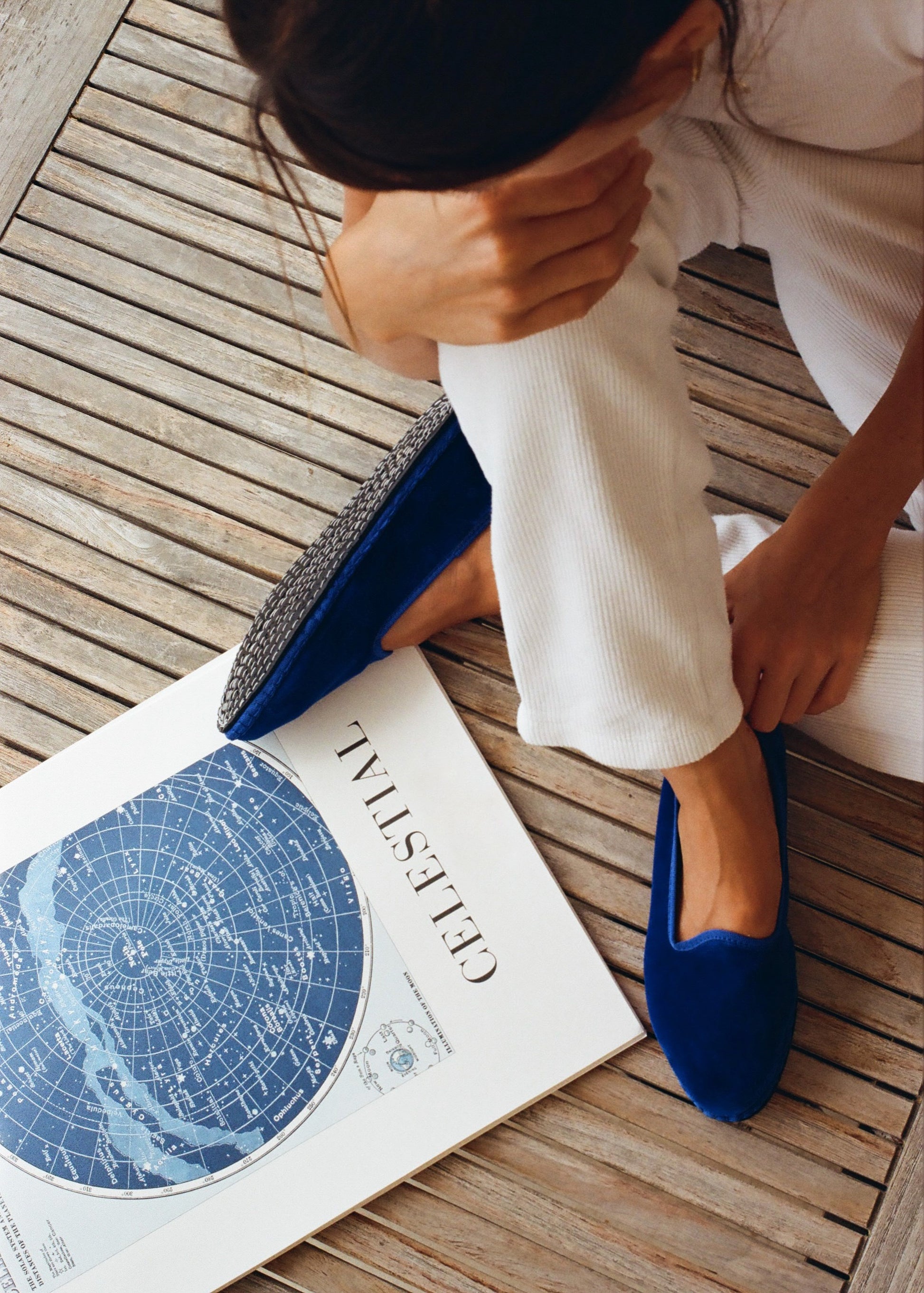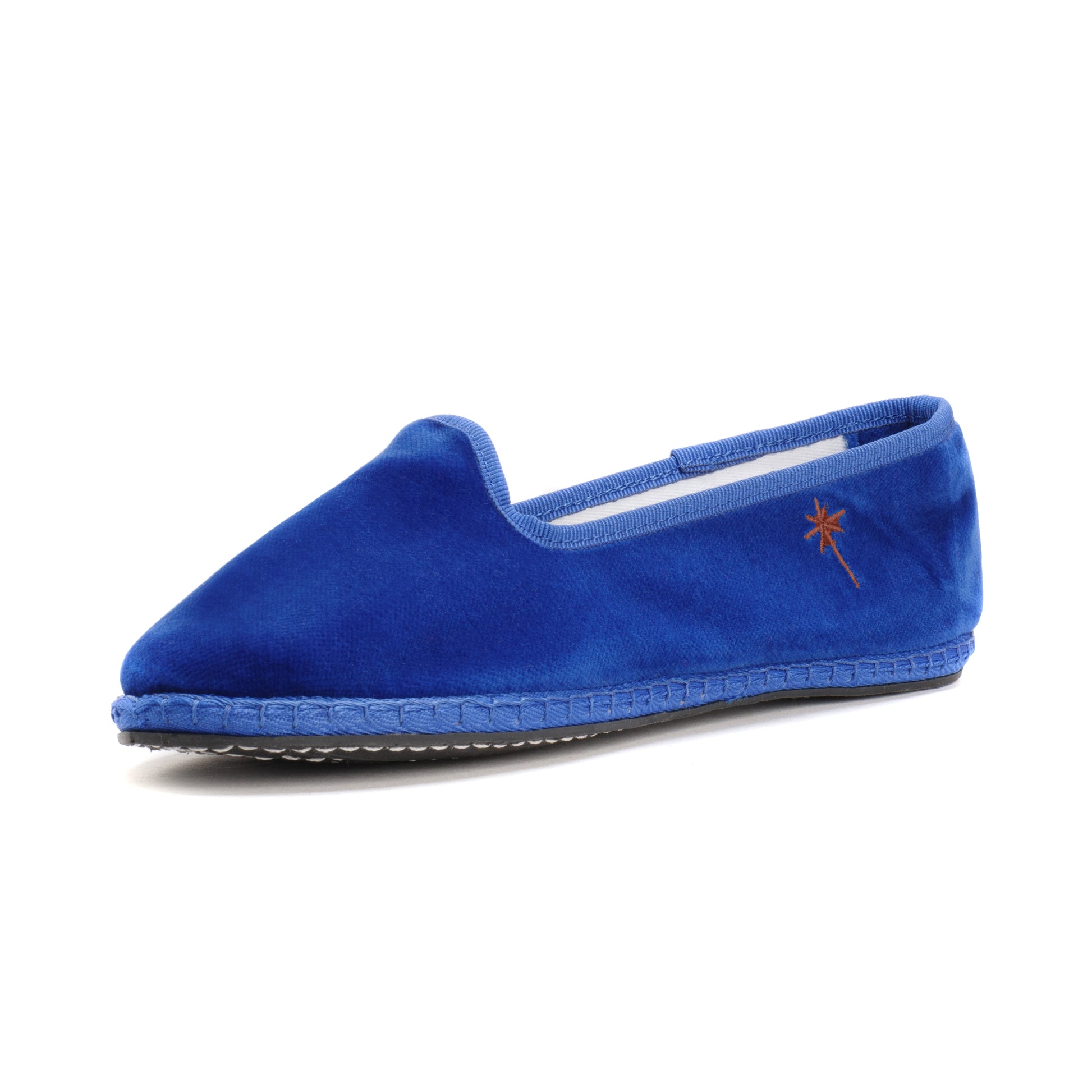Friulane in royal blue velvet with tone-on-tone grosgrain edging.