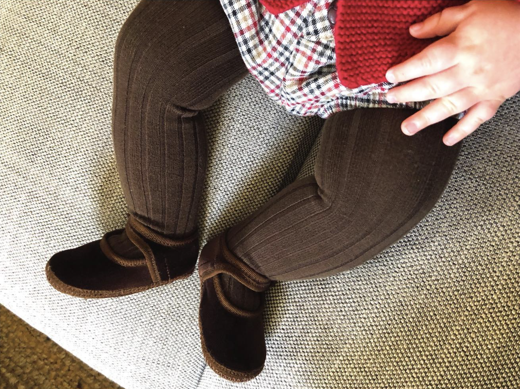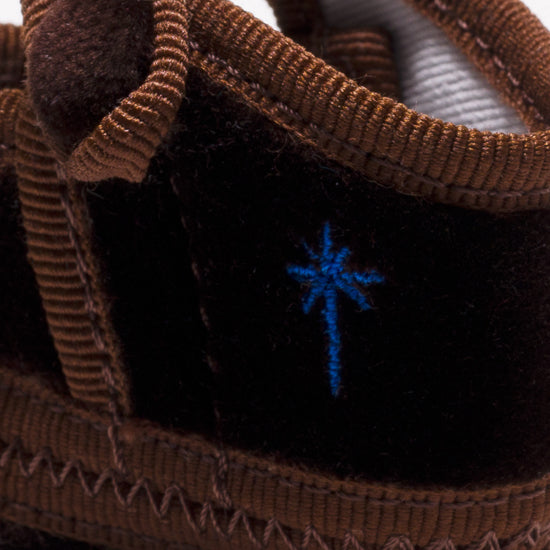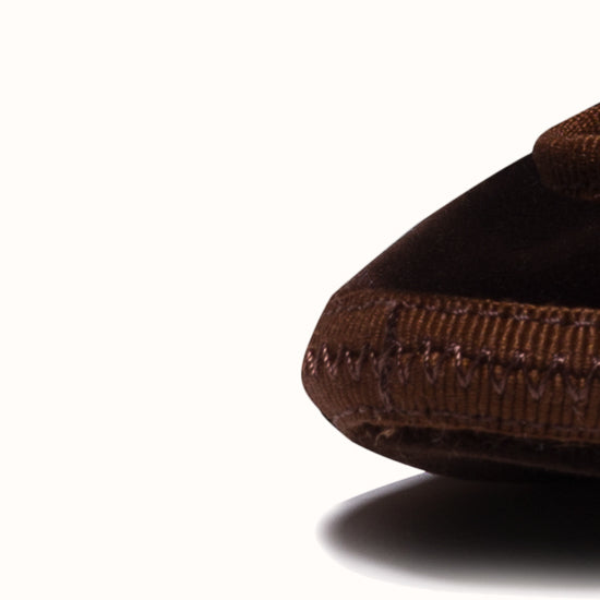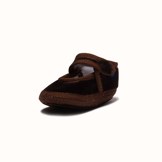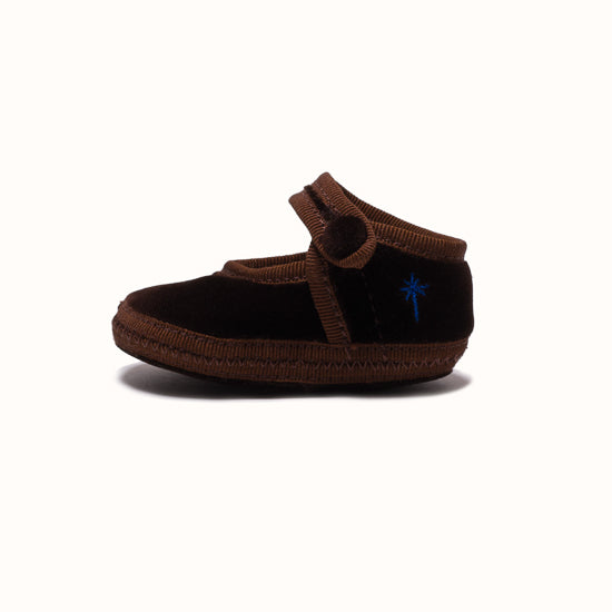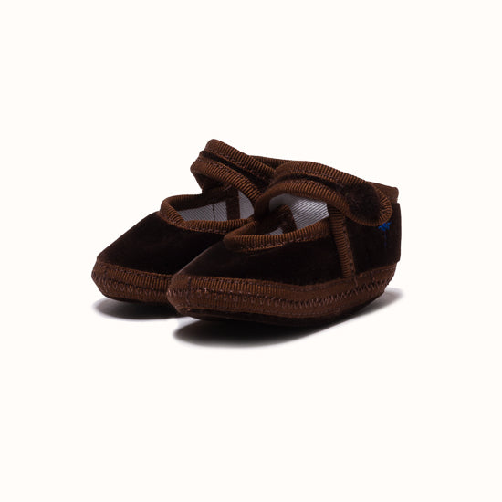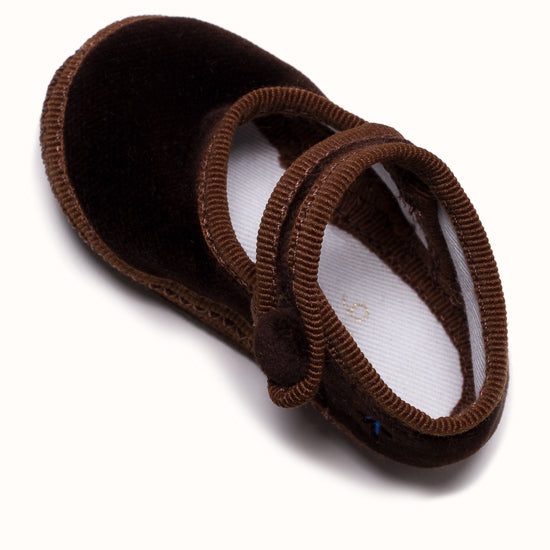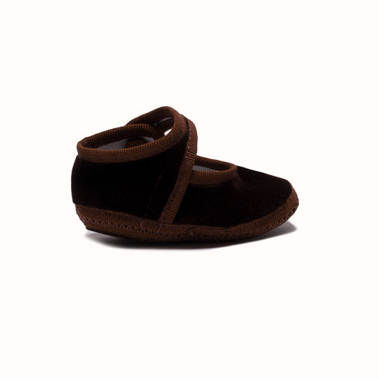 These little chocolate slippers are handmade in velvet and tone-on-tone grosgrain. Lined in white cotton with velvet button closure.
